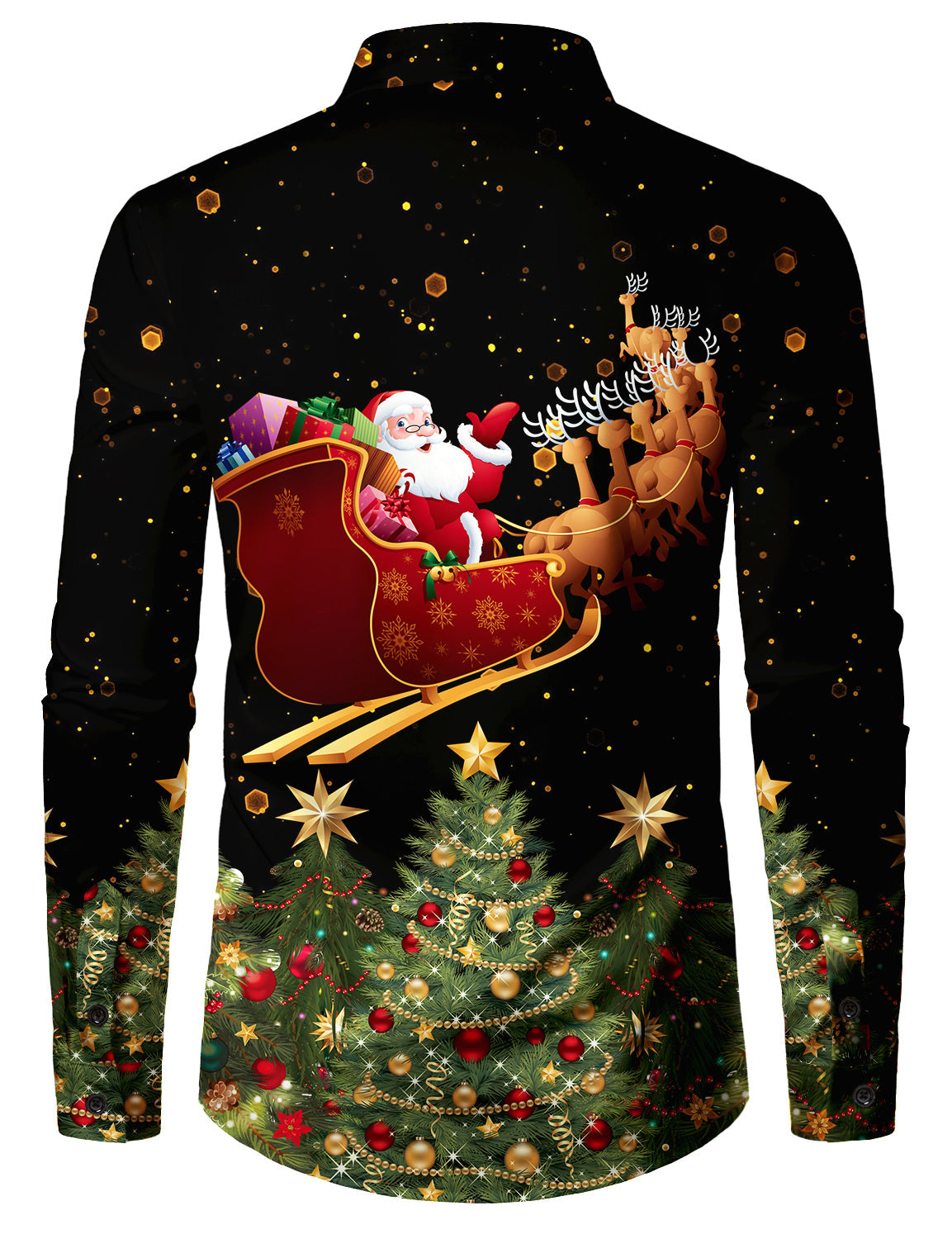 Men's Christmas Tree Elk Print Breathable Black Long Sleeve Shirt