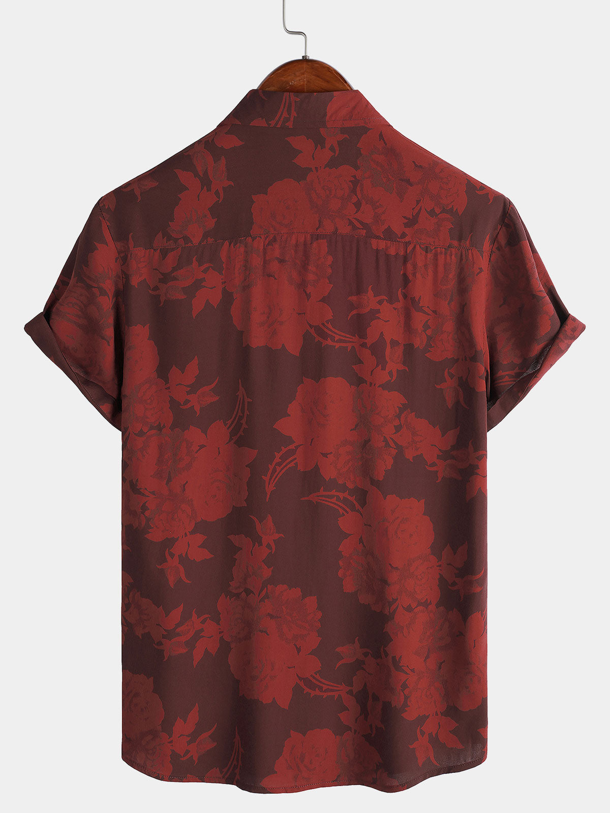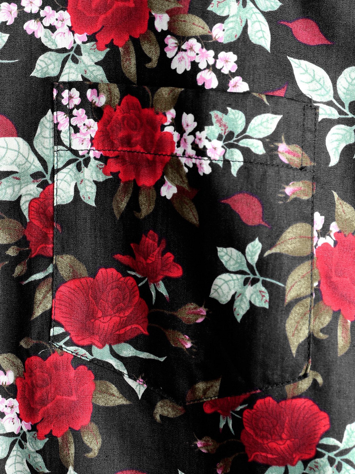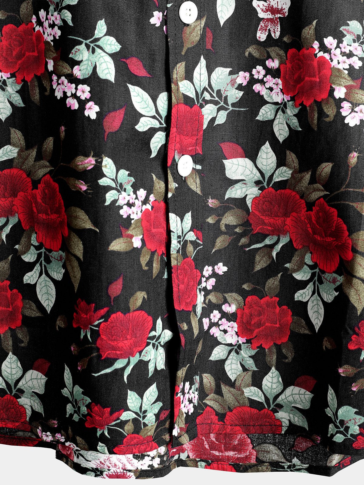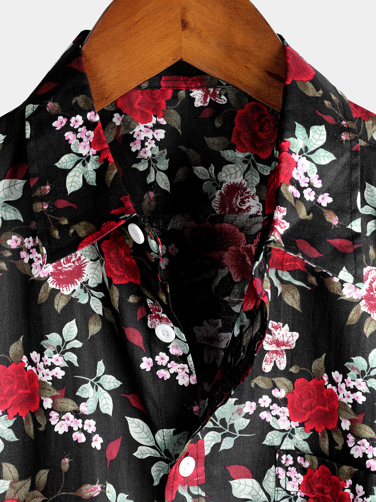 Men's Black Floral Holiday Rose Print Cotton Short Sleeve Shirt