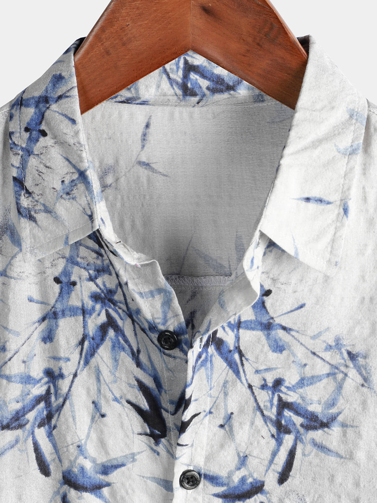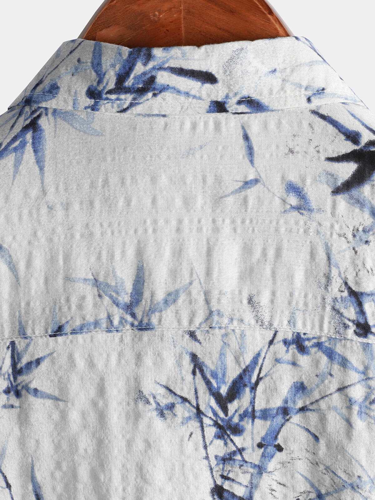 Men's Cotton Bamboo Art Print Button Summer Casual Short Sleeve Light Blue Hawaiian Shirt