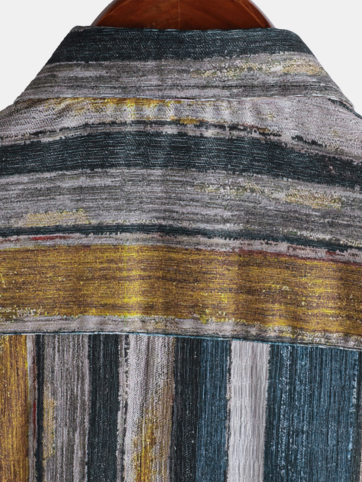 Men's Vintage Yellow And Blue Vertical Striped Button Up Pocket Short Sleeve Shirt