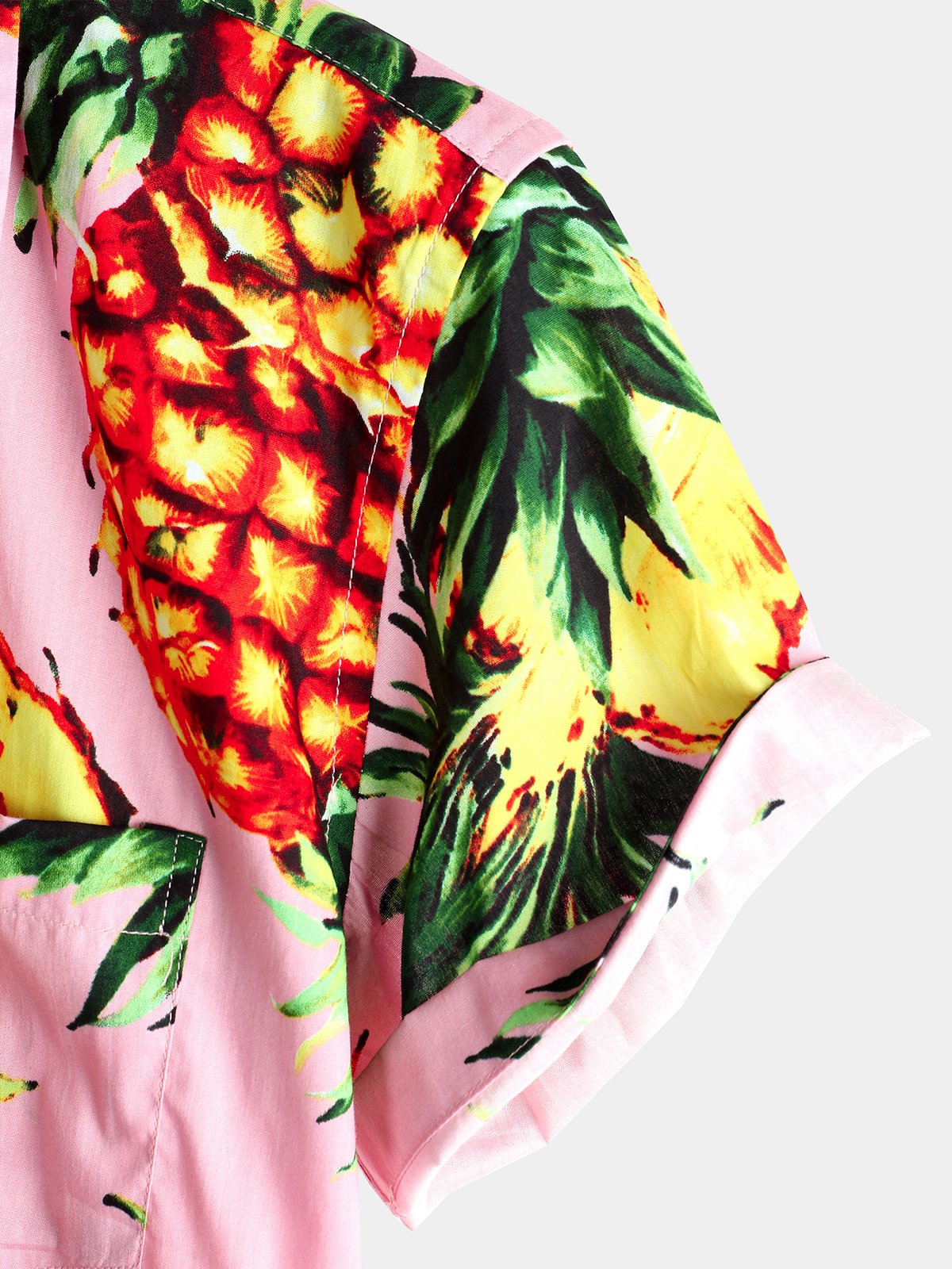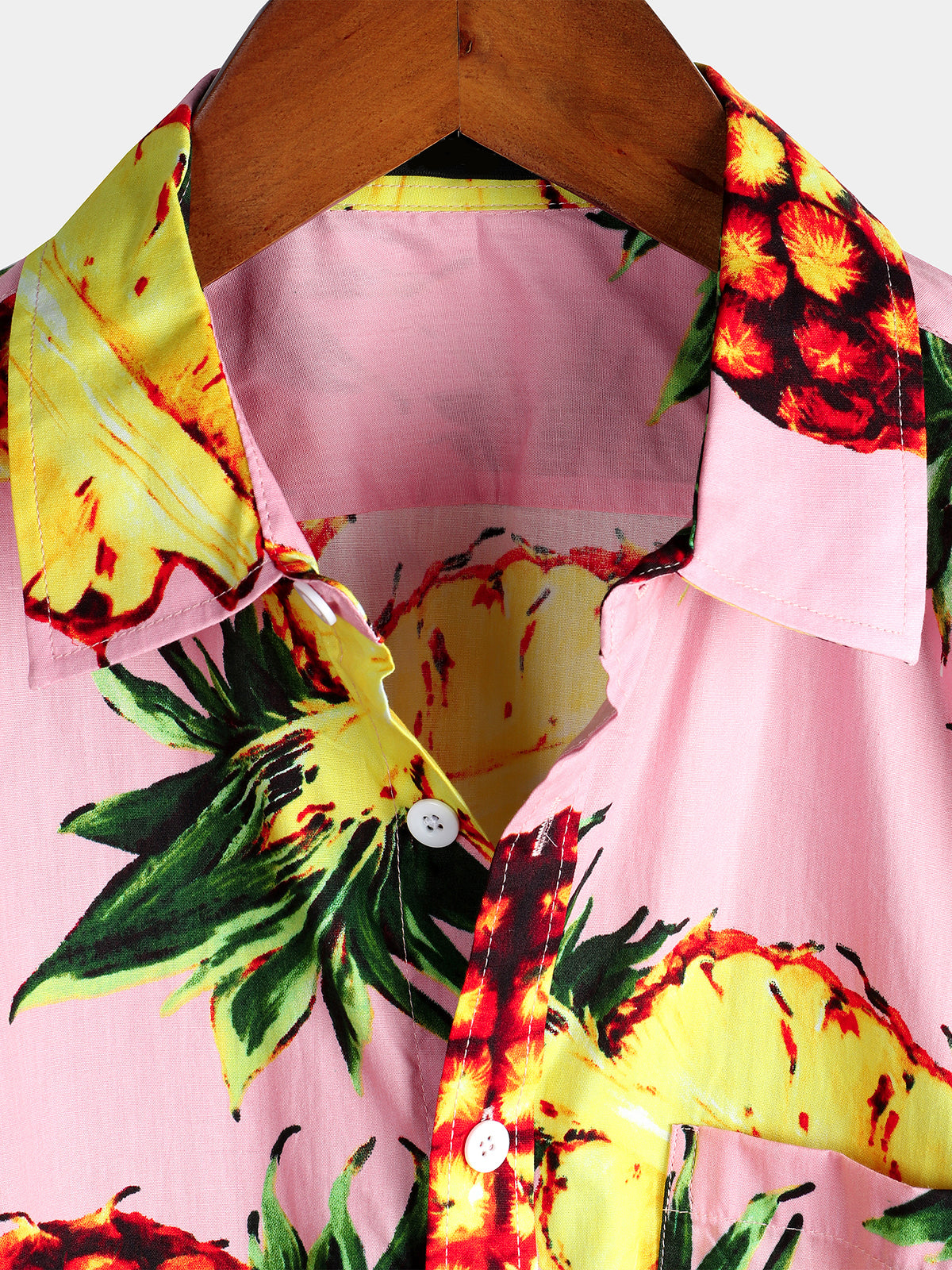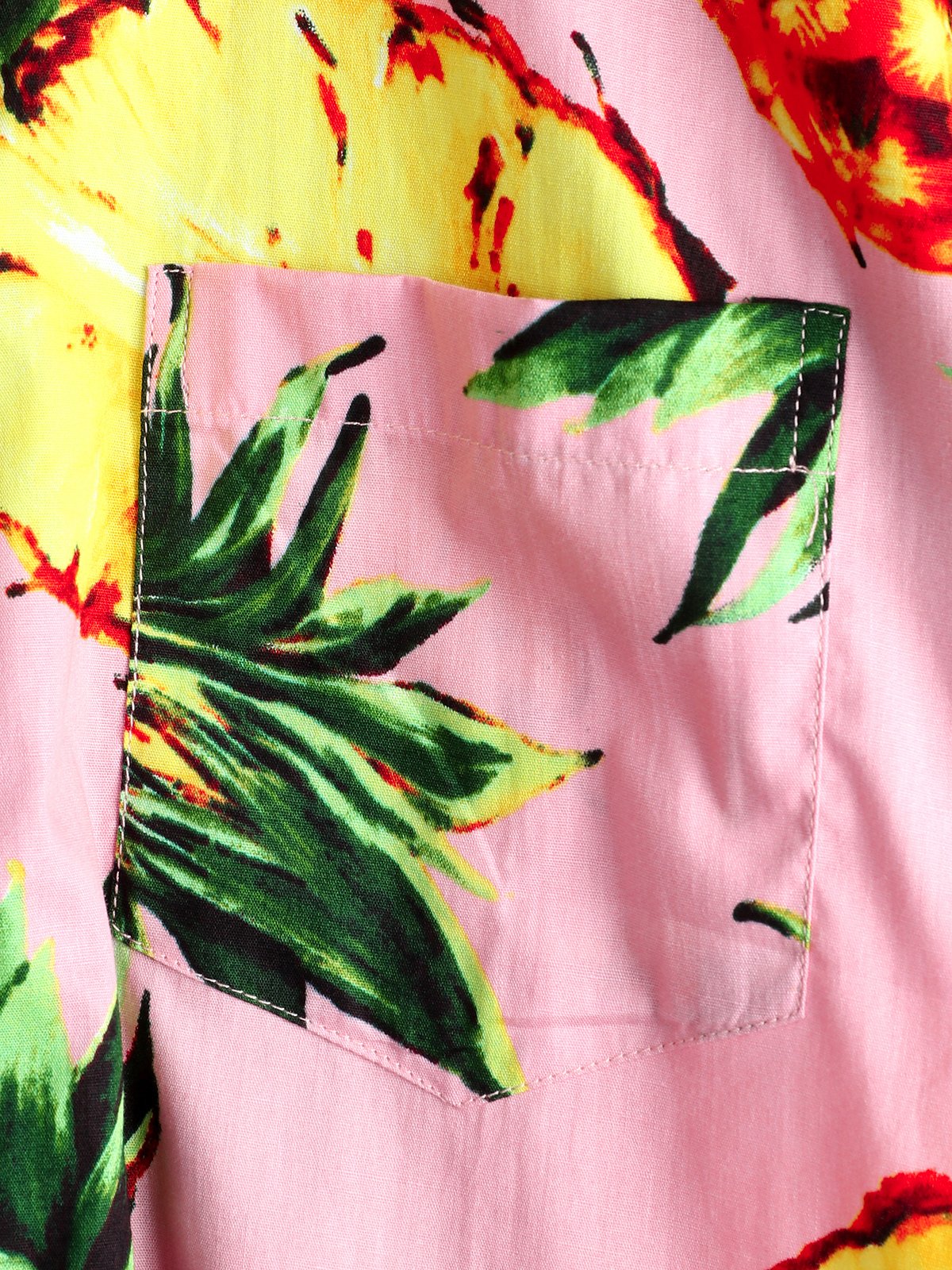 Men's Tropical Pineapple Holiday Pink Cotton Pocket Shirt