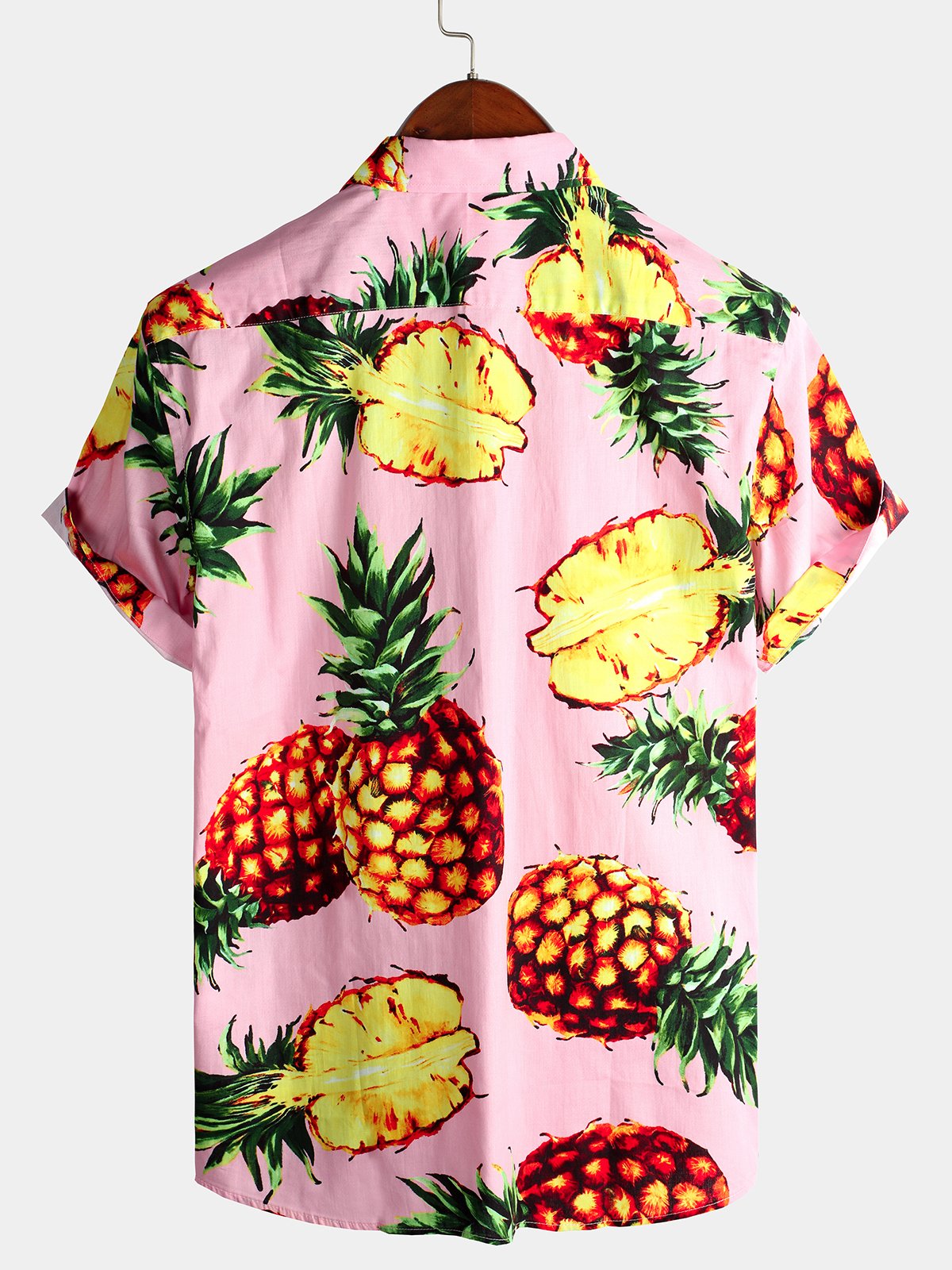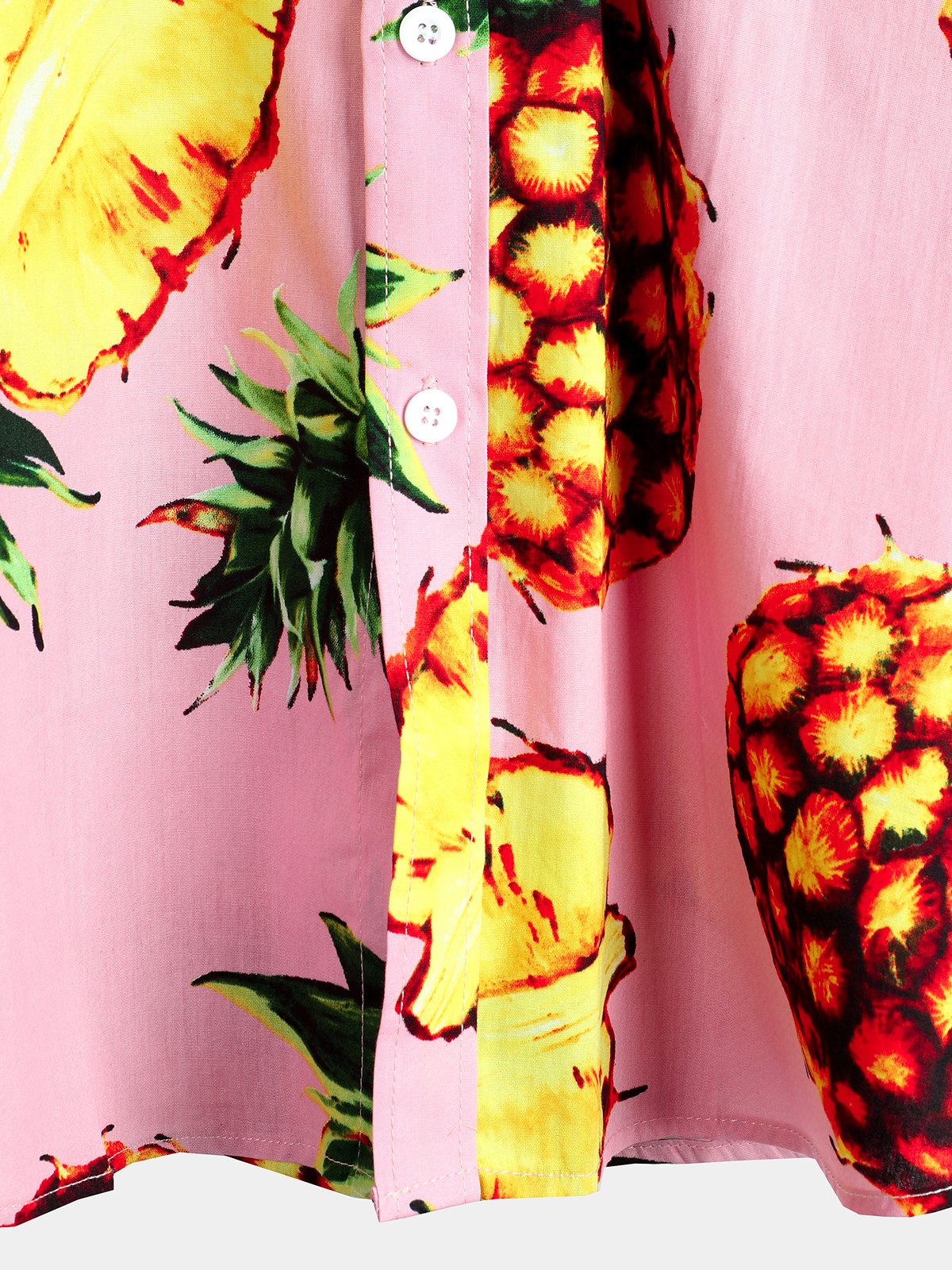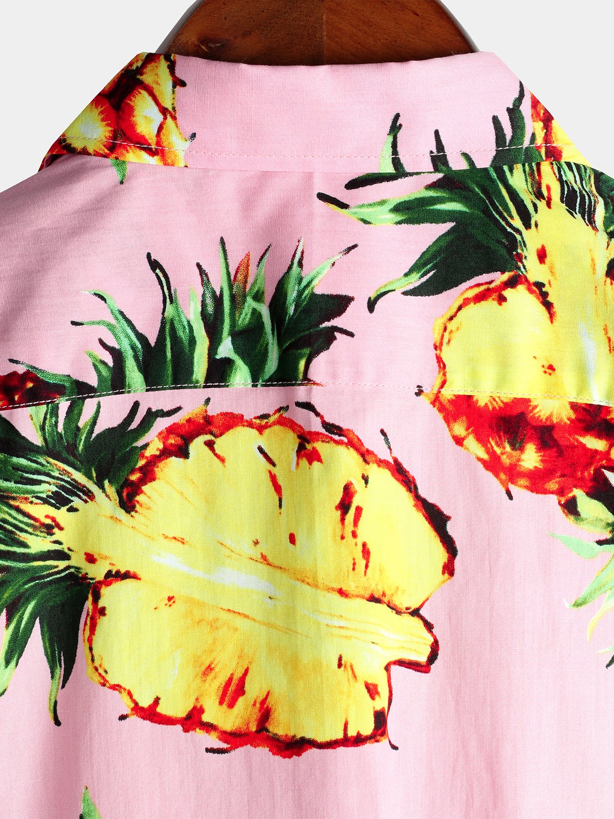 Men's Tropical Pineapple Holiday Pink Cotton Pocket Shirt