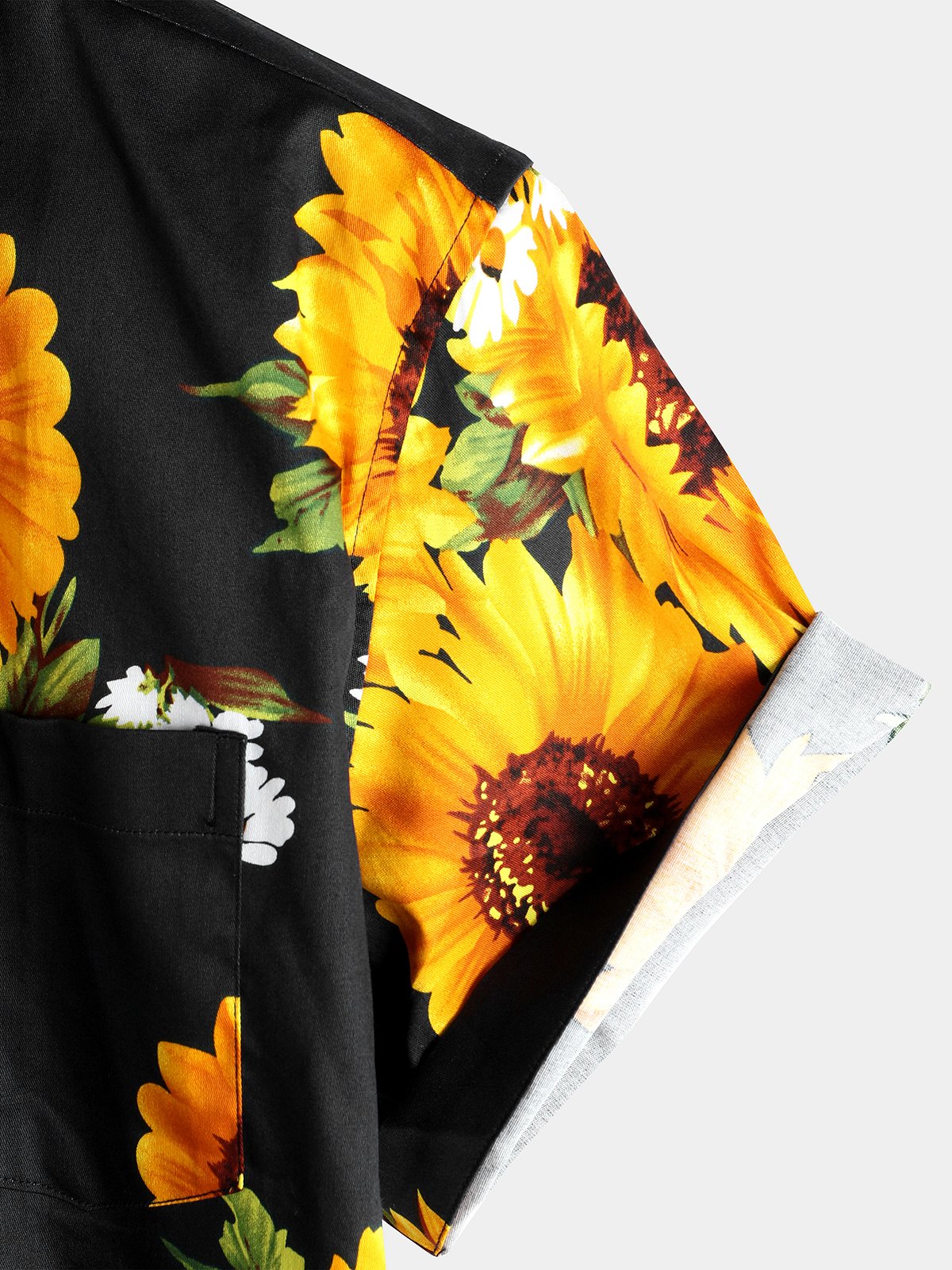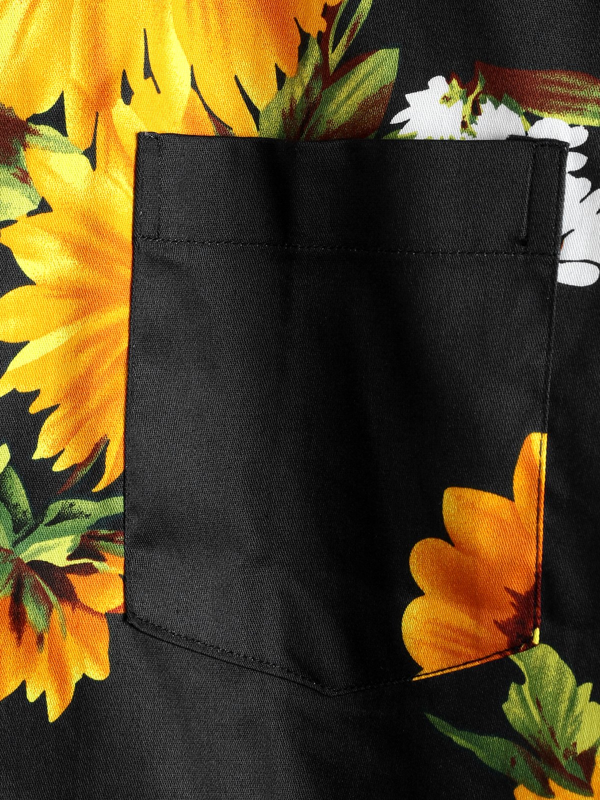 Men's Black Vintage Sunflower Pocket Short Sleeve Shirt