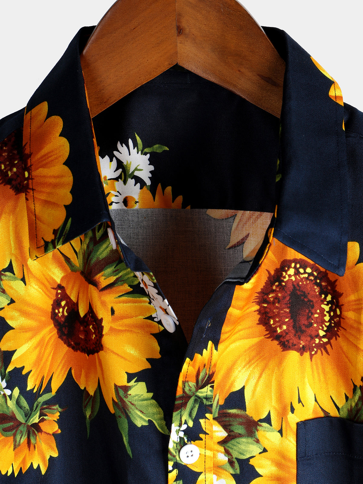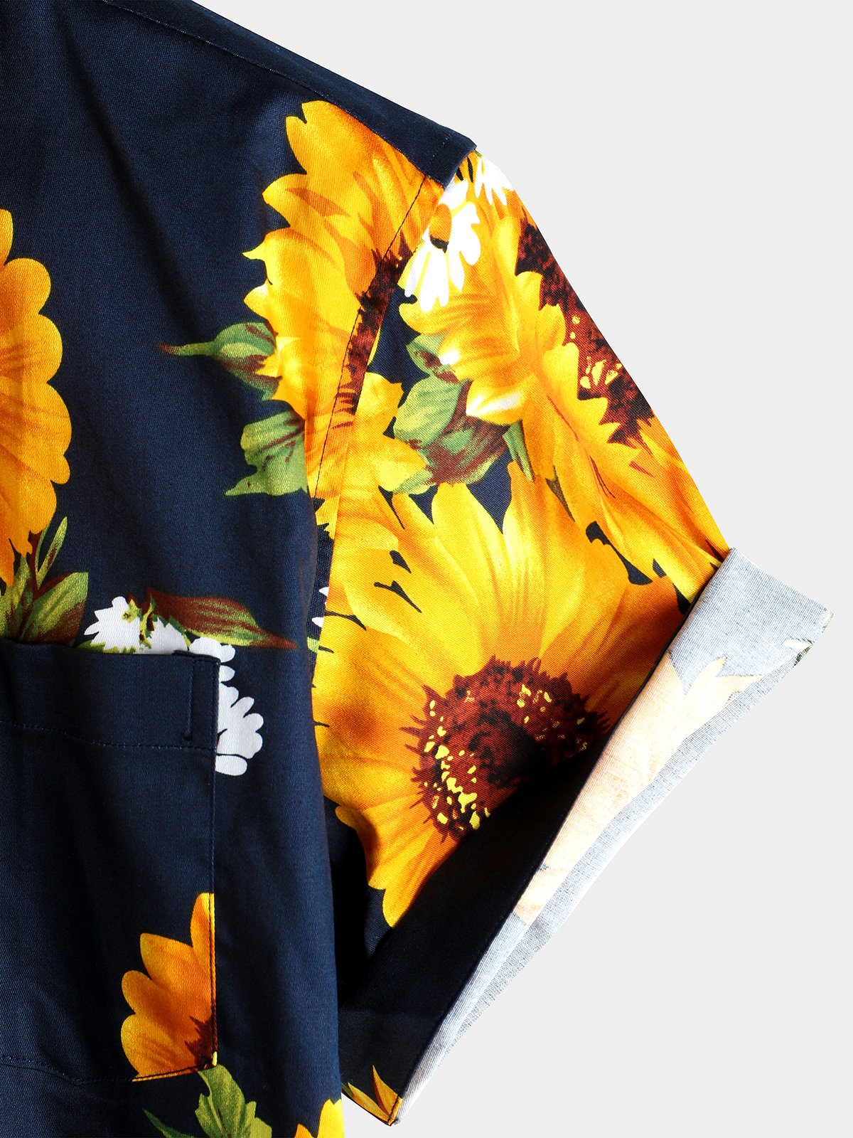 Men's Vintage Sunflower Pocket Dark Blue Short Sleeve Shirt