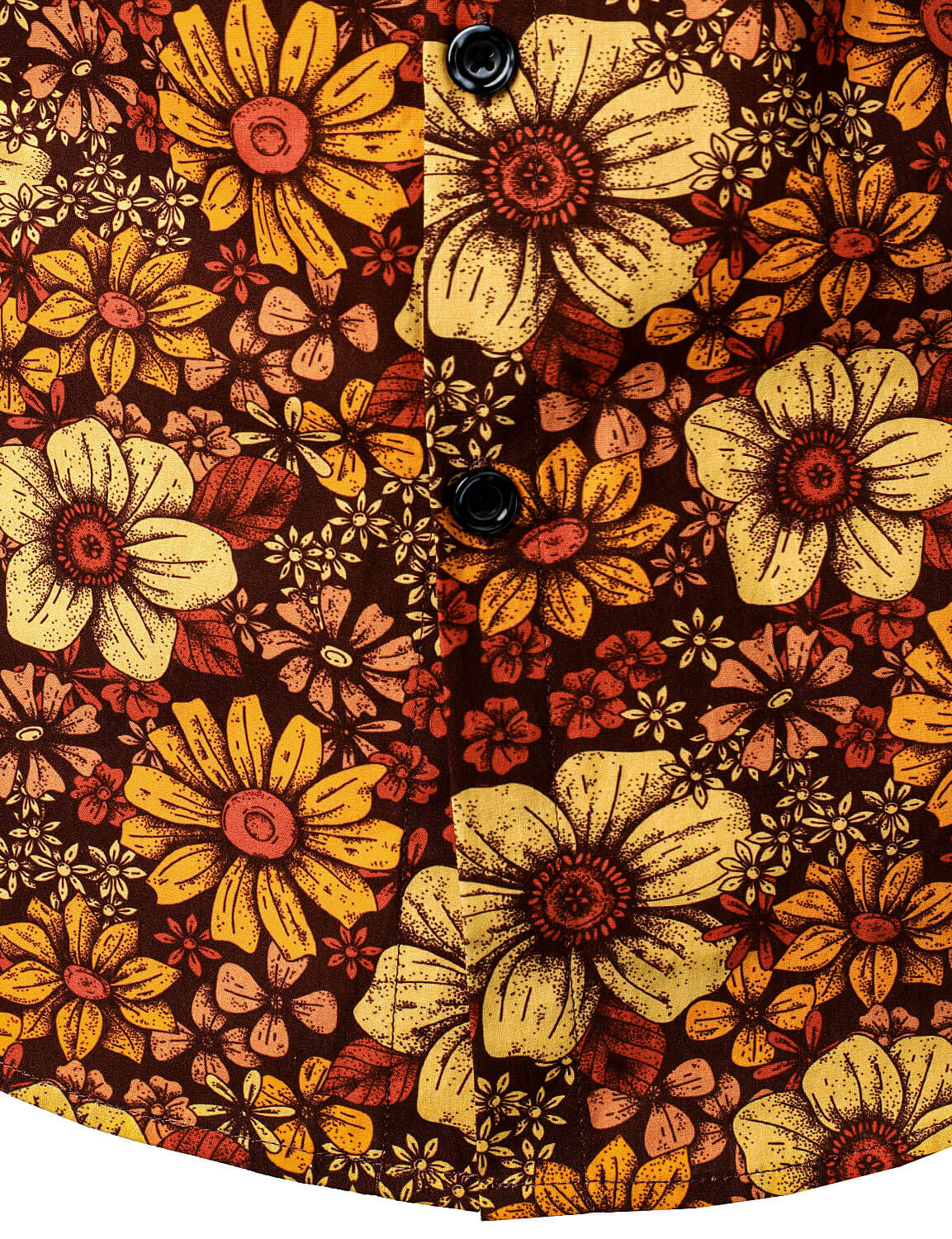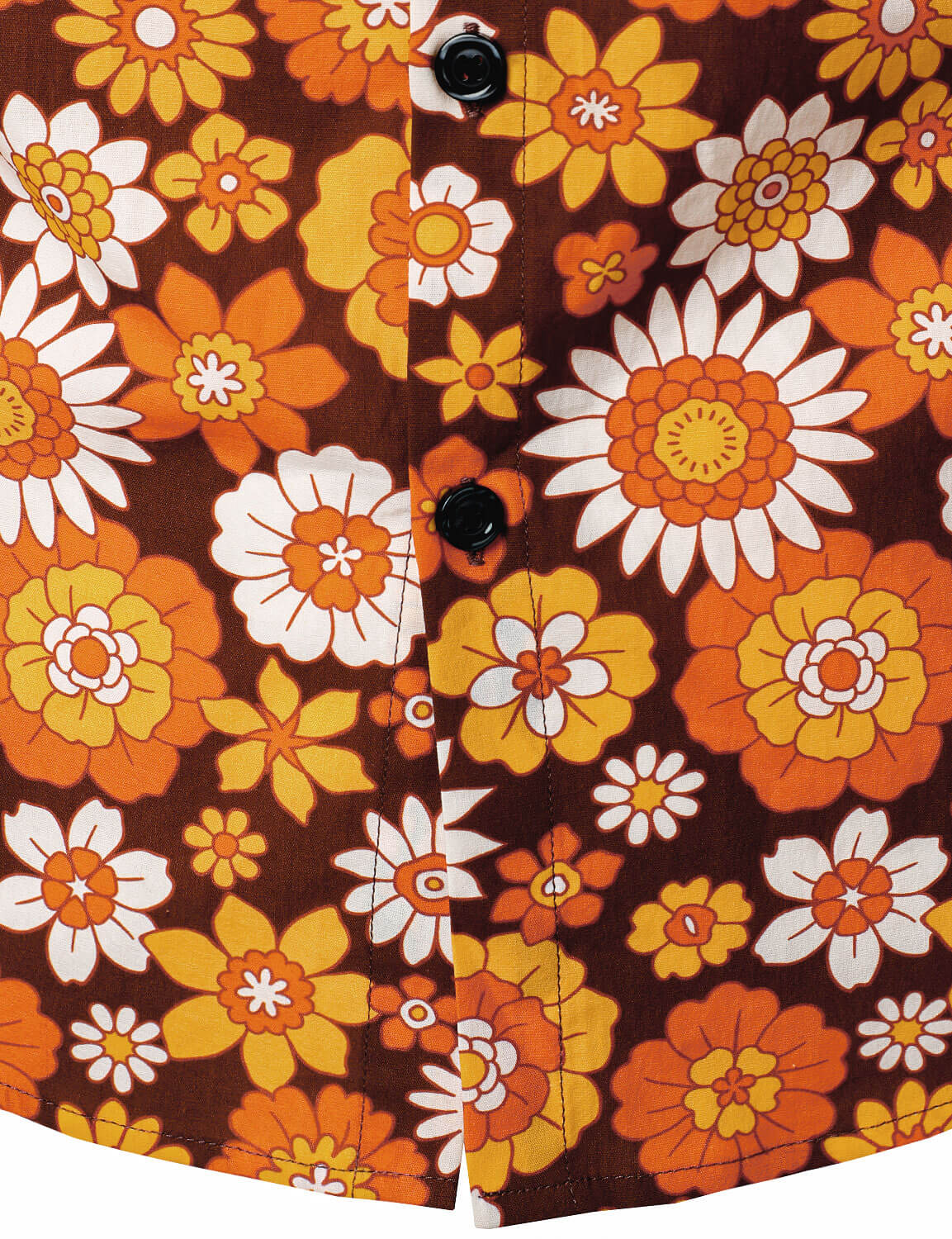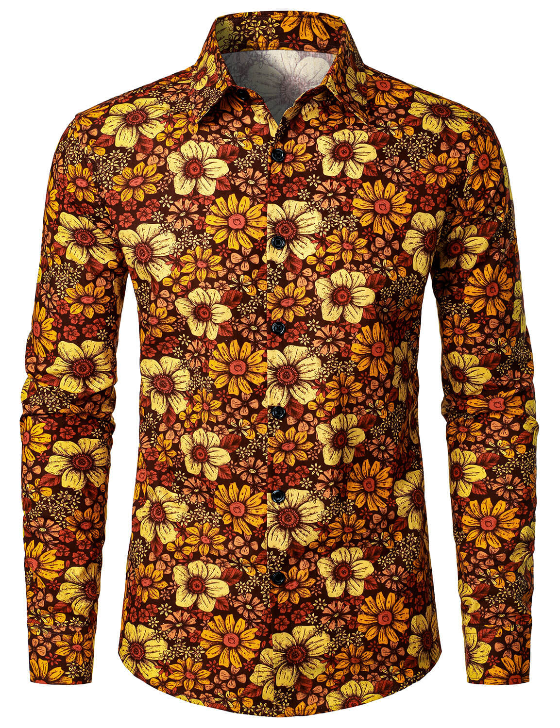 Men's 70s Floral Print Breathable Cotton Brown Long Sleeve Shirt
