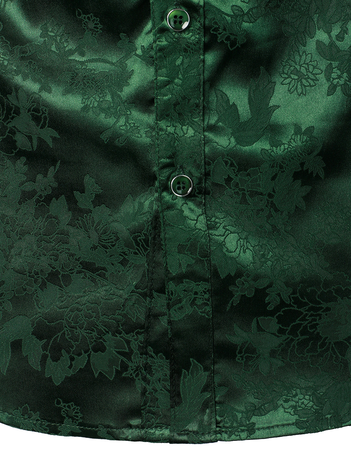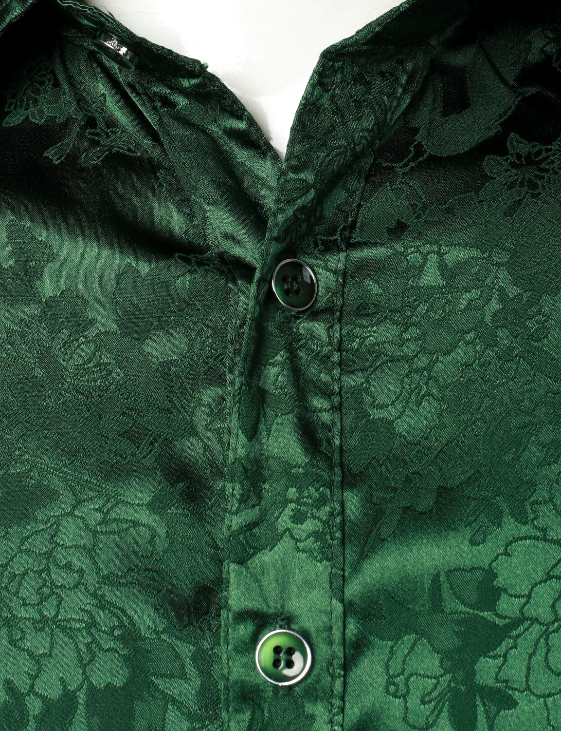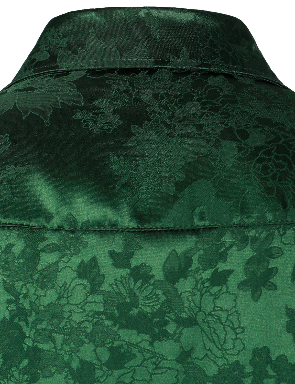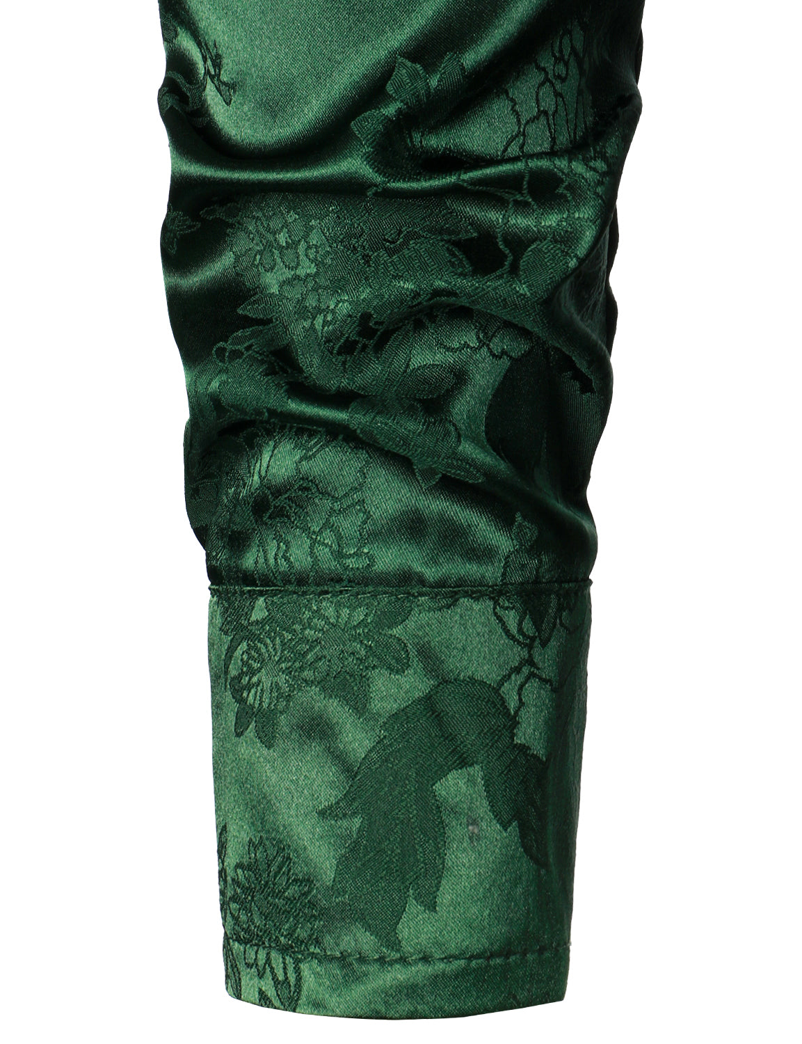 Men's Casual Shiny Satin Floral Jacquard Green Long Sleeve Button Up Dress Shirt
