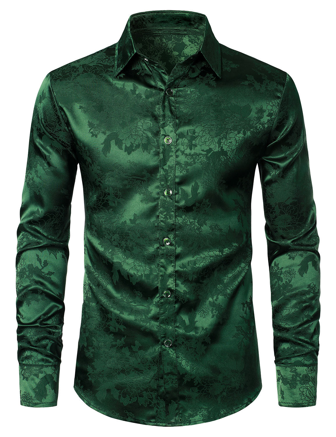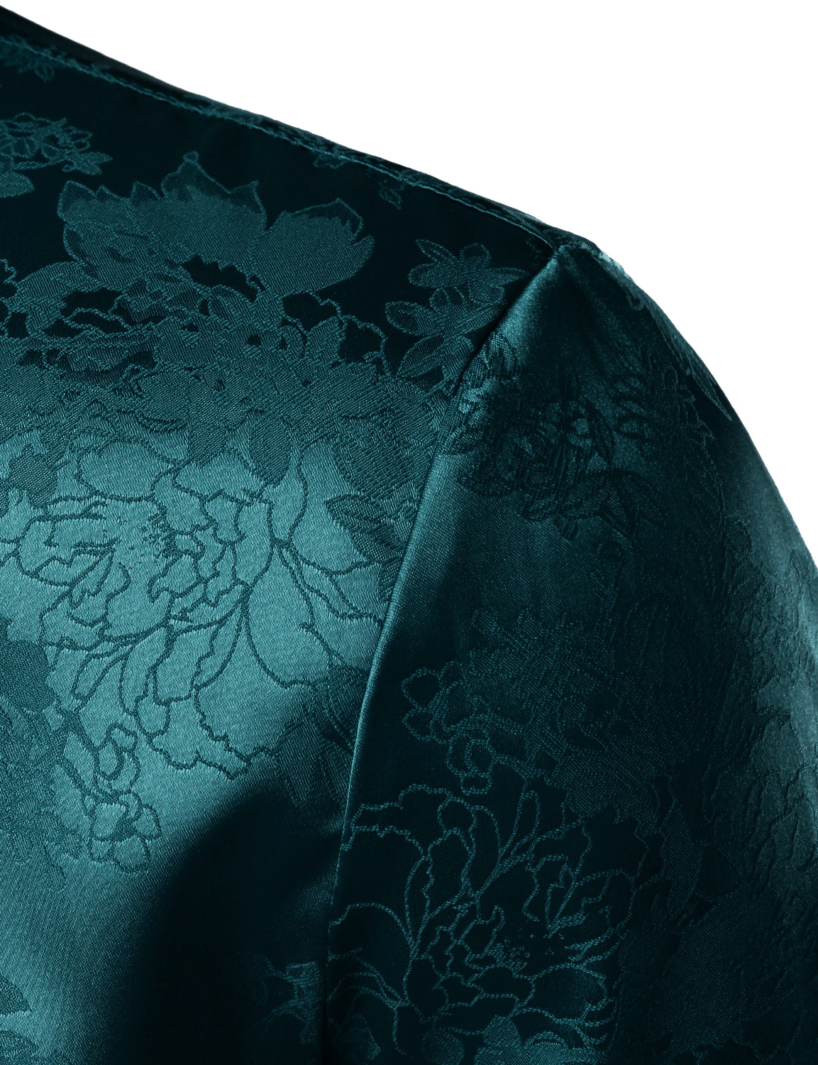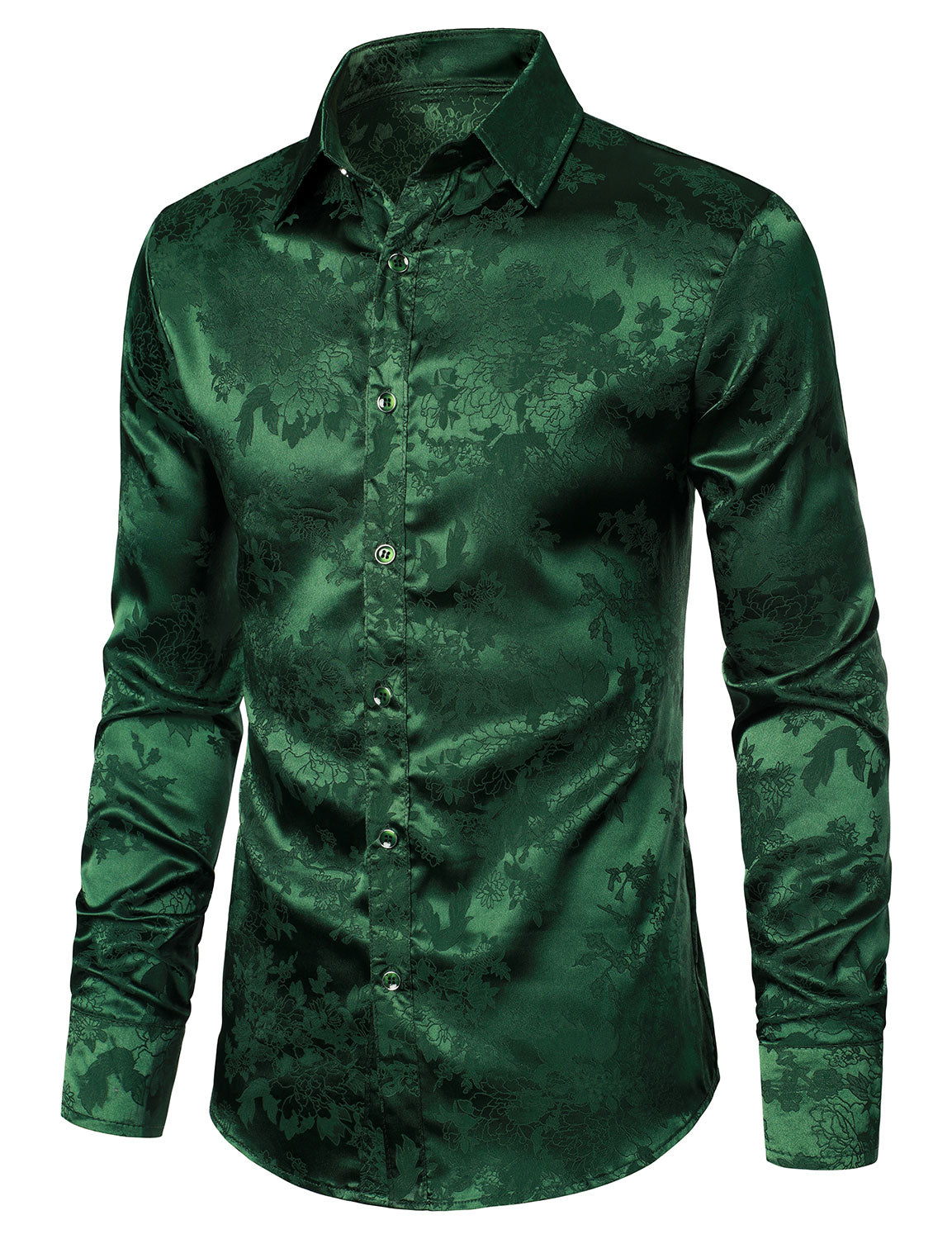Men's Casual Shiny Satin Floral Jacquard Green Long Sleeve Button Up Dress Shirt