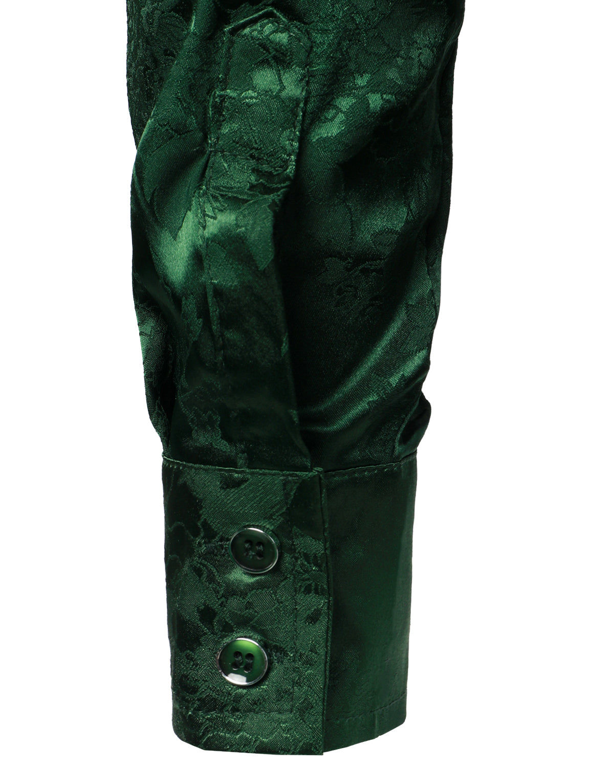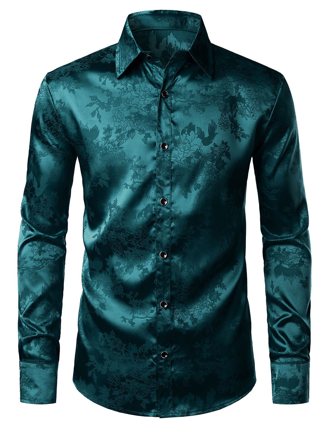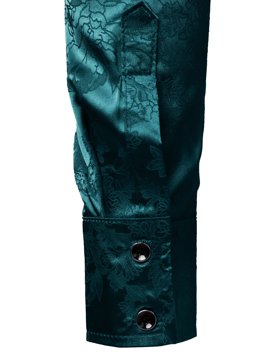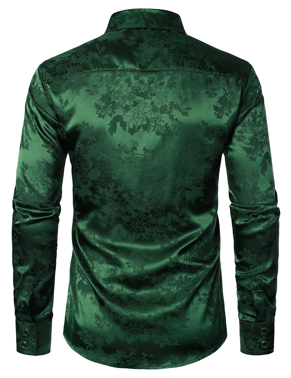 Men's Casual Shiny Satin Floral Jacquard Green Long Sleeve Button Up Dress Shirt
