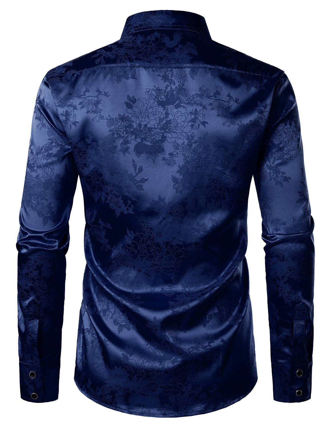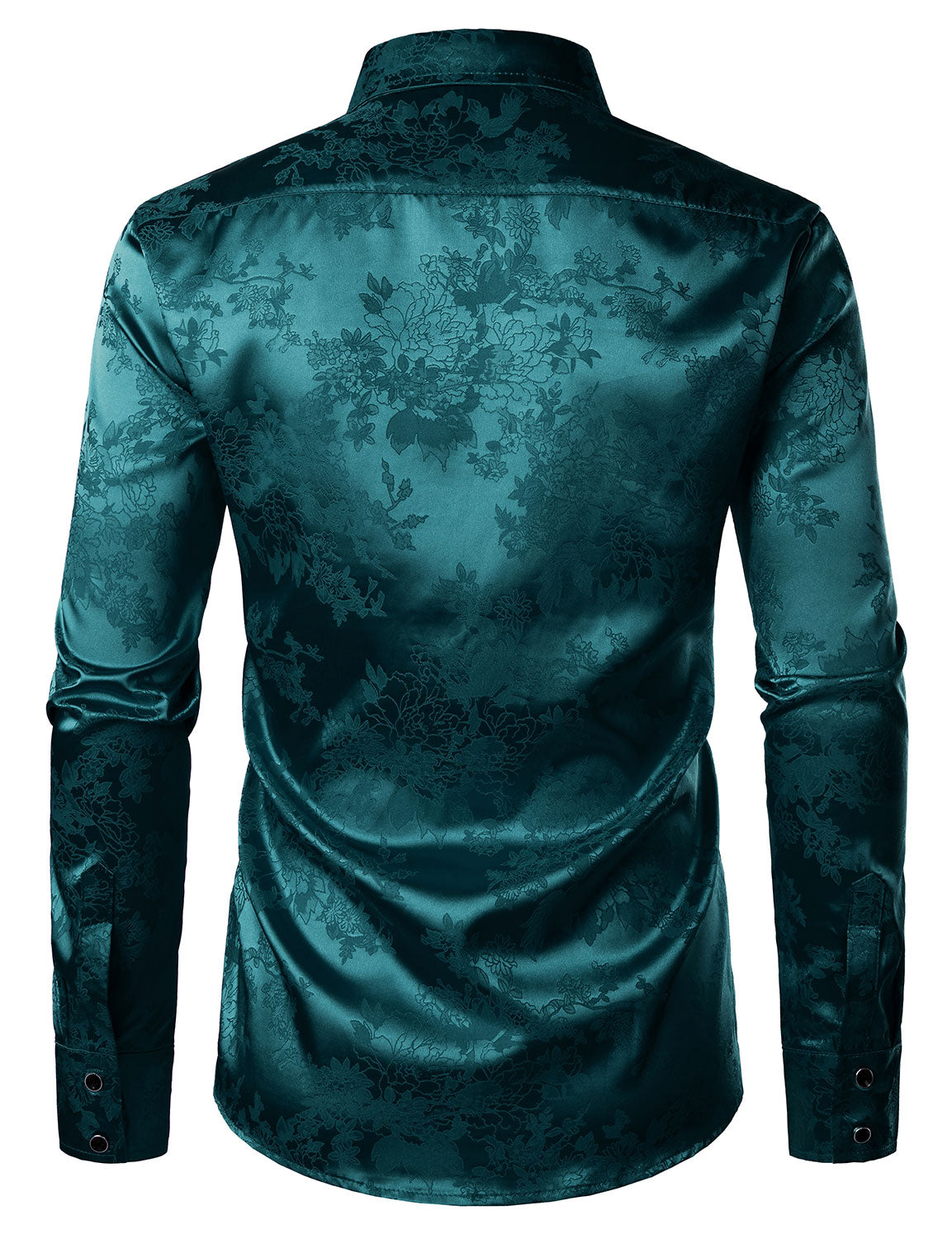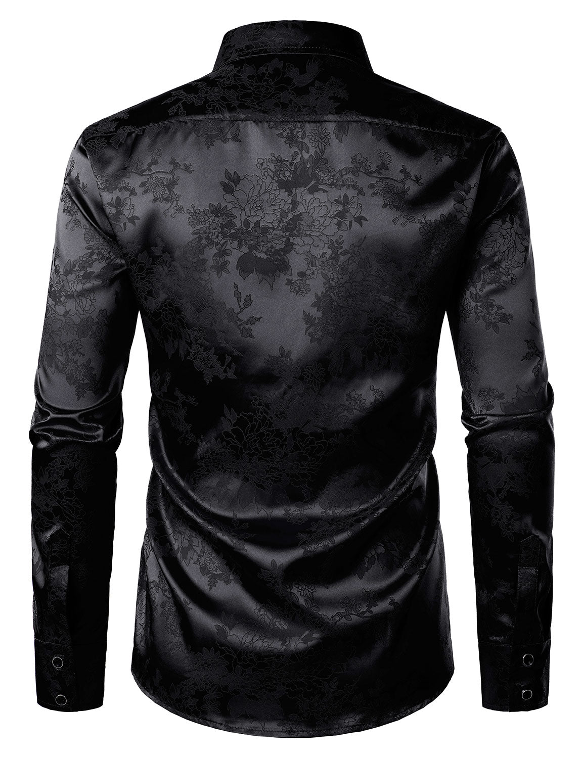 Men's Shiny Satin Floral Jacquard Casual Long Sleeve Button Up Dress Shirt