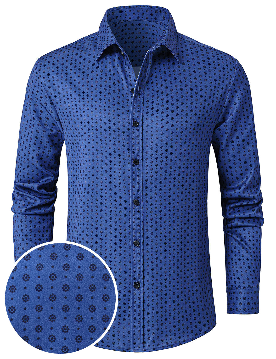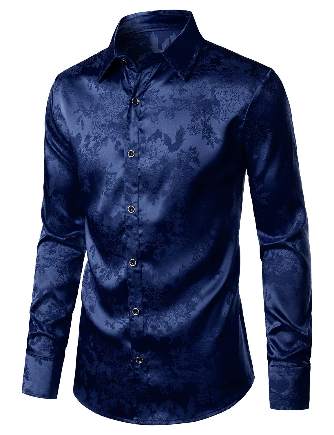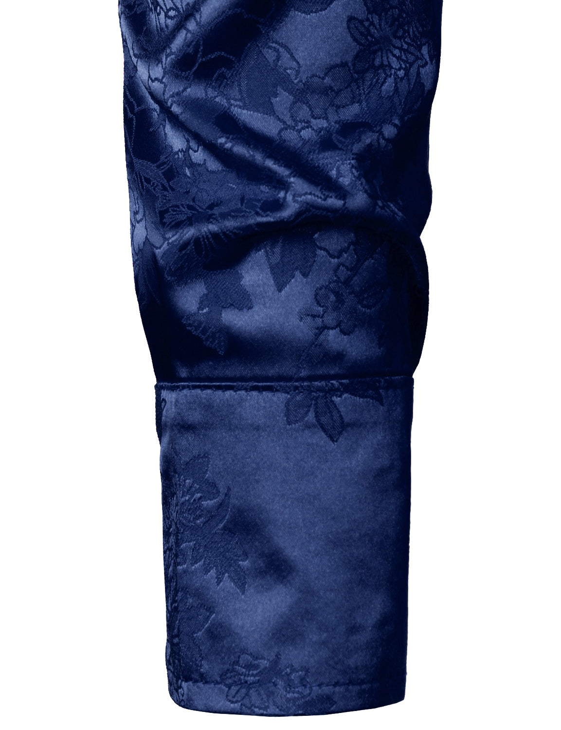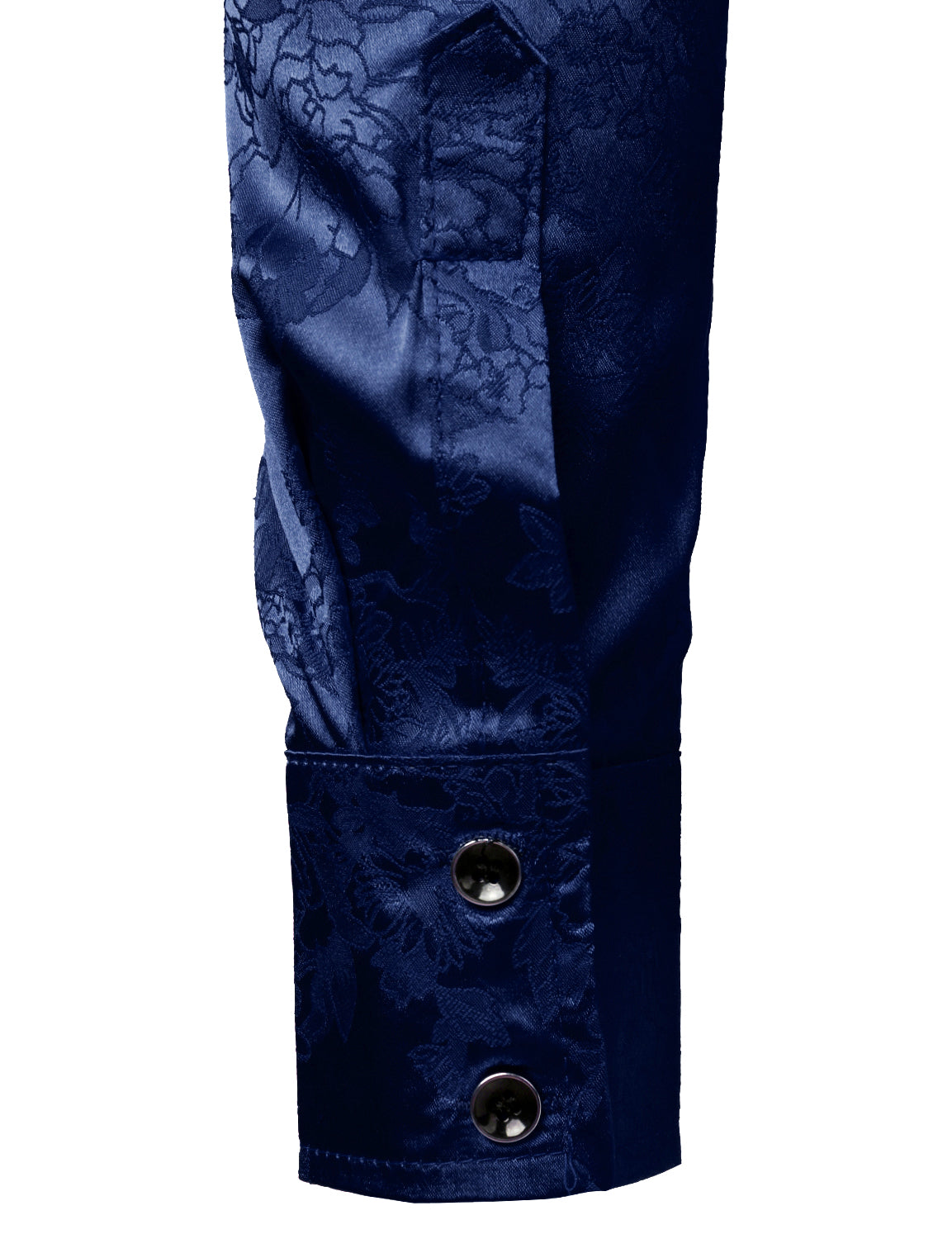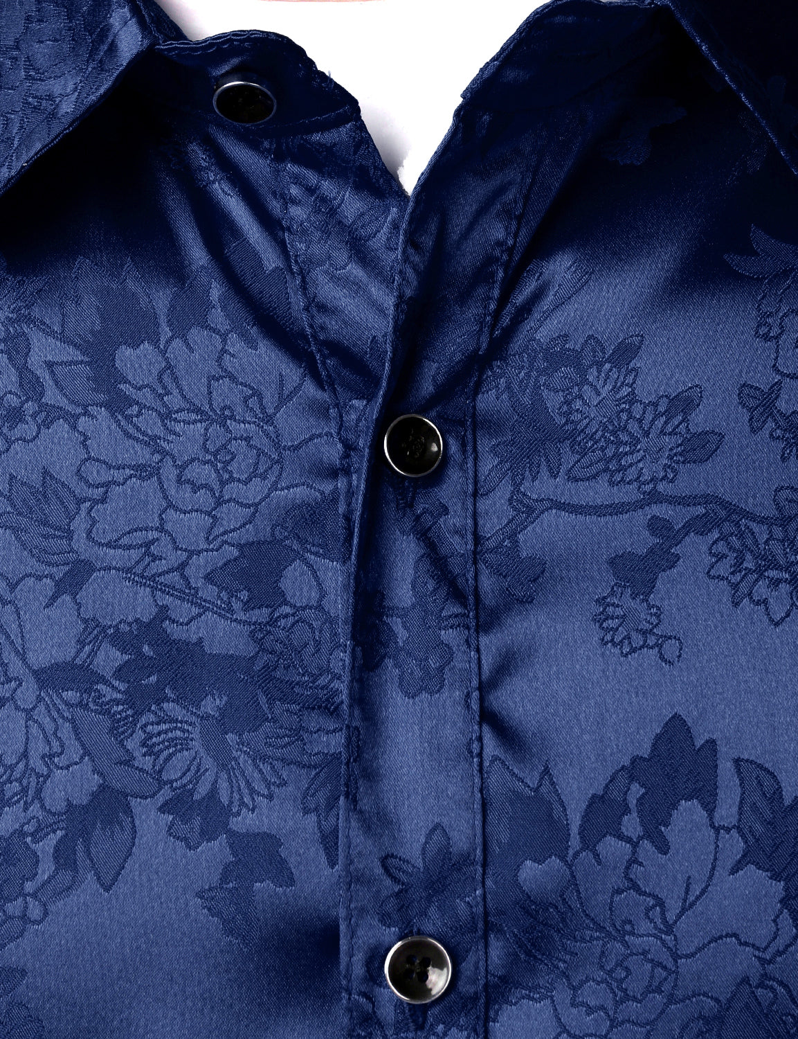 Men's Casual Shiny Satin Floral Jacquard Blue Long Sleeve Button Up Dress Shirt