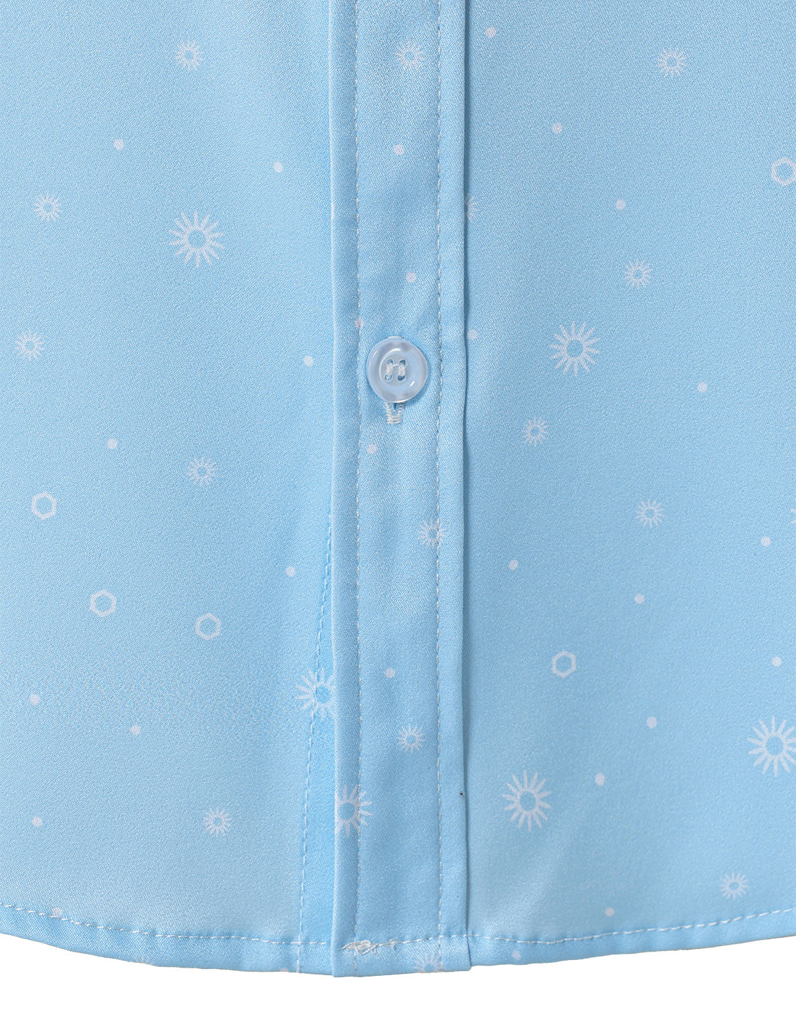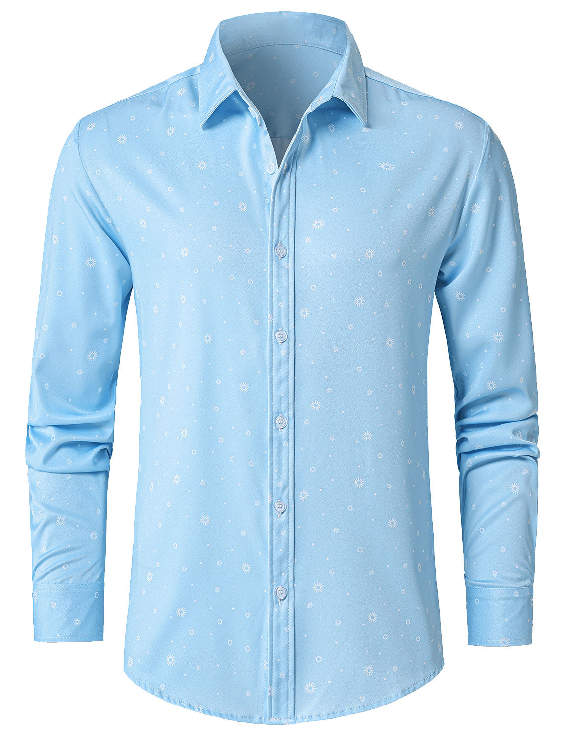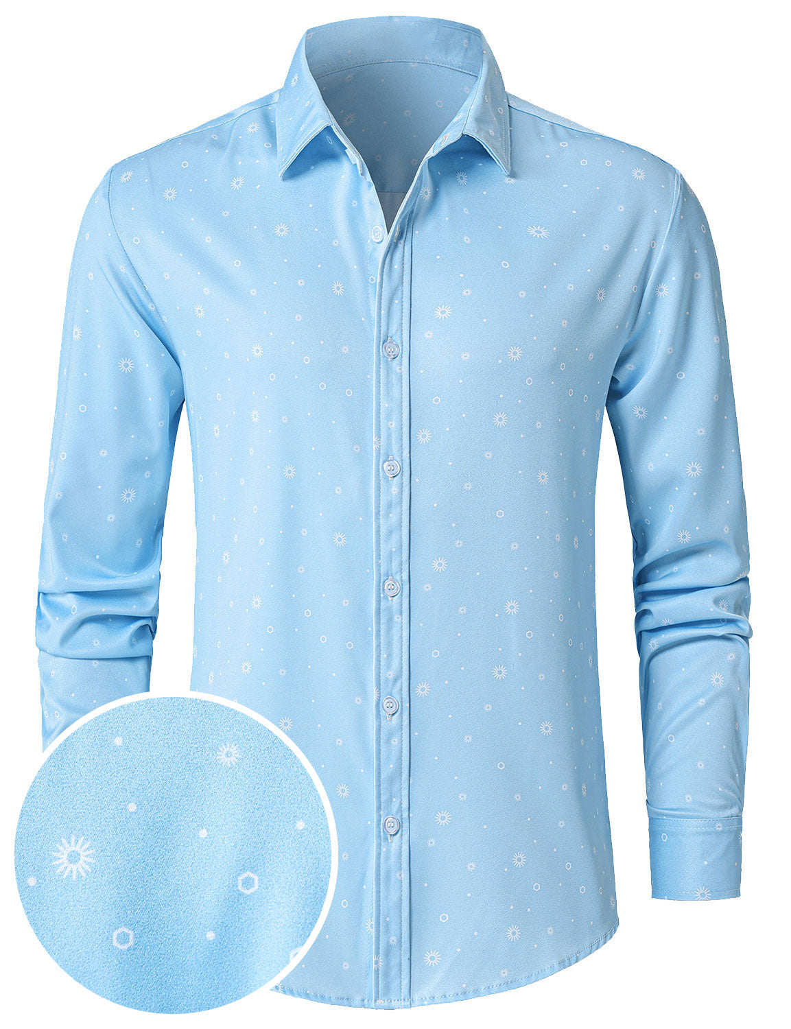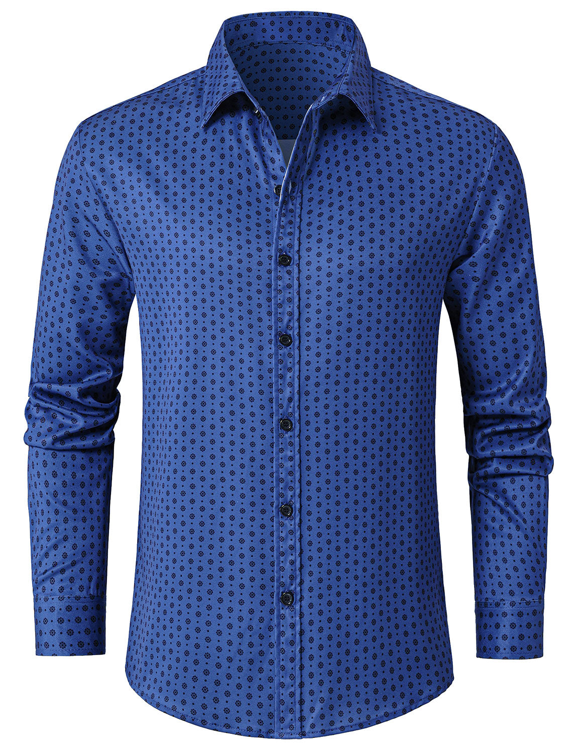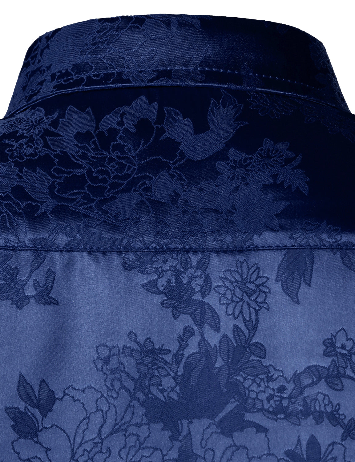 Men's Casual Shiny Satin Floral Jacquard Blue Long Sleeve Button Up Dress Shirt