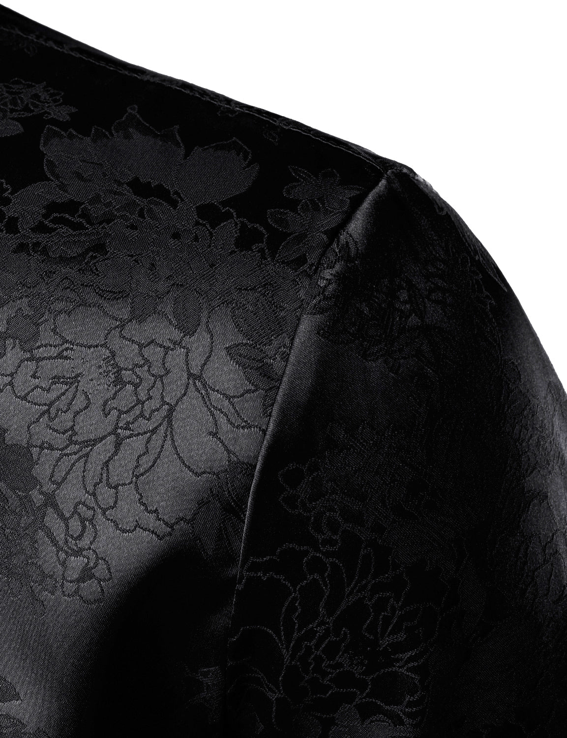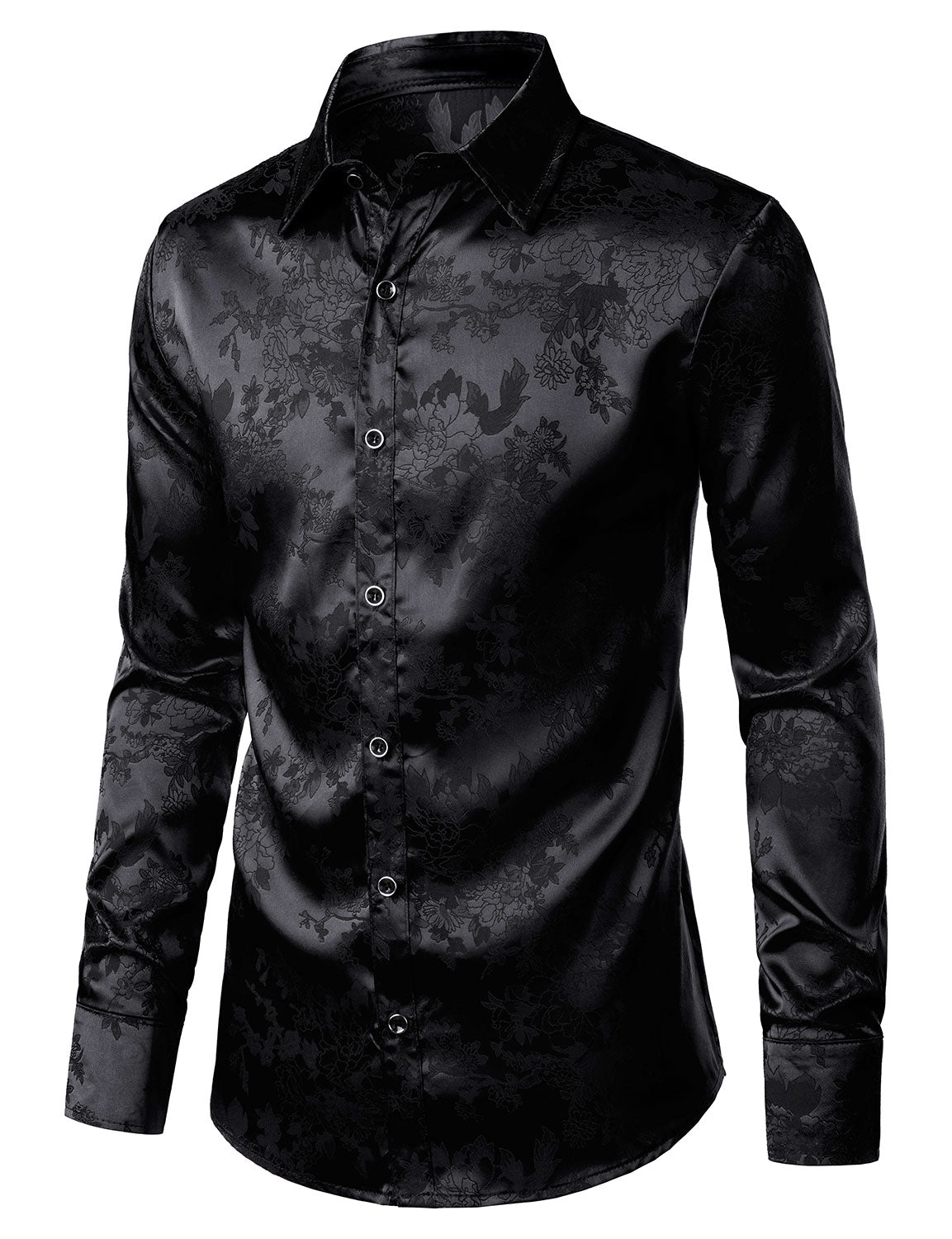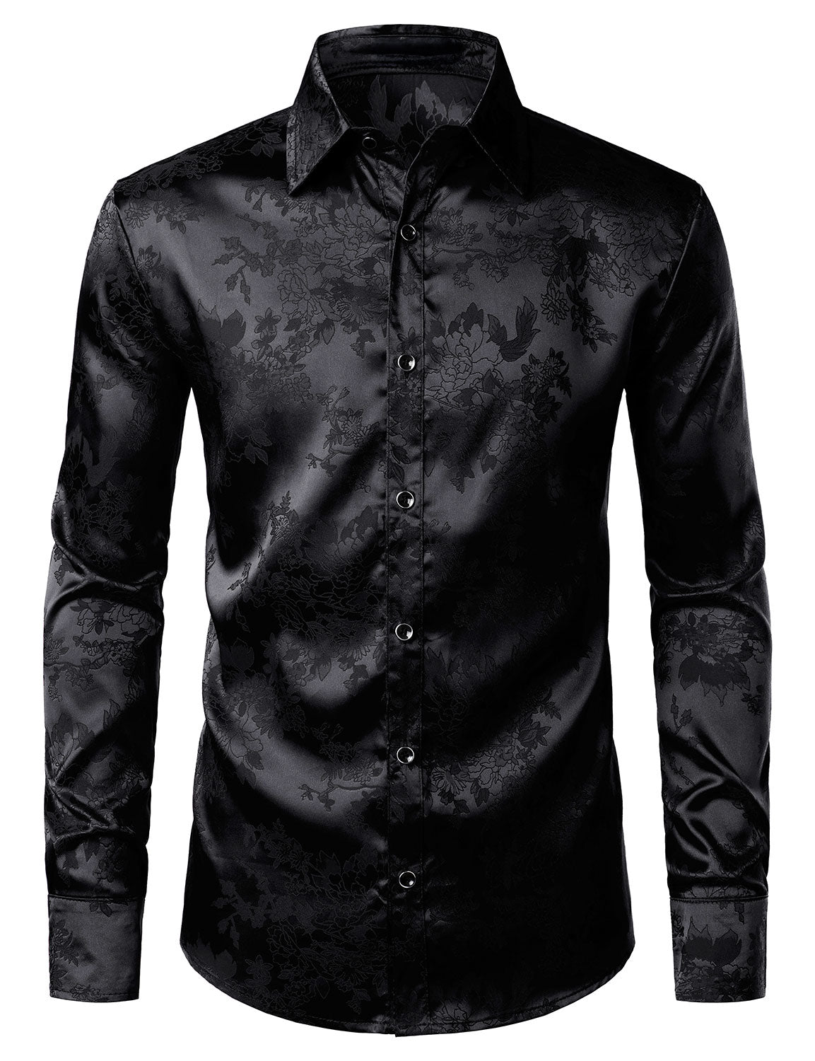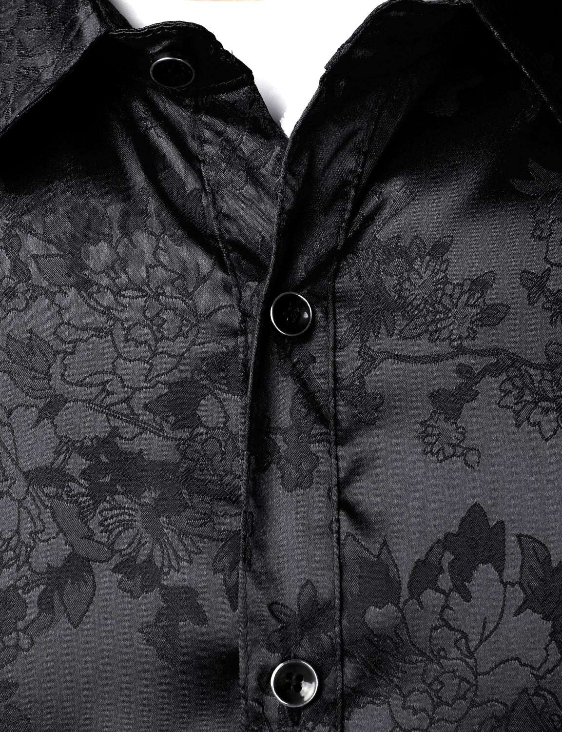 Men's Shiny Satin Floral Jacquard Black Long Sleeve Button Up Dress Shirt