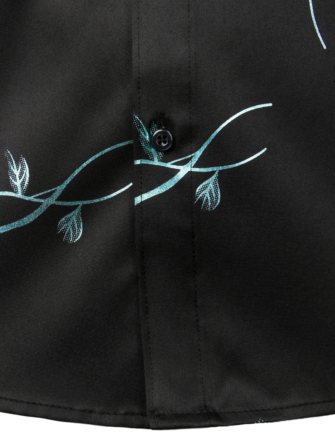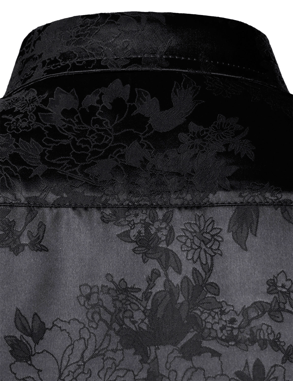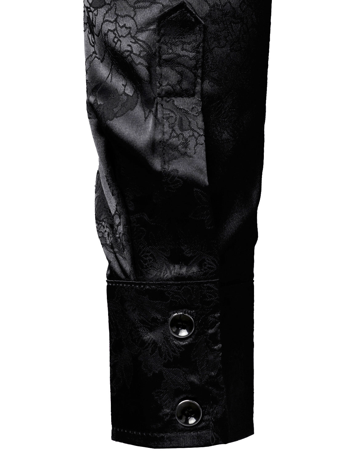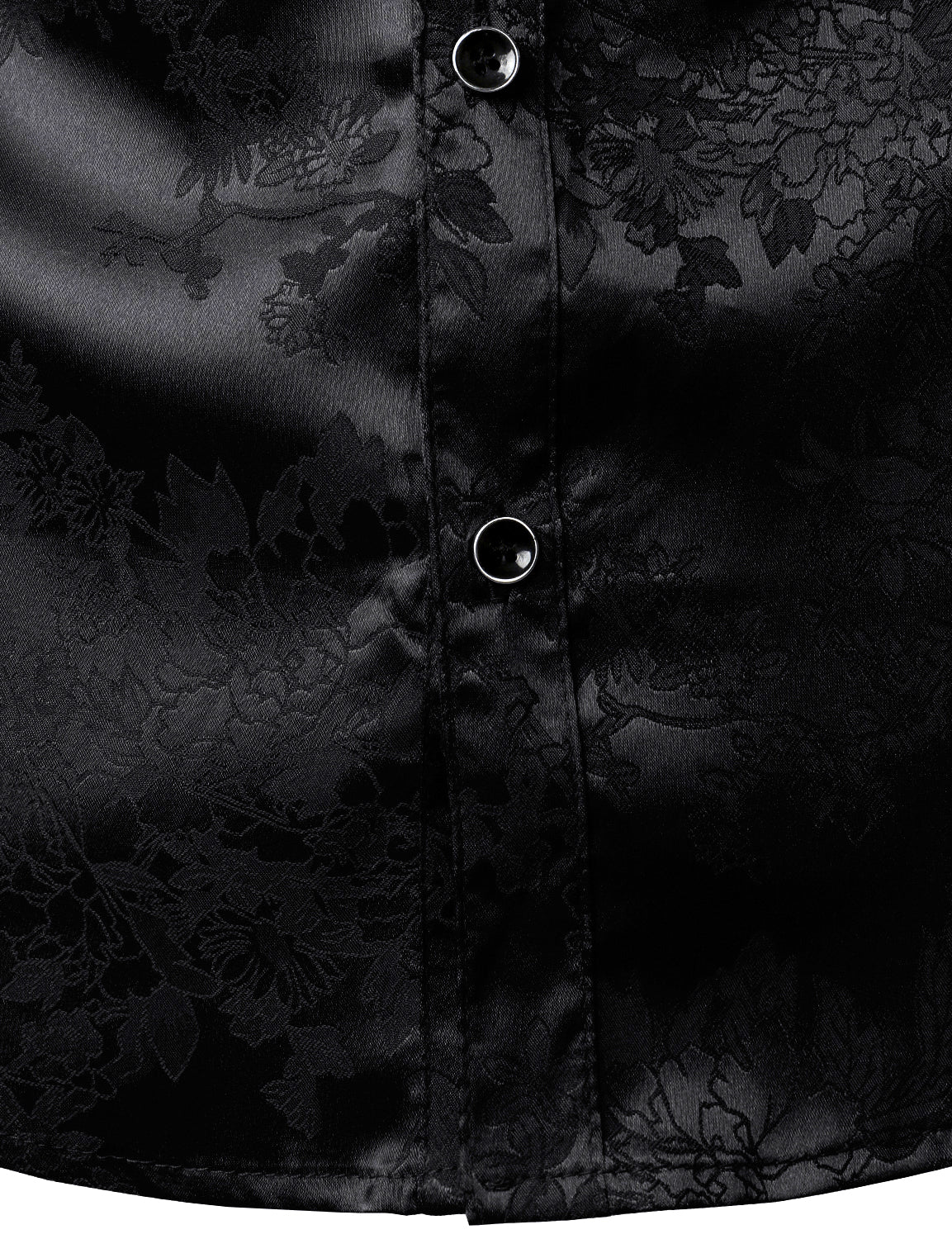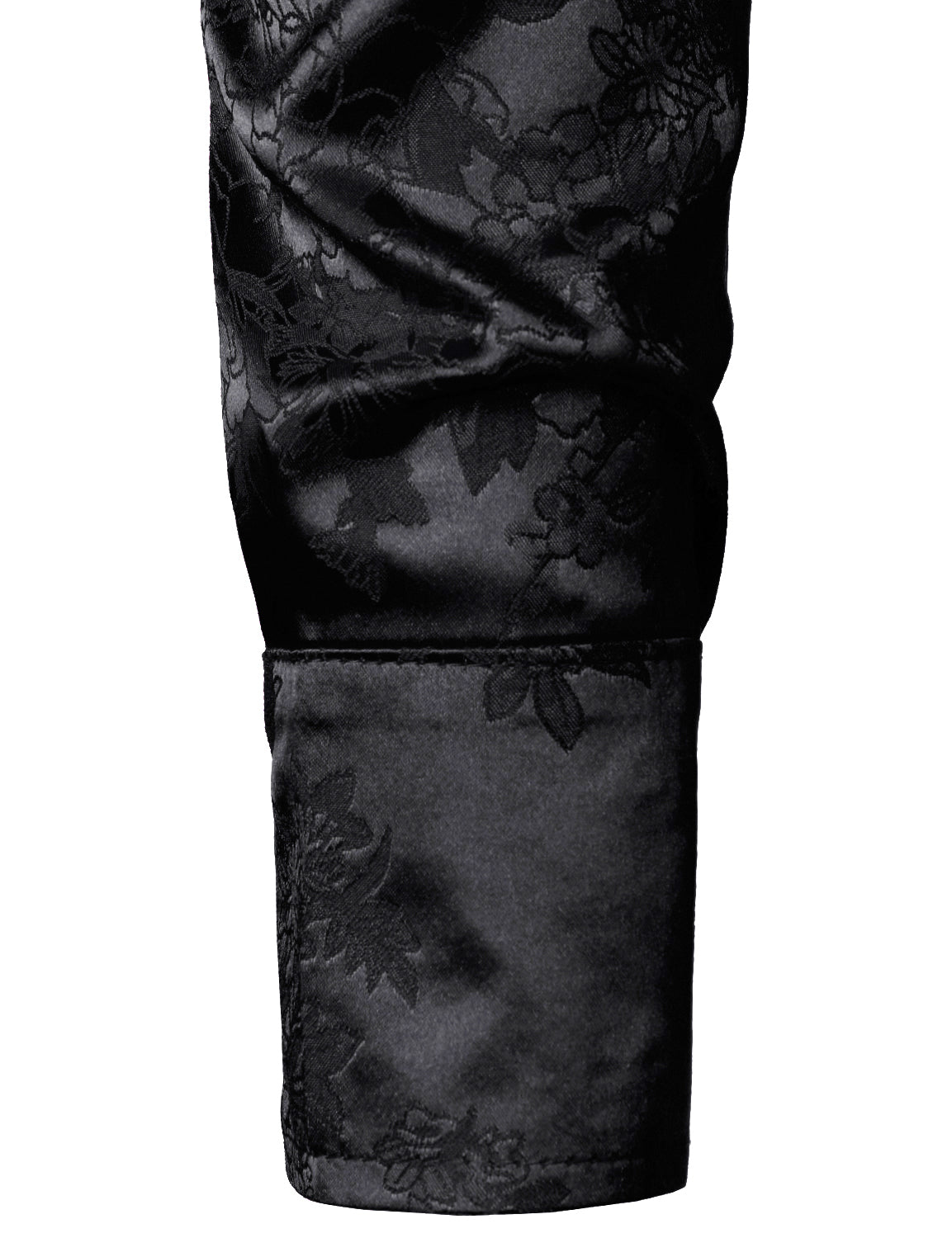 Men's Shiny Satin Floral Jacquard Black Long Sleeve Button Up Dress Shirt