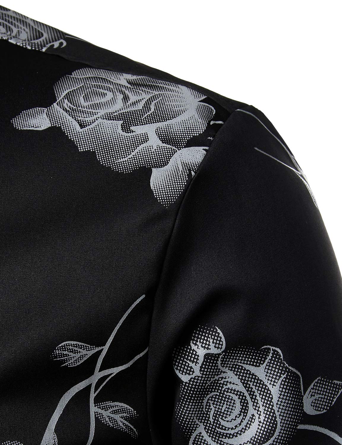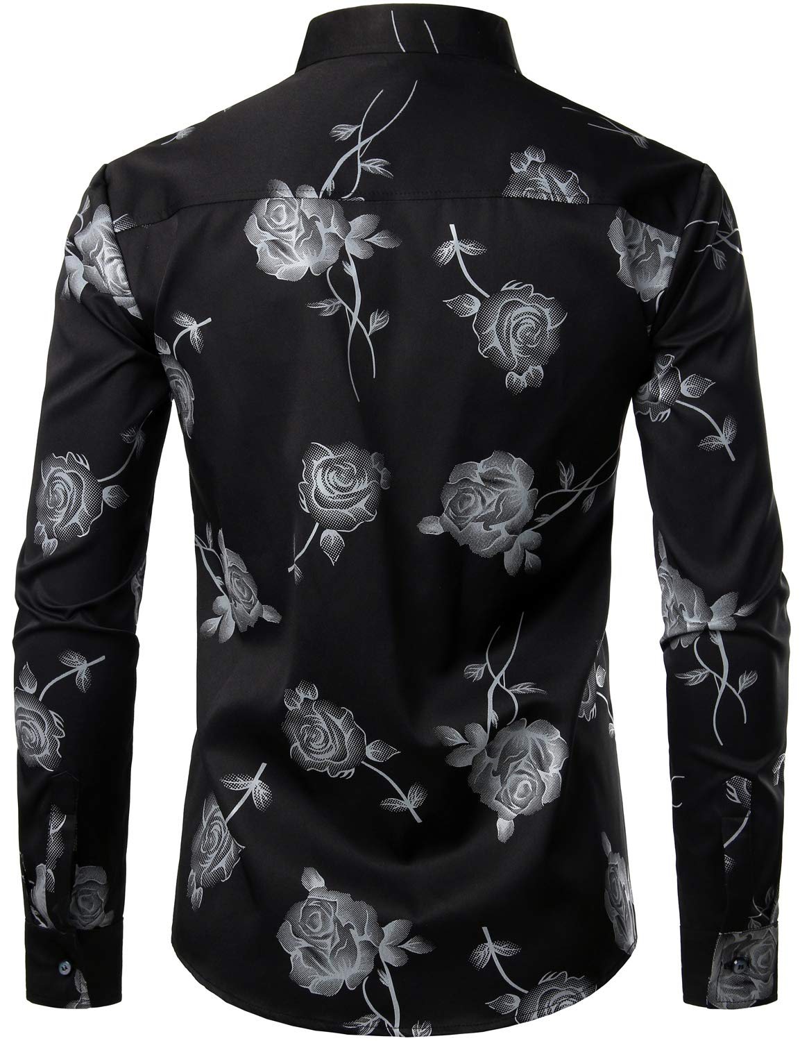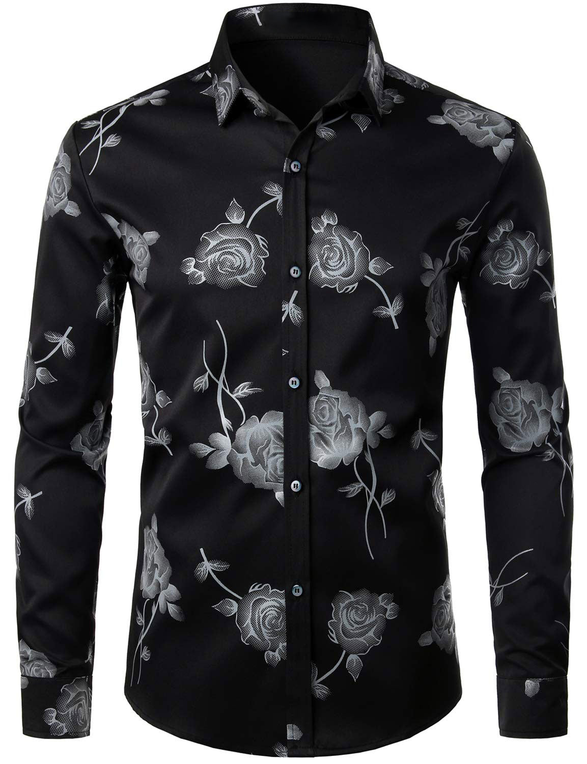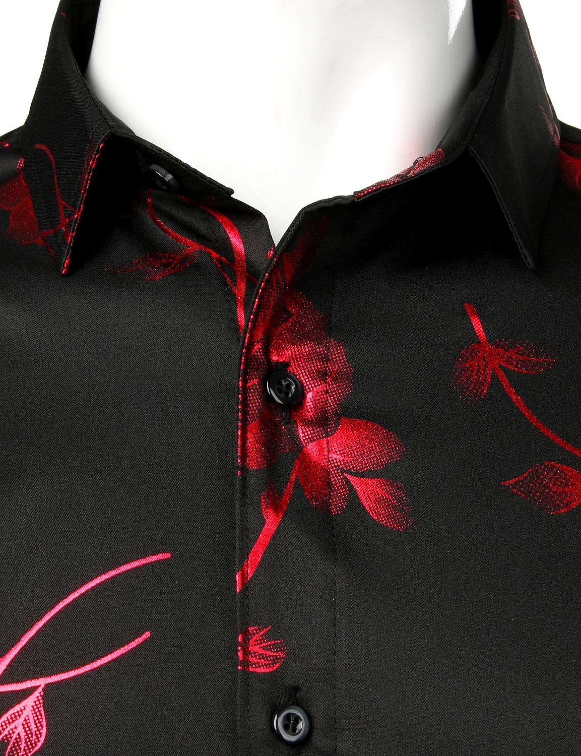 Men's Casual Rose Floral Print Button Up Long Sleeve Dress Shirt