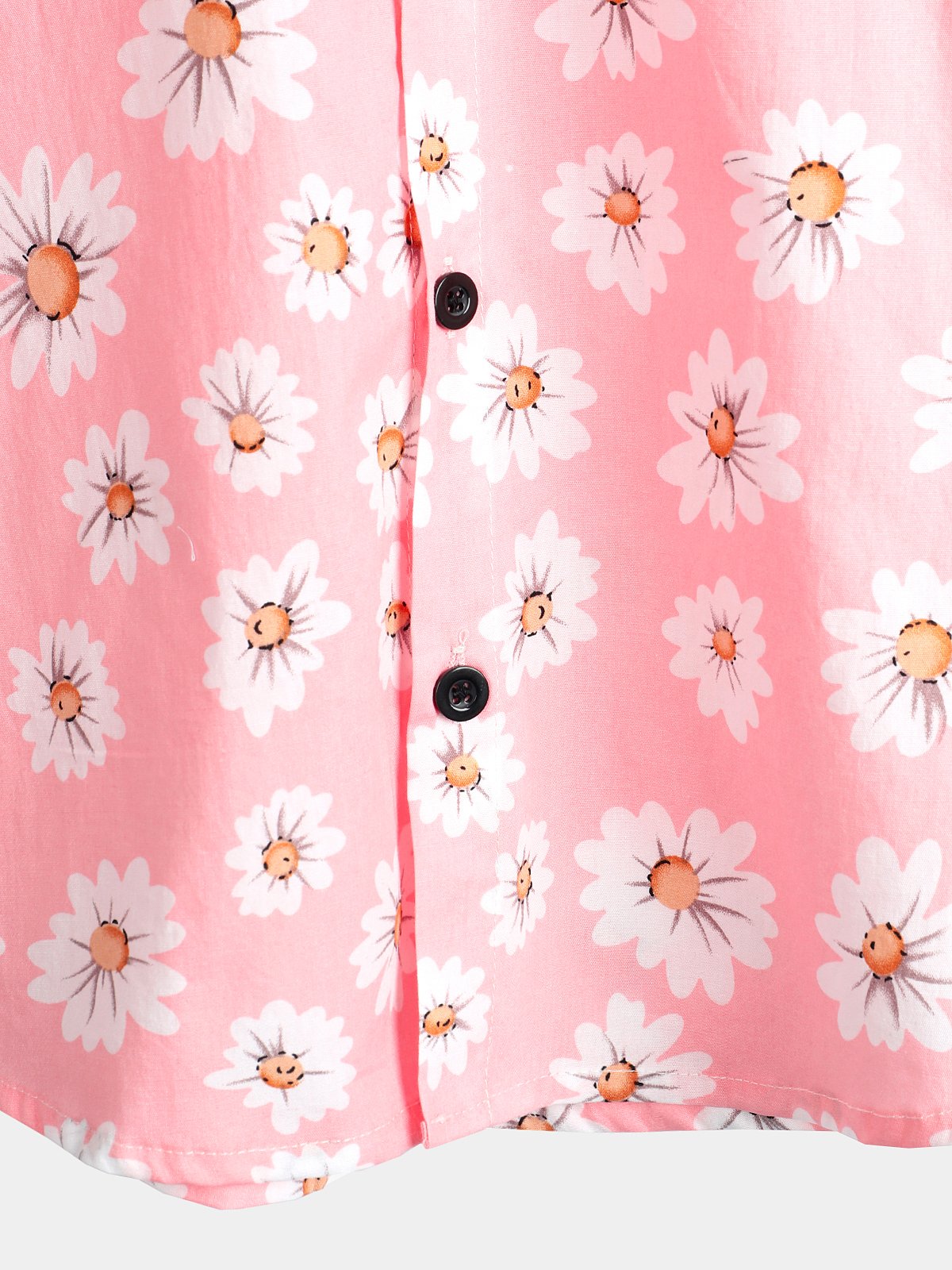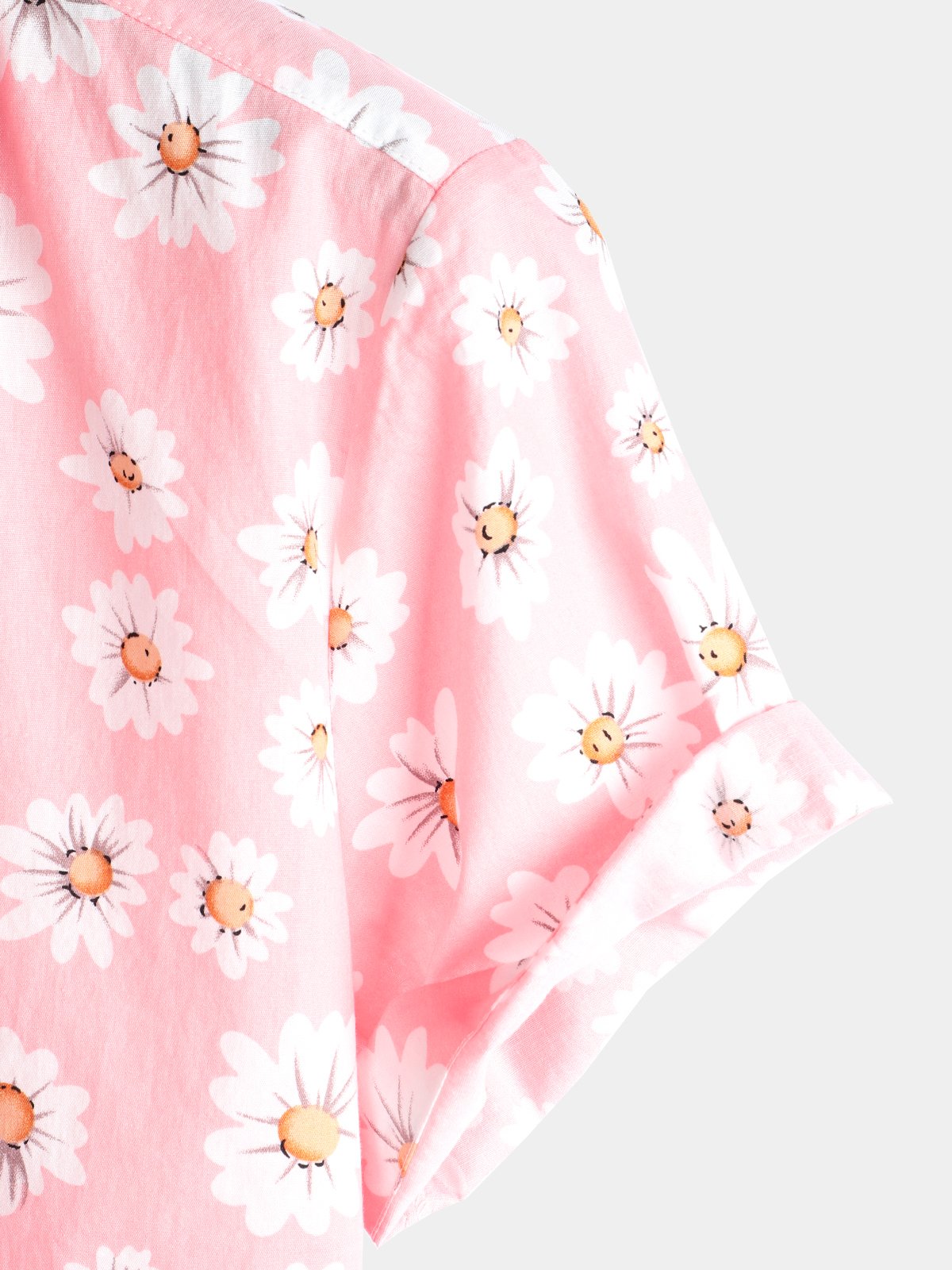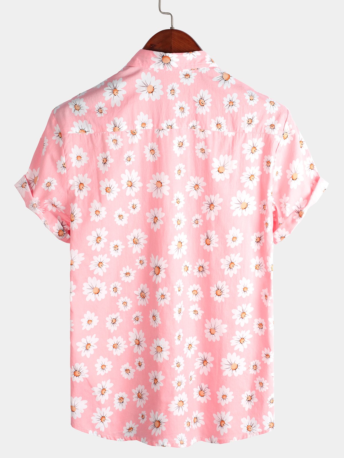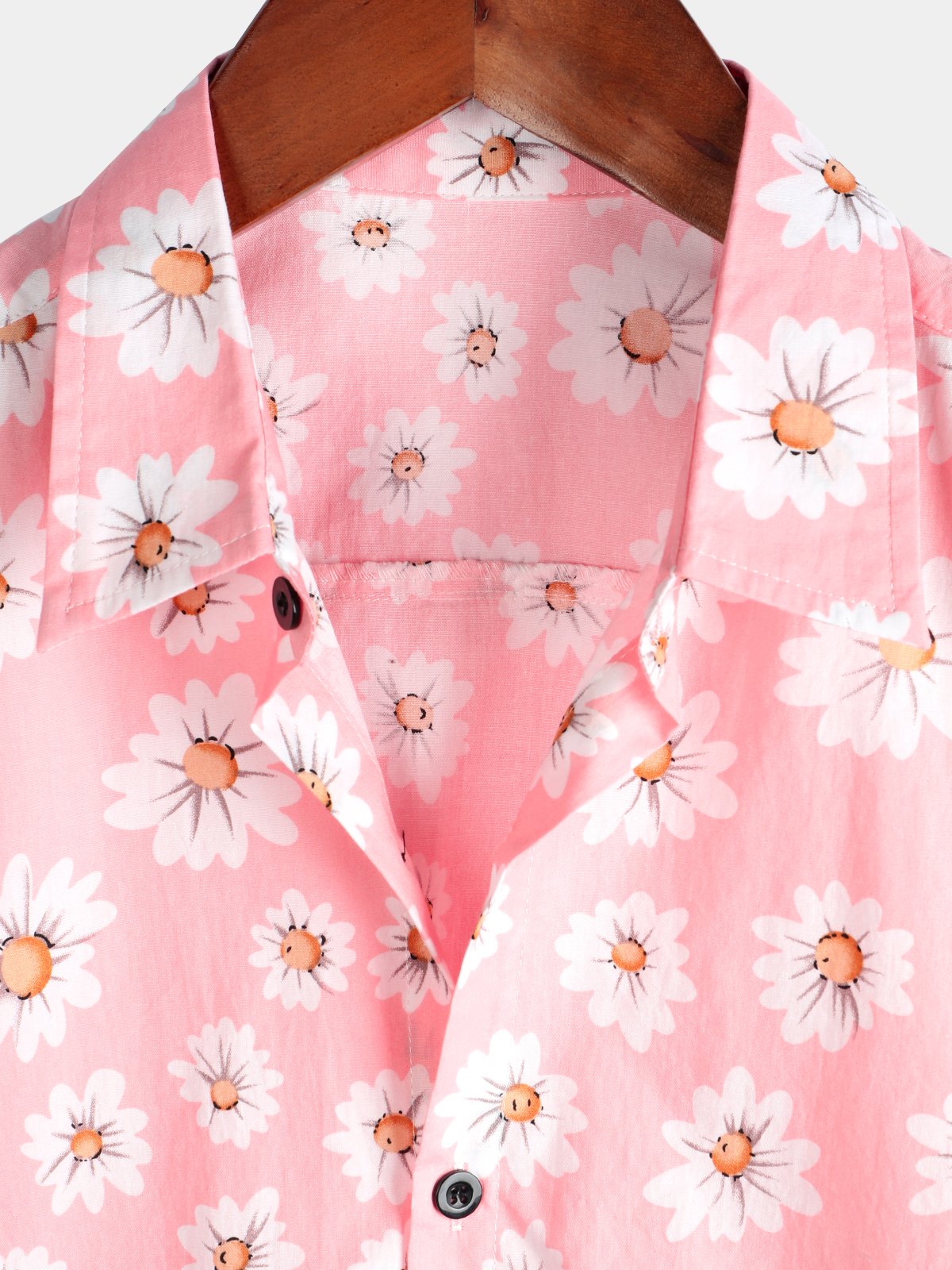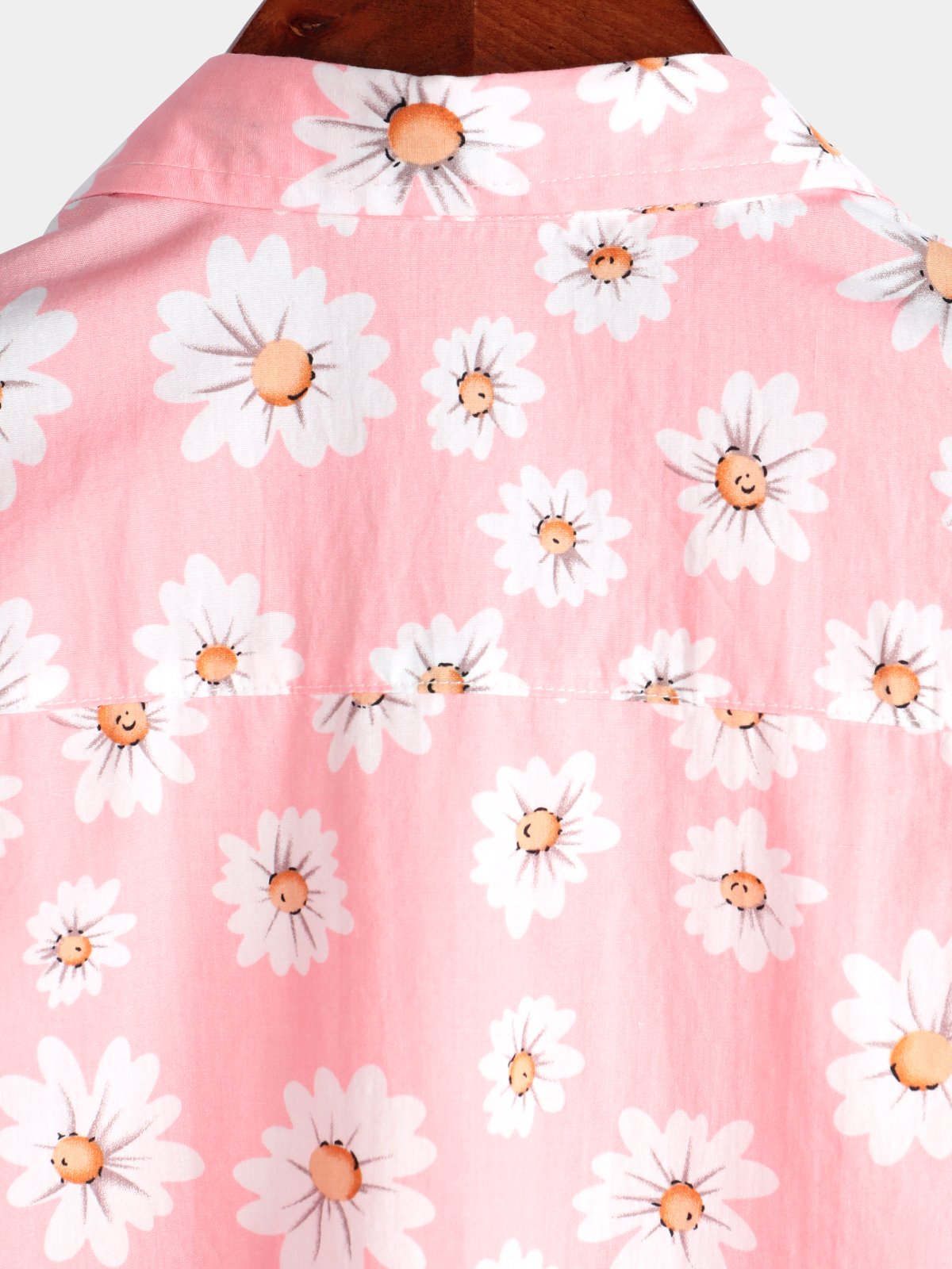 Men's Pink Floral Daisy Print Tropical Hawaii Cotton Shirt
