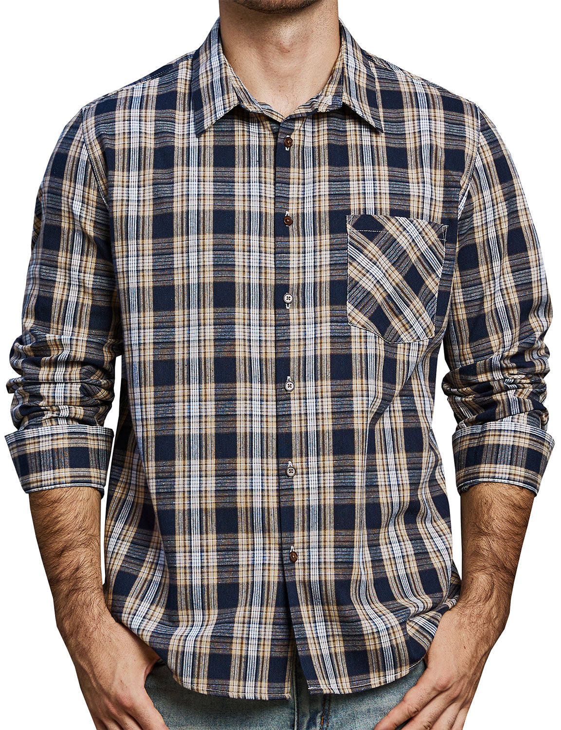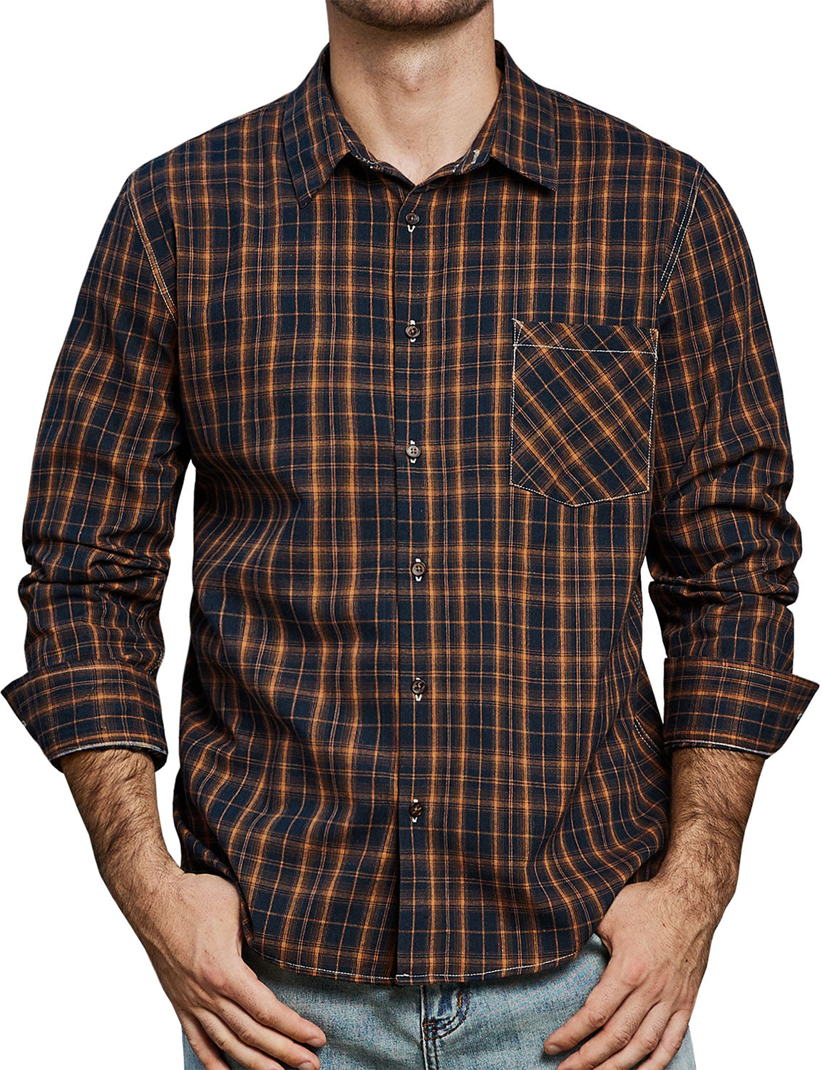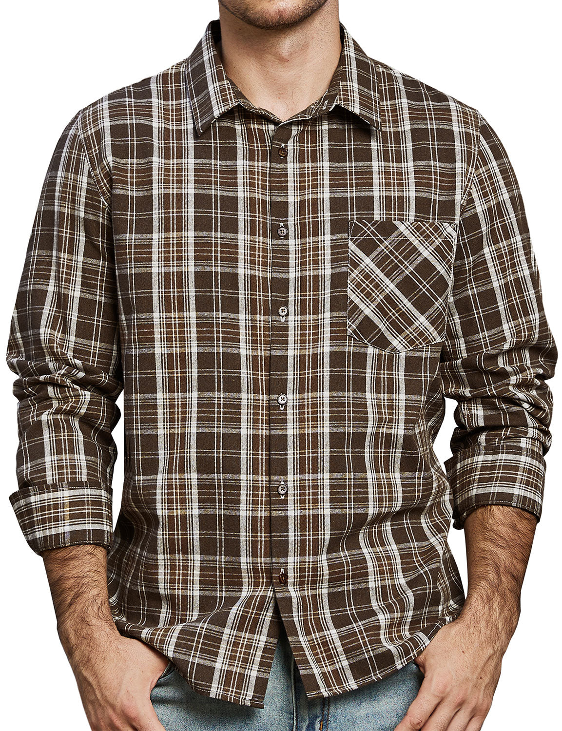 Men's Casual Plaid Pocket Button Up Long Sleeve Shirt