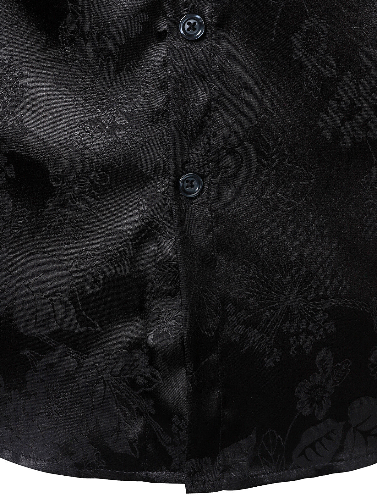 Men's Floral Jacquard Shiny Satin Black Long Sleeve Dress Shirt
