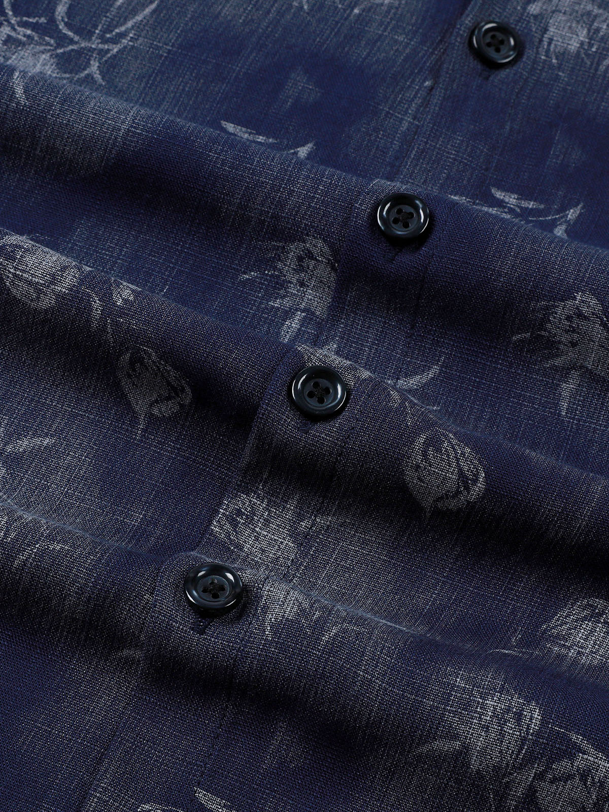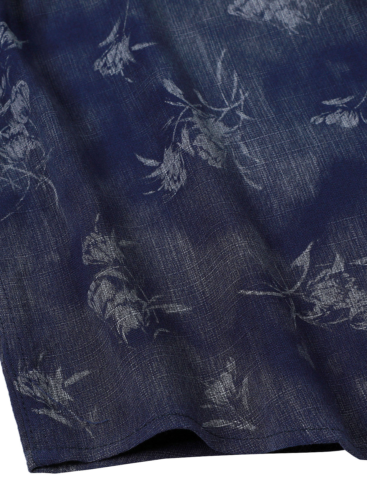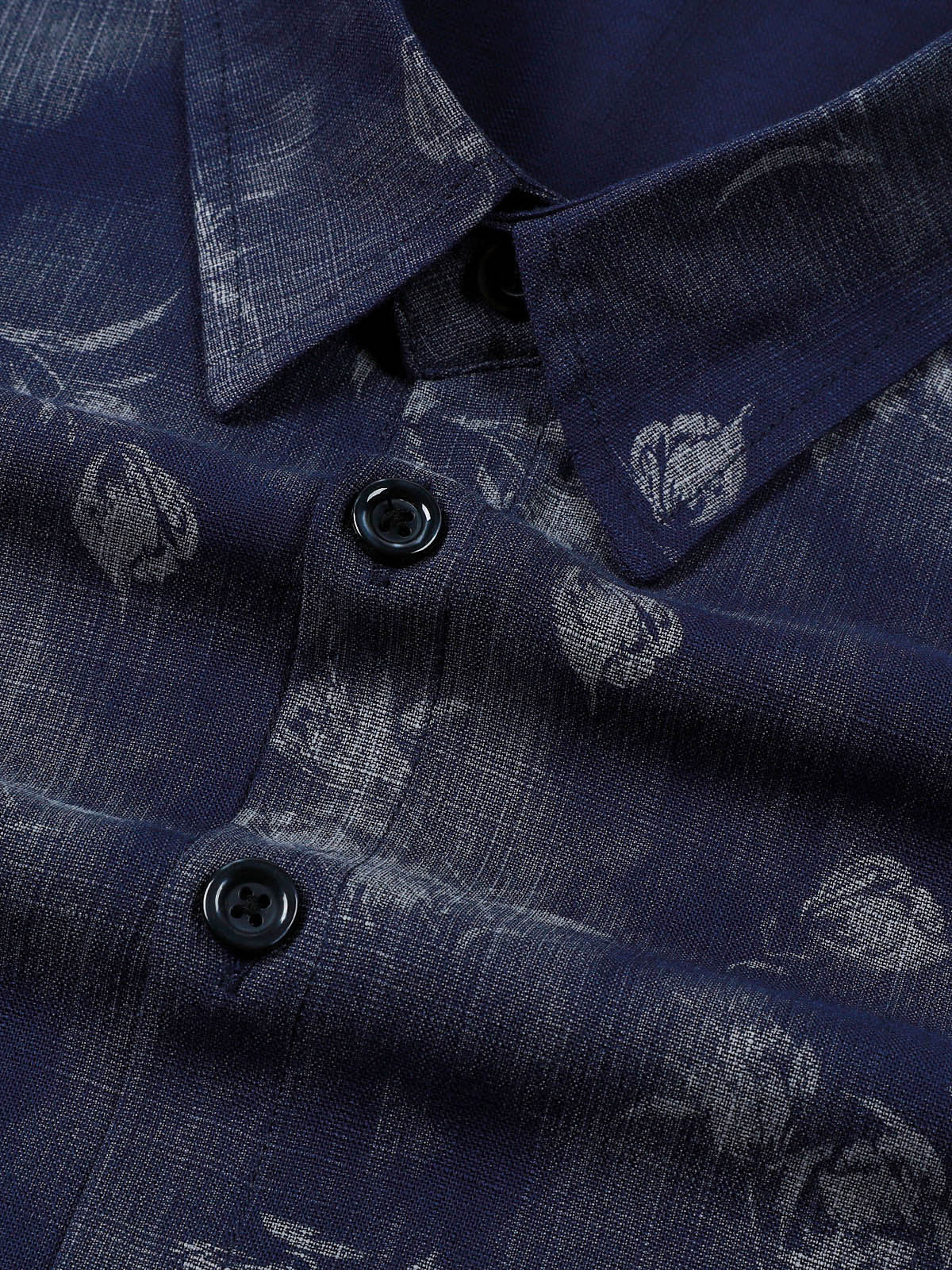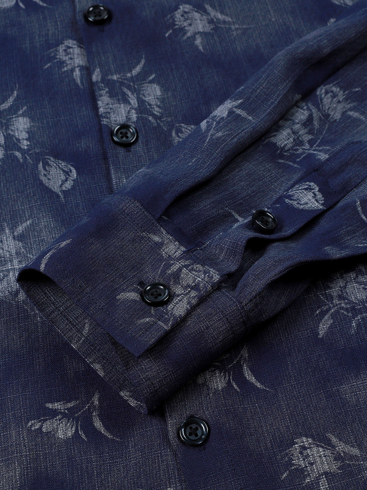 Men's Navy Blue Vintage Floral Print Cotton Breathable Flower Button Long Sleeve Dress Shirt