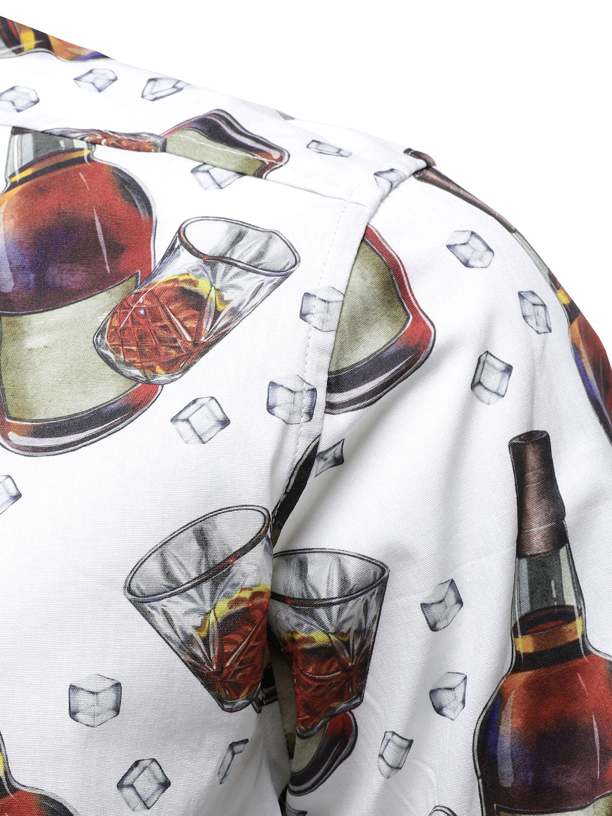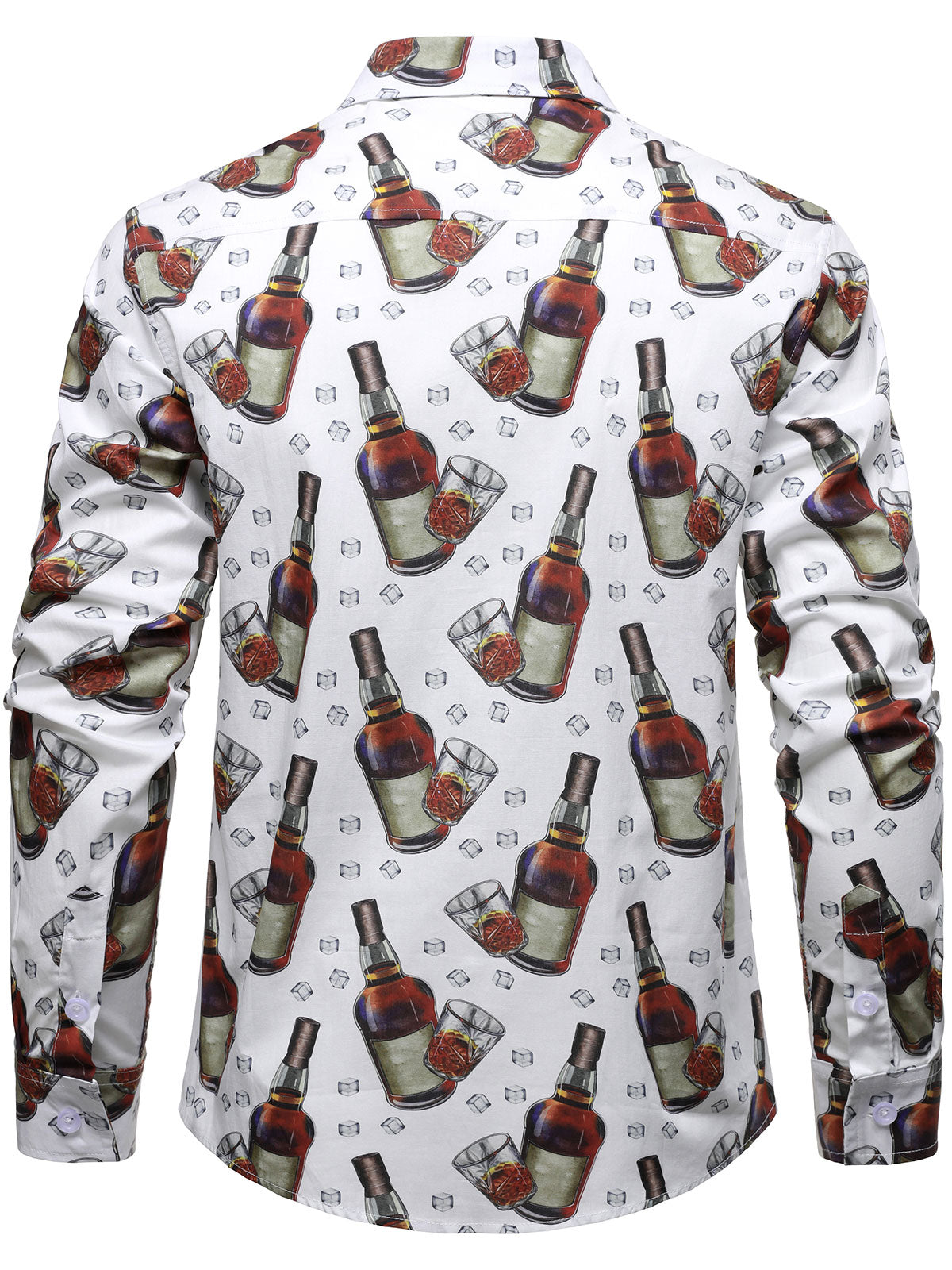 Men's Casual Holiday Wine Glass Print Button Up Long Sleeve Cotton Party Shirt