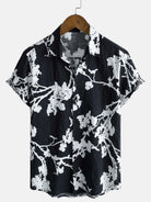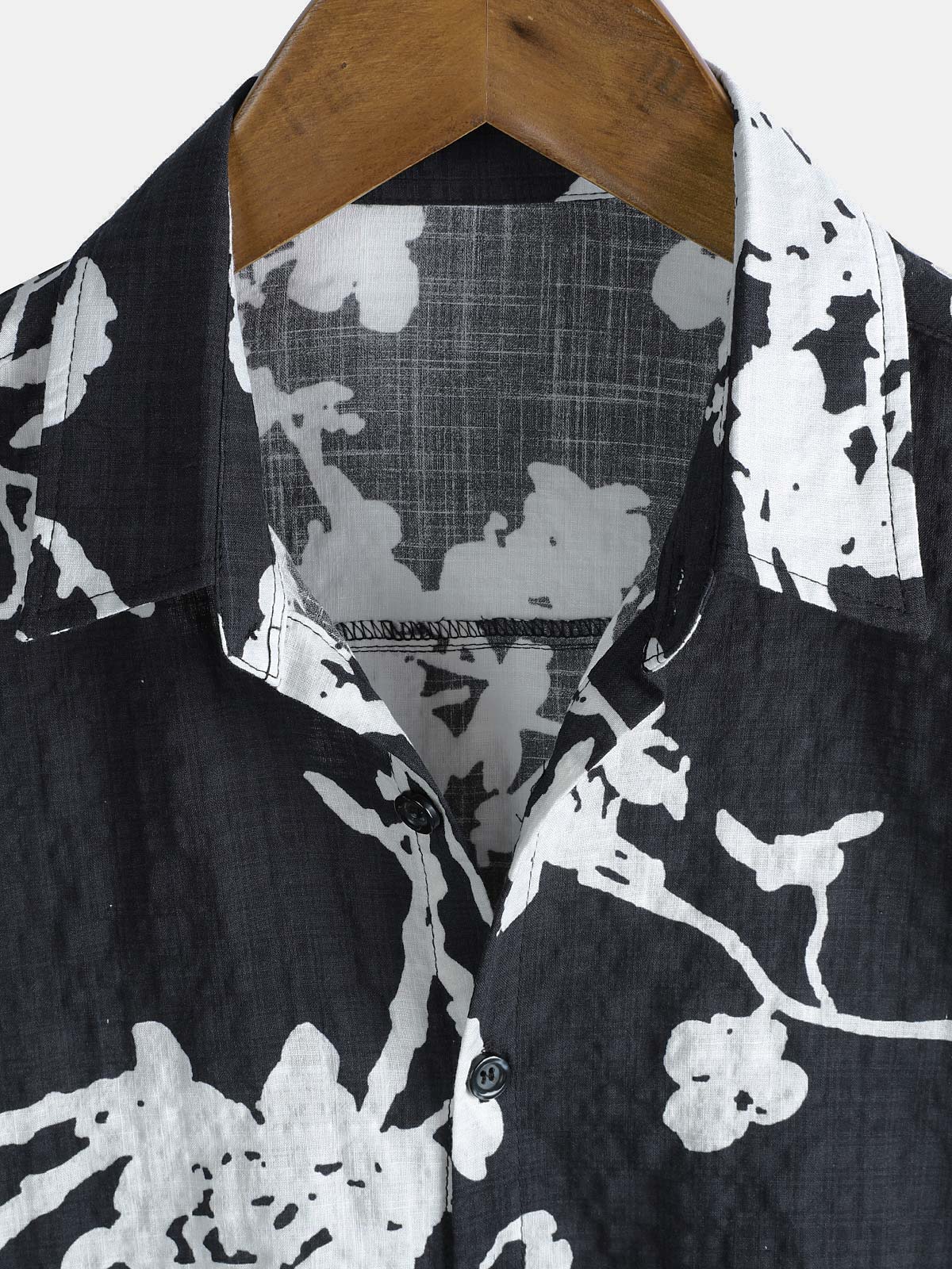 Men's Black and White Hawaiian Floral Breathable Cotton Casual Button Down Shirt