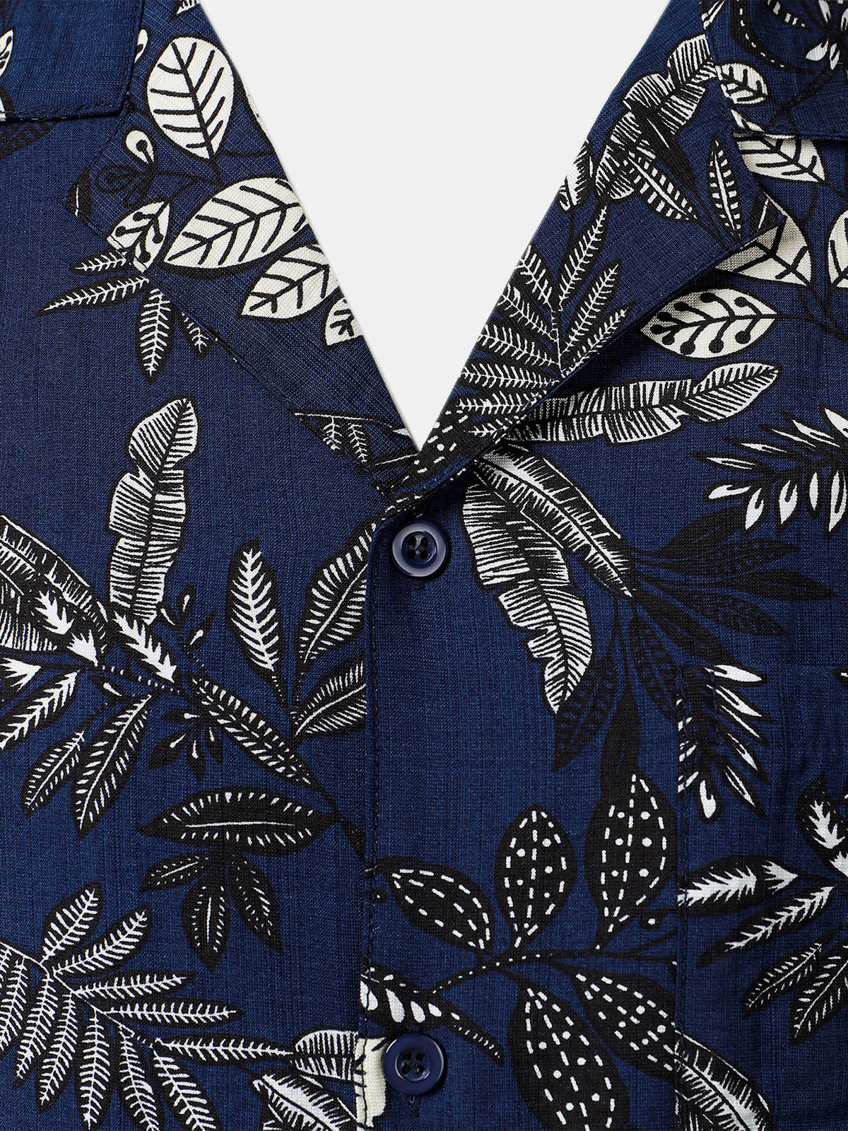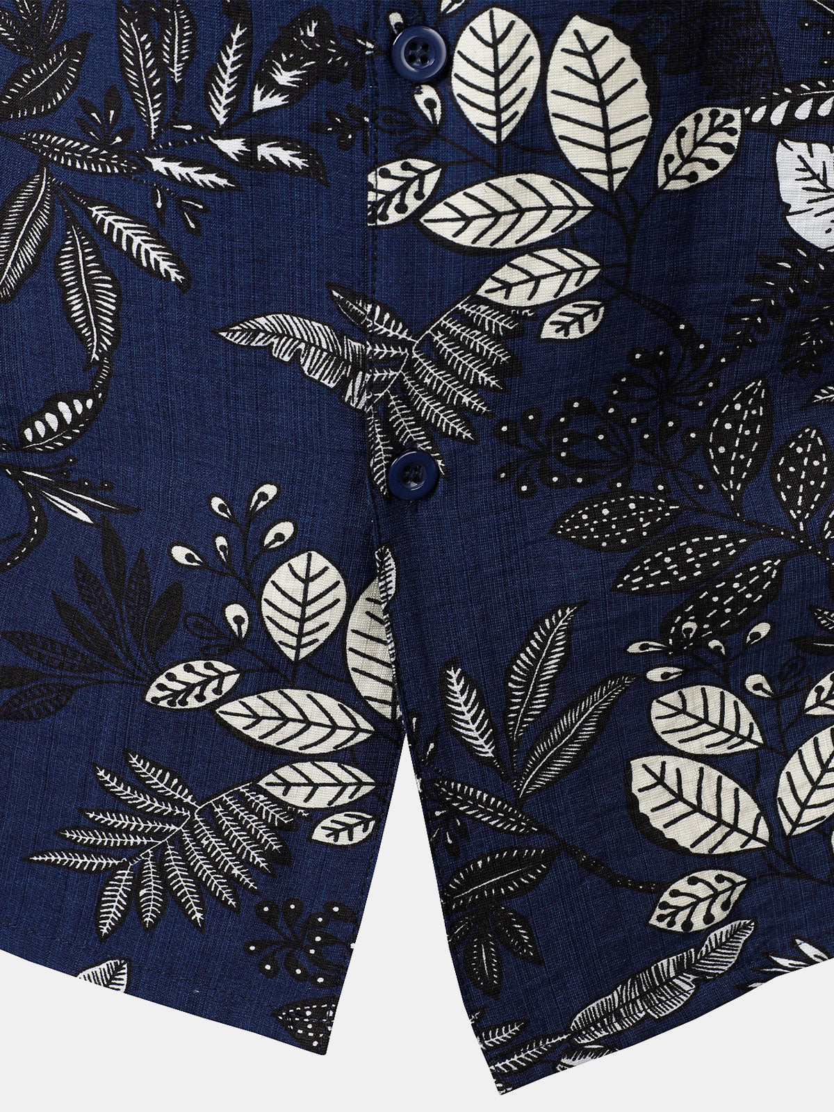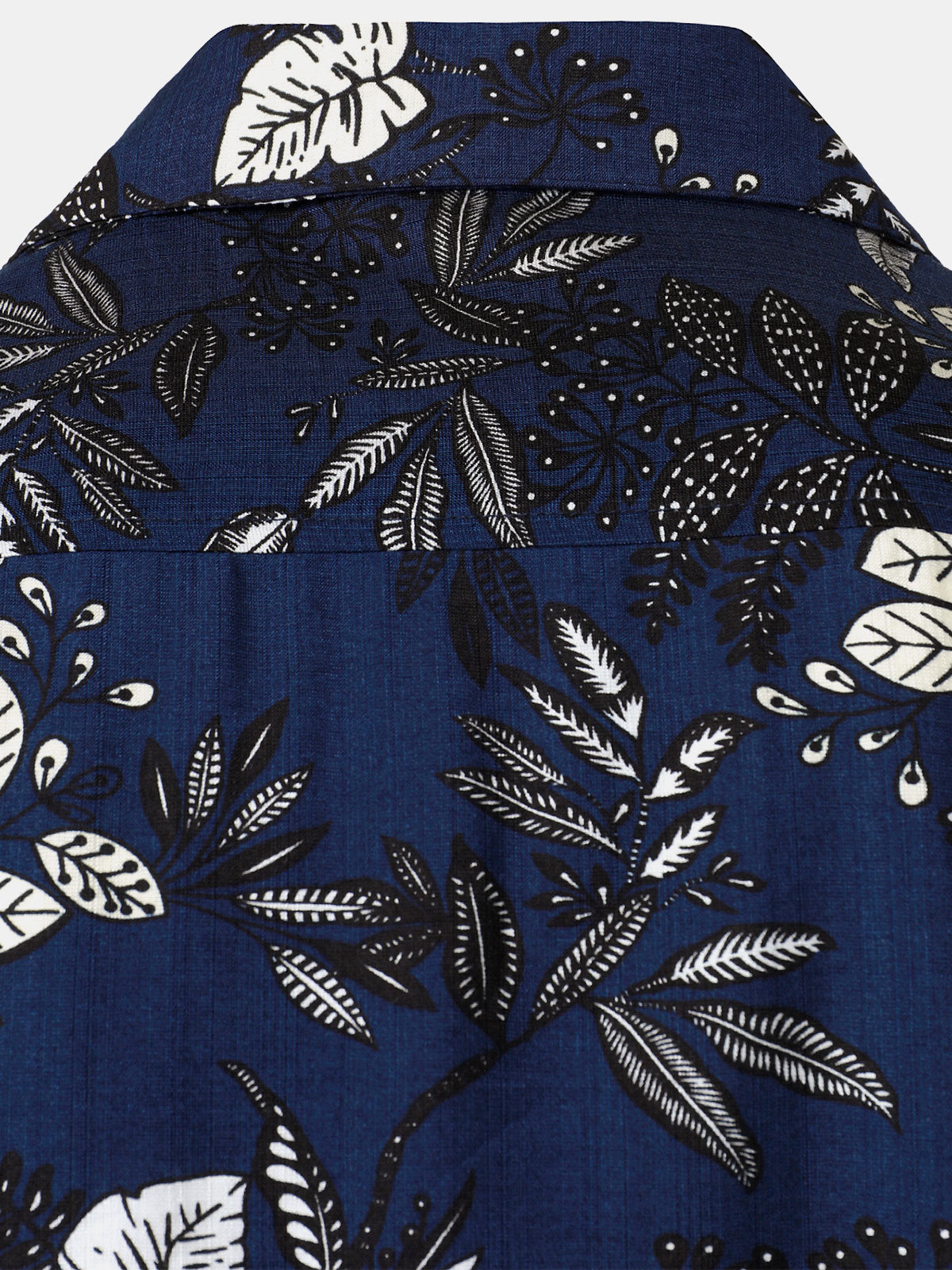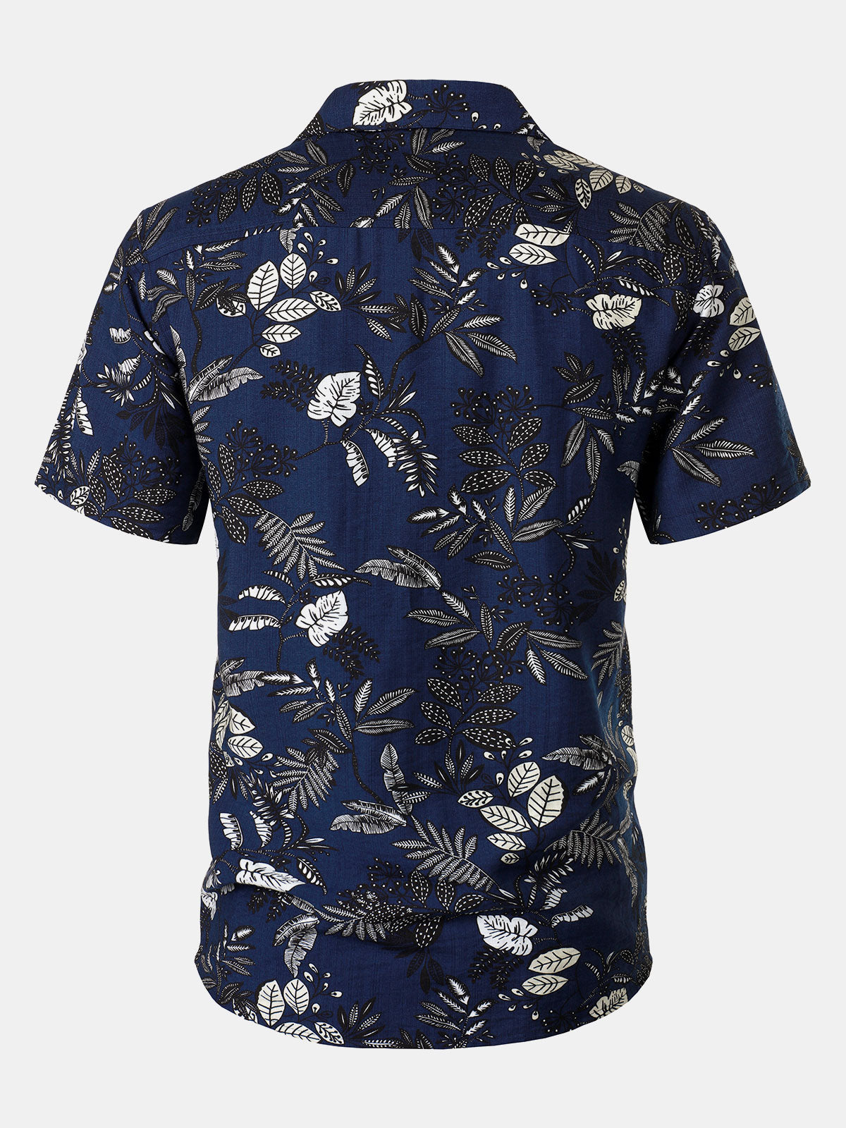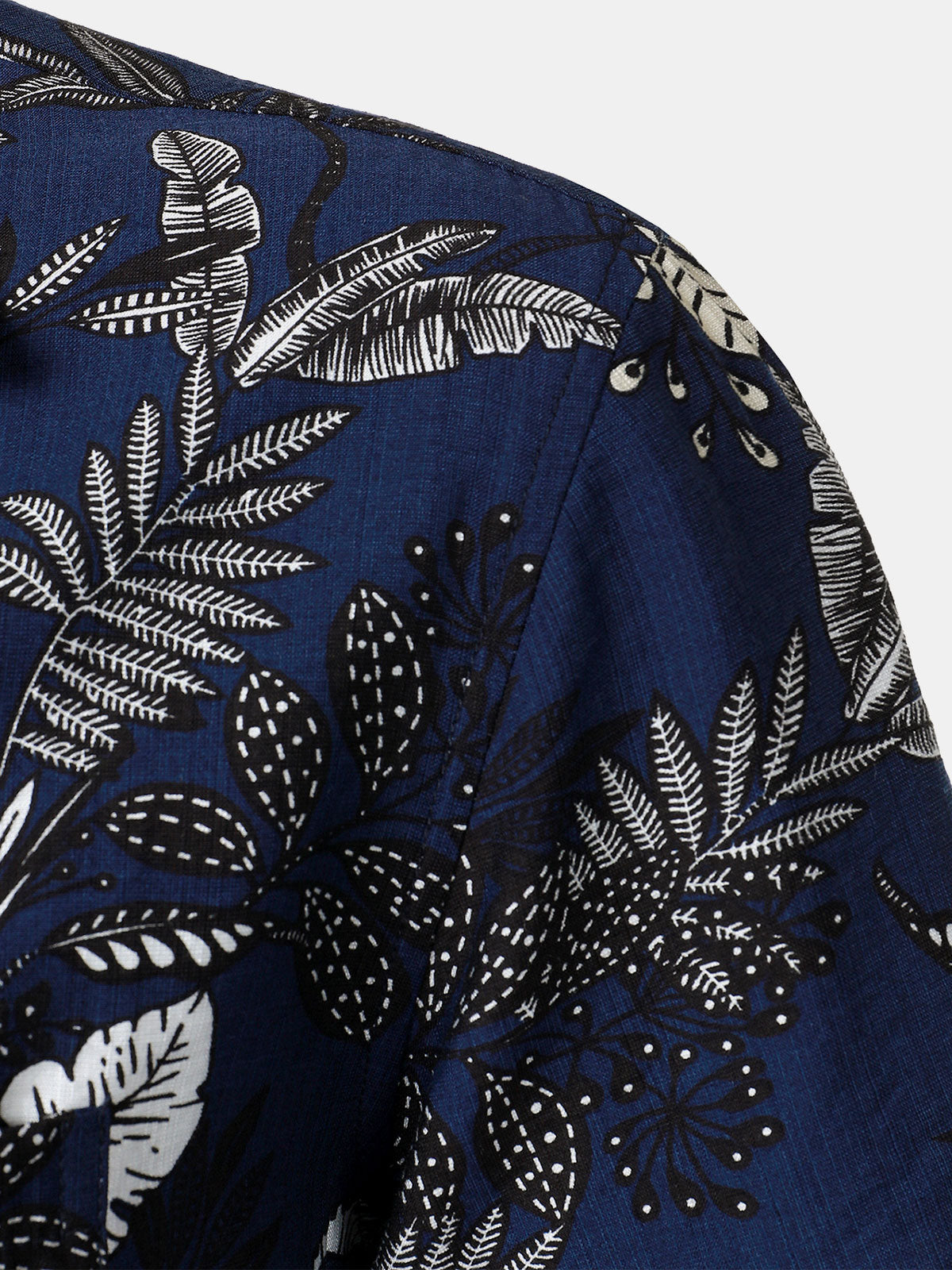 Men's Navy Blue Tropical Leaf Print Casual Hawaiian Shirt