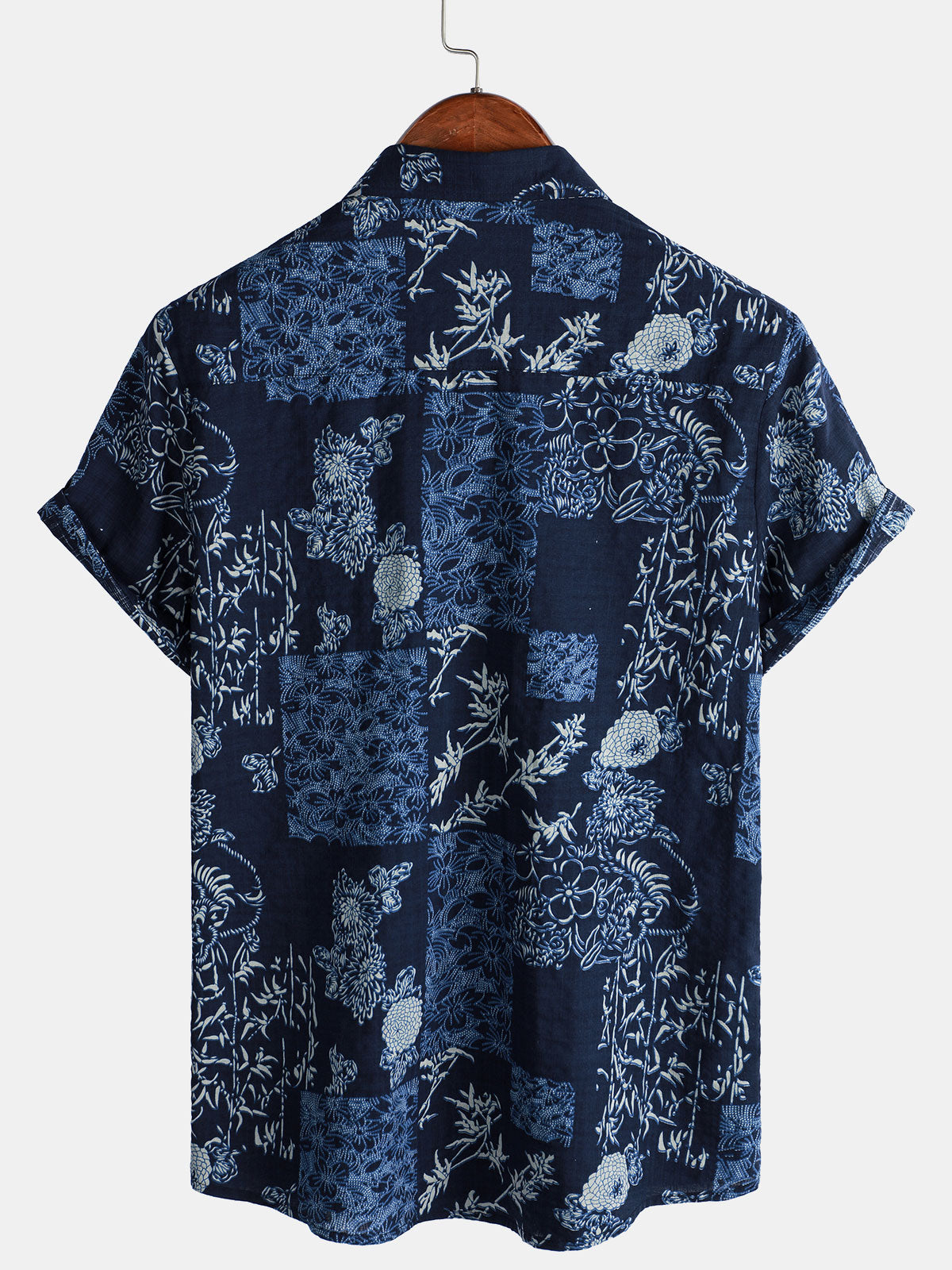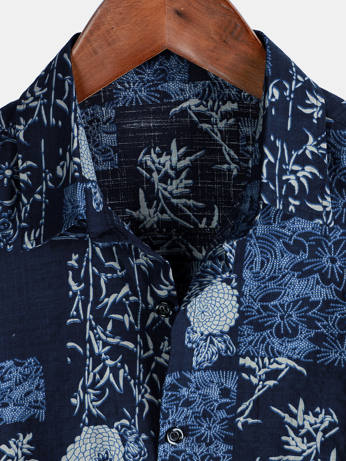 Men's Retro Navy Blue Floral Summer Short Sleeve Shirt