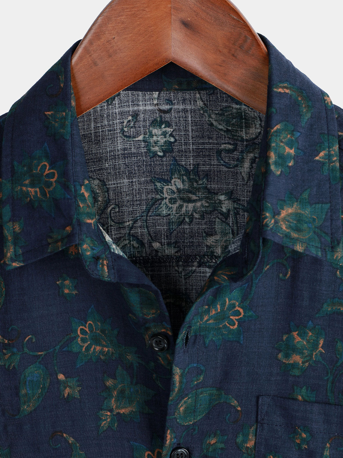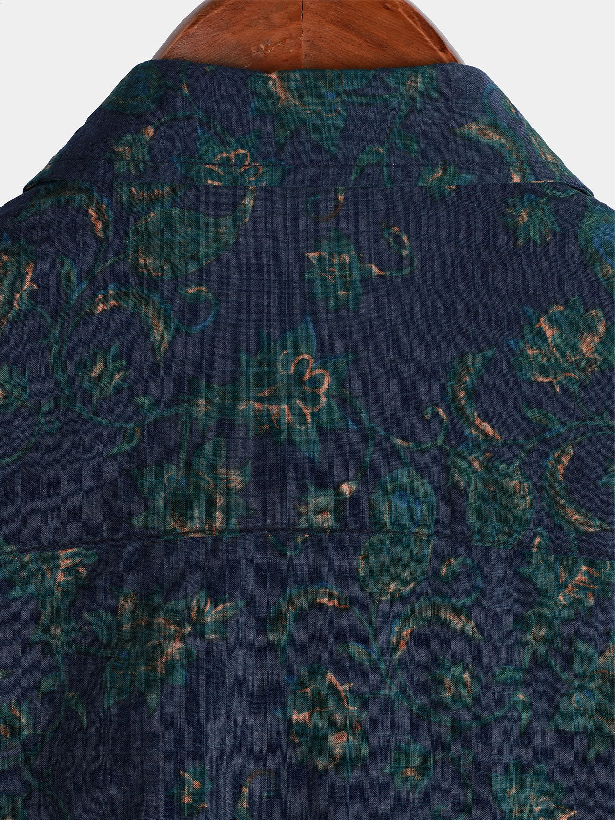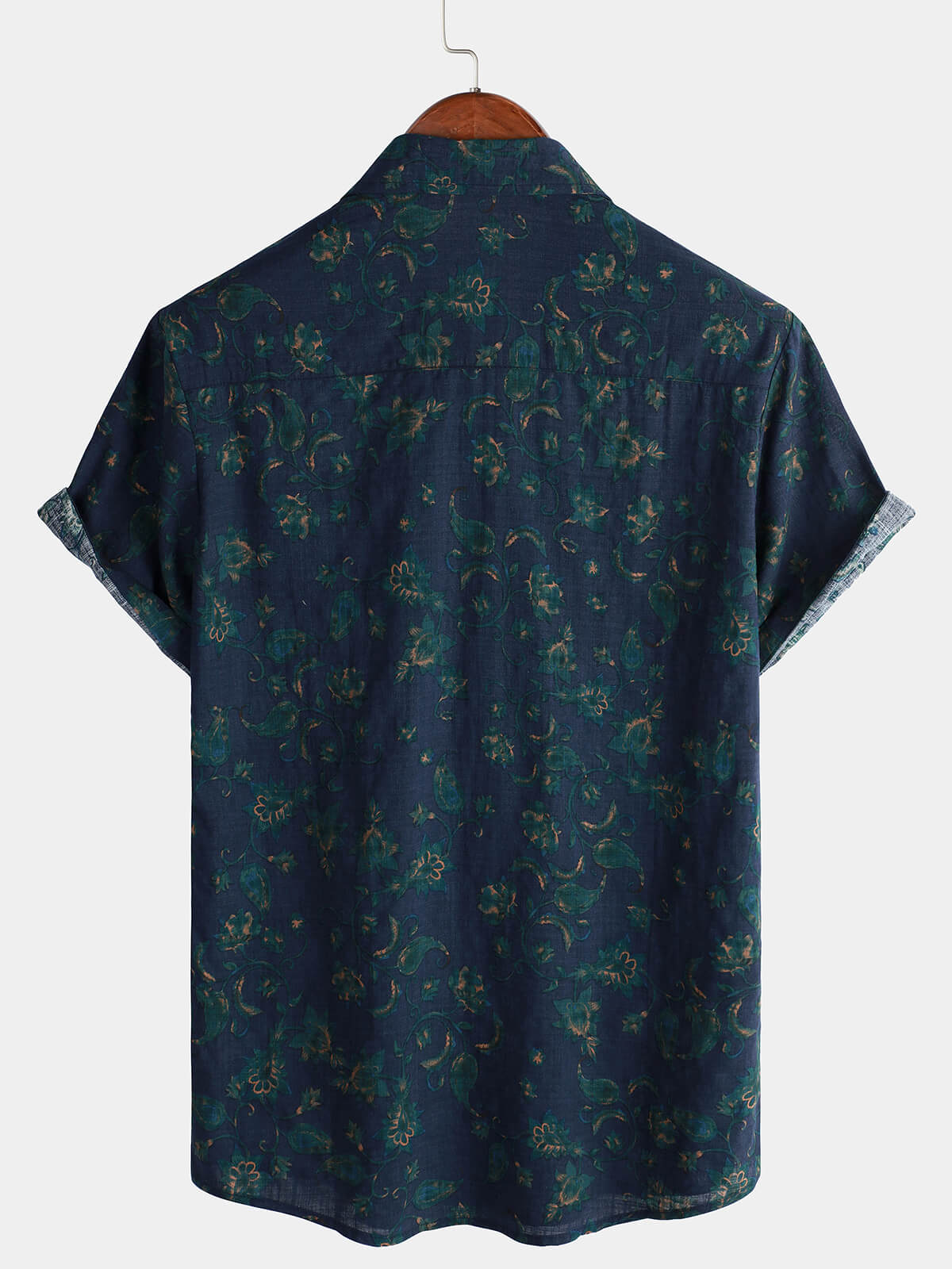 Men's Blue Floral Holiday Casual Pocket Short Sleeve Button Up Shirt