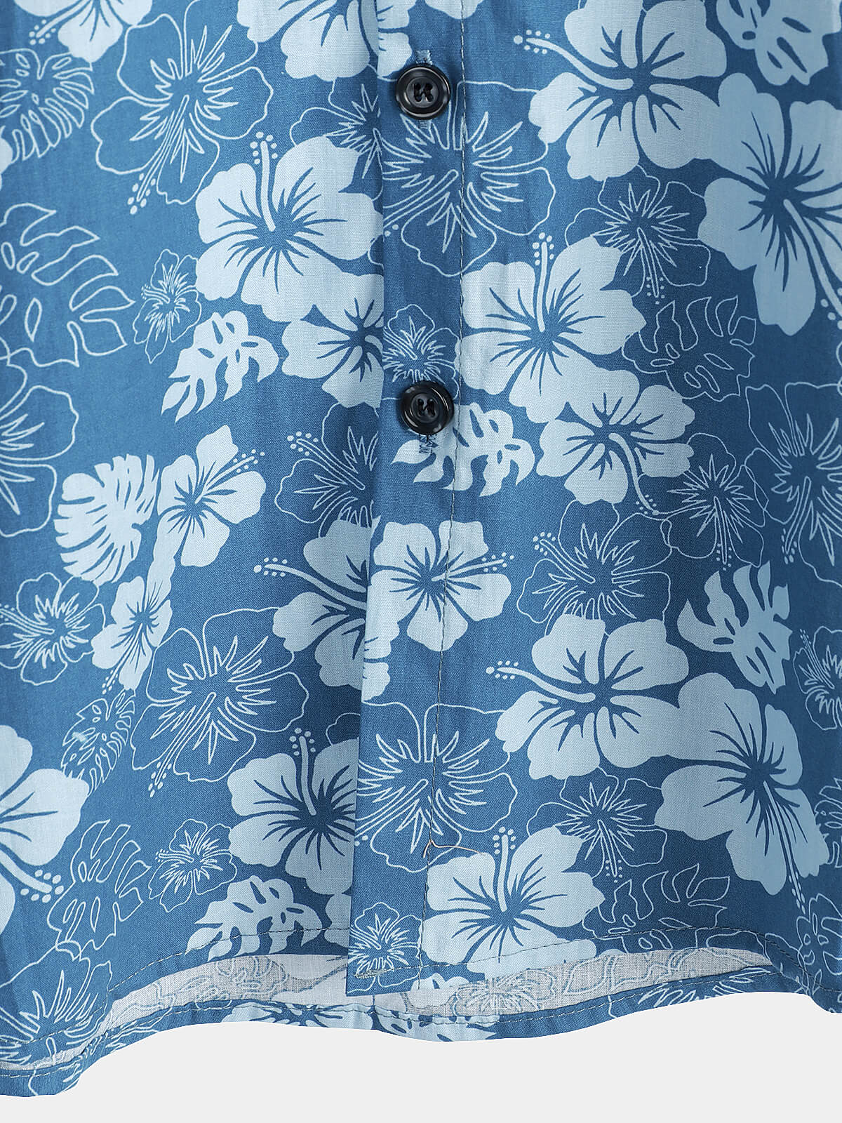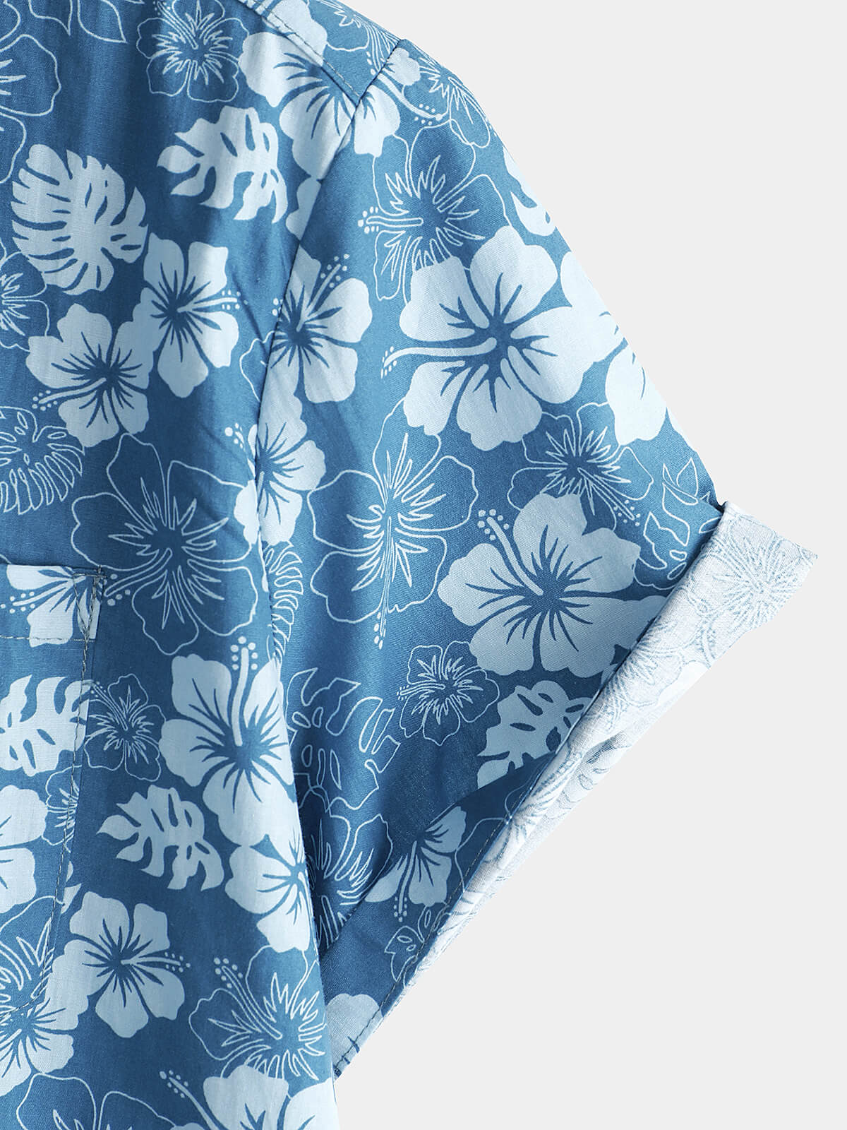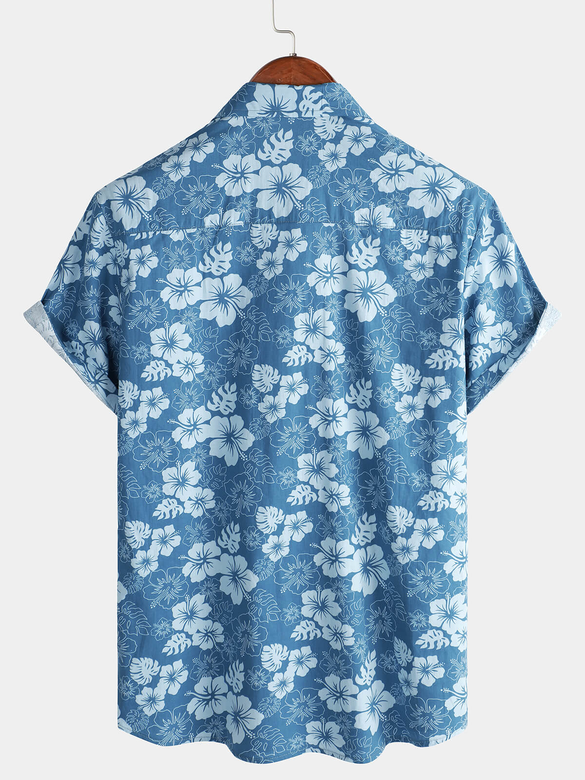 Men's Blue Hawaiian Floral Holiday Casual Pocket Short Sleeve Button Up Shirt