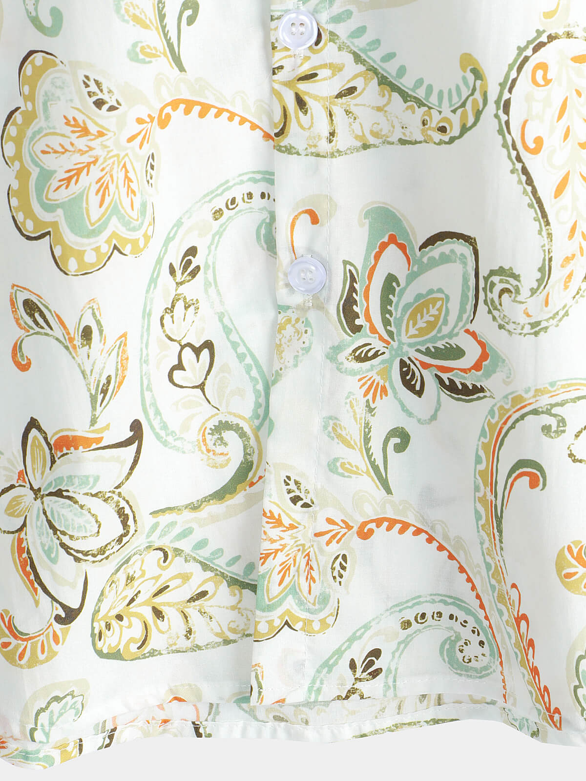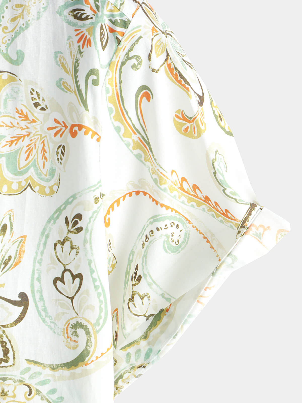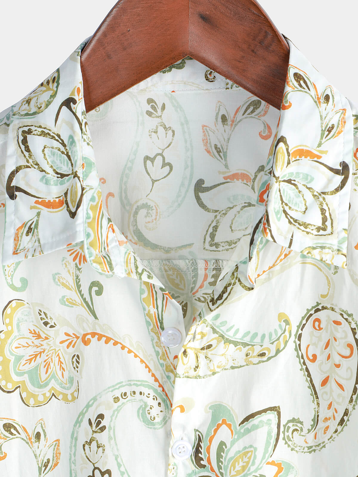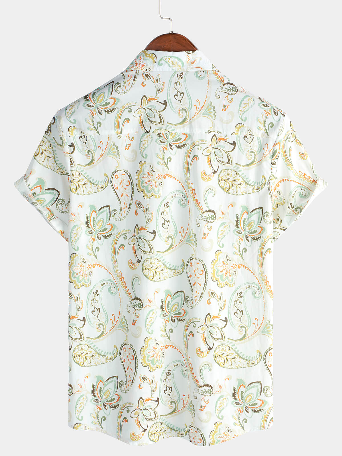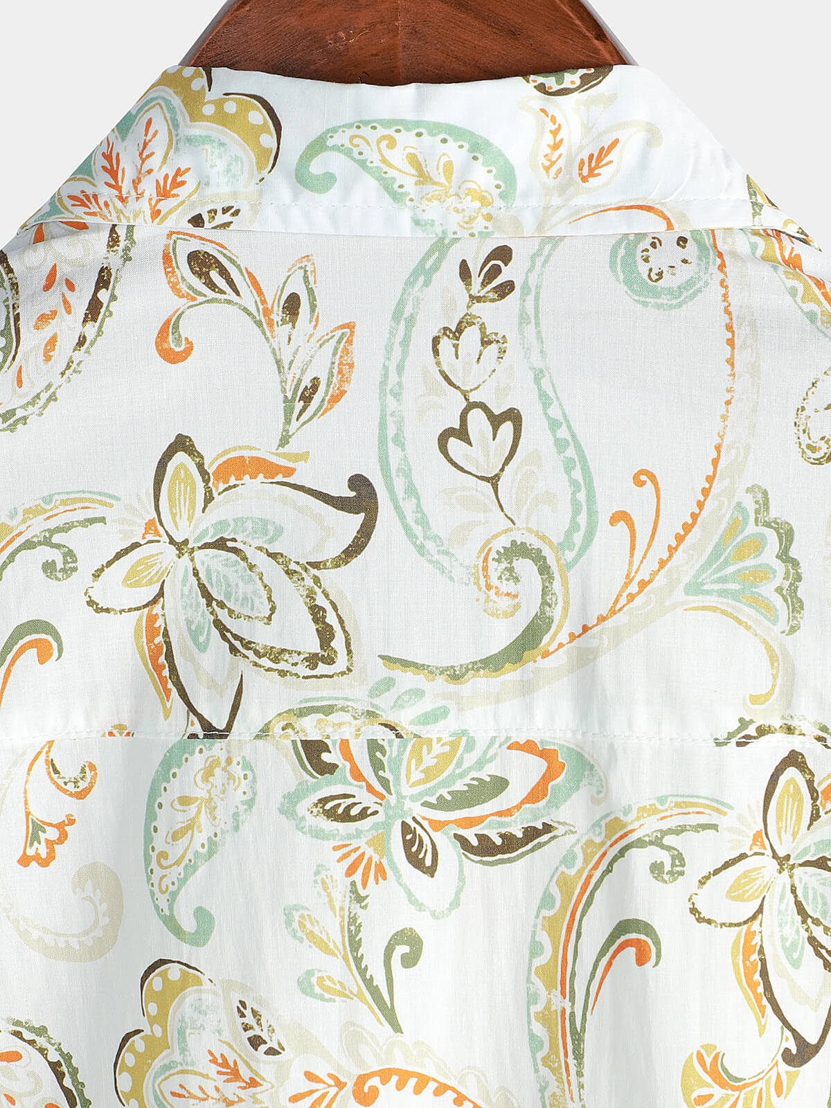Men's Short Sleeve White Holiday Summer Paisley Floral Button Up Hawaiian Cotton Shirt