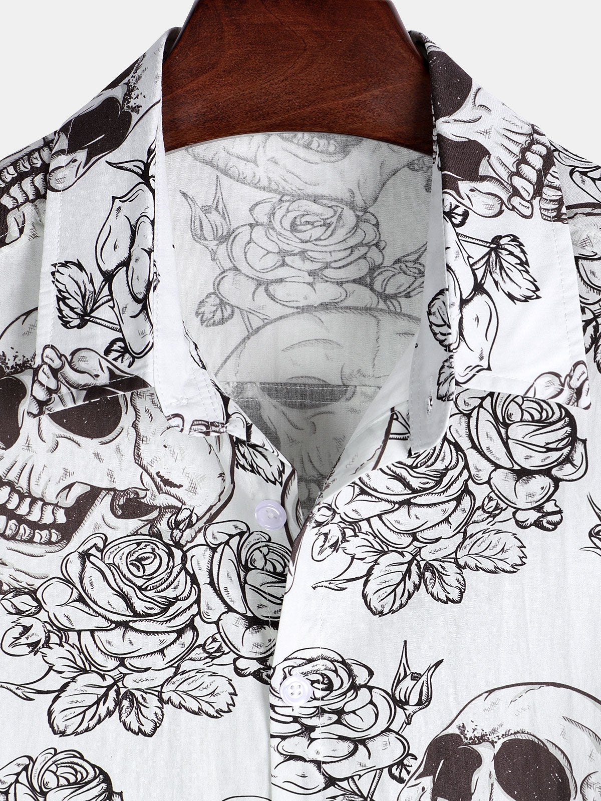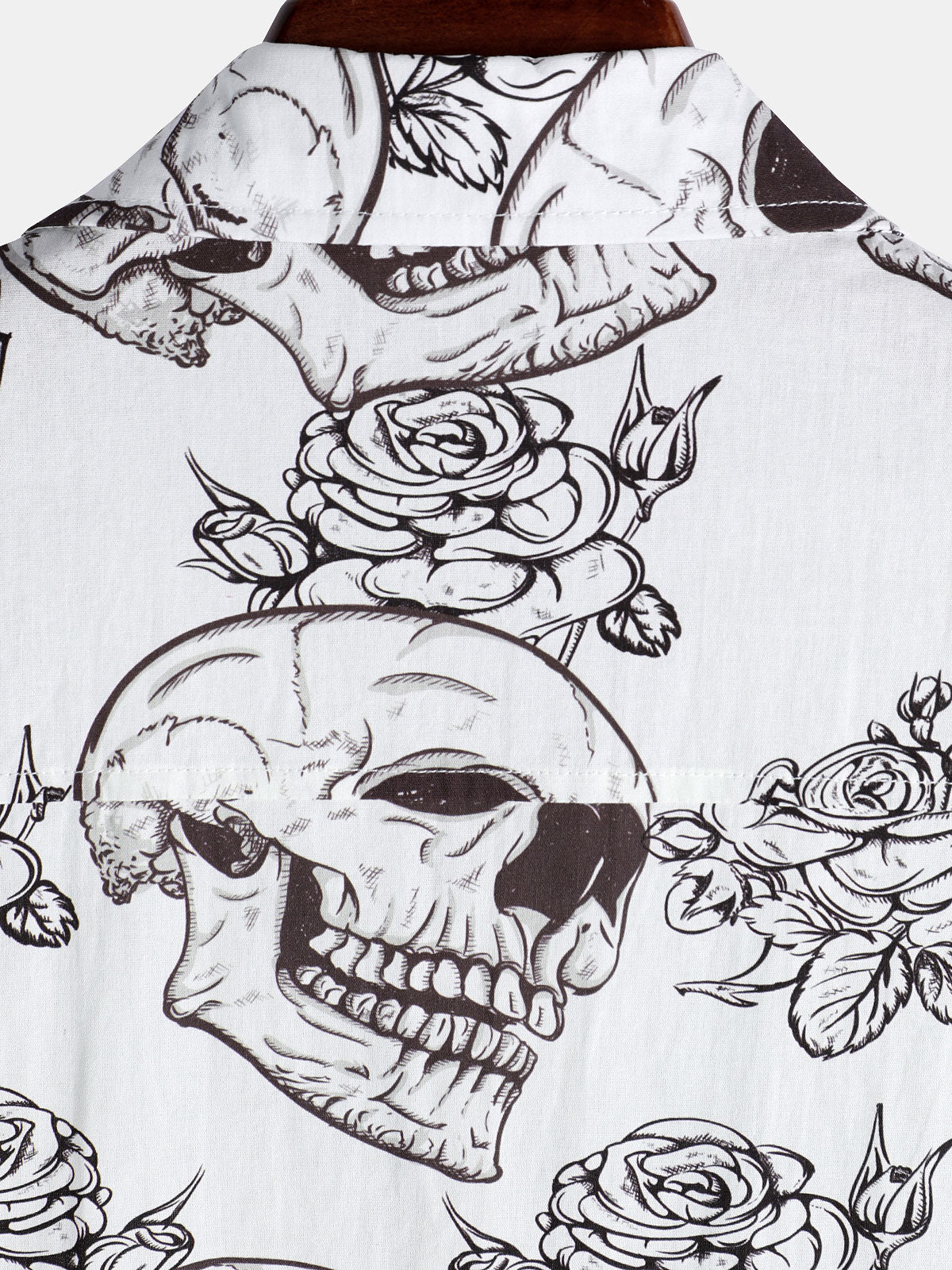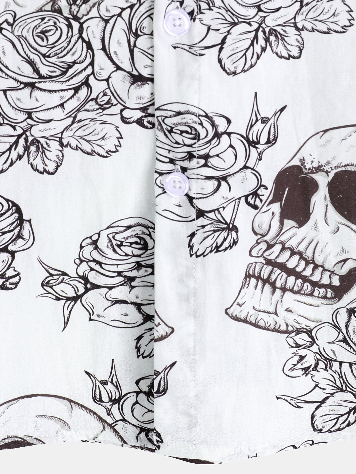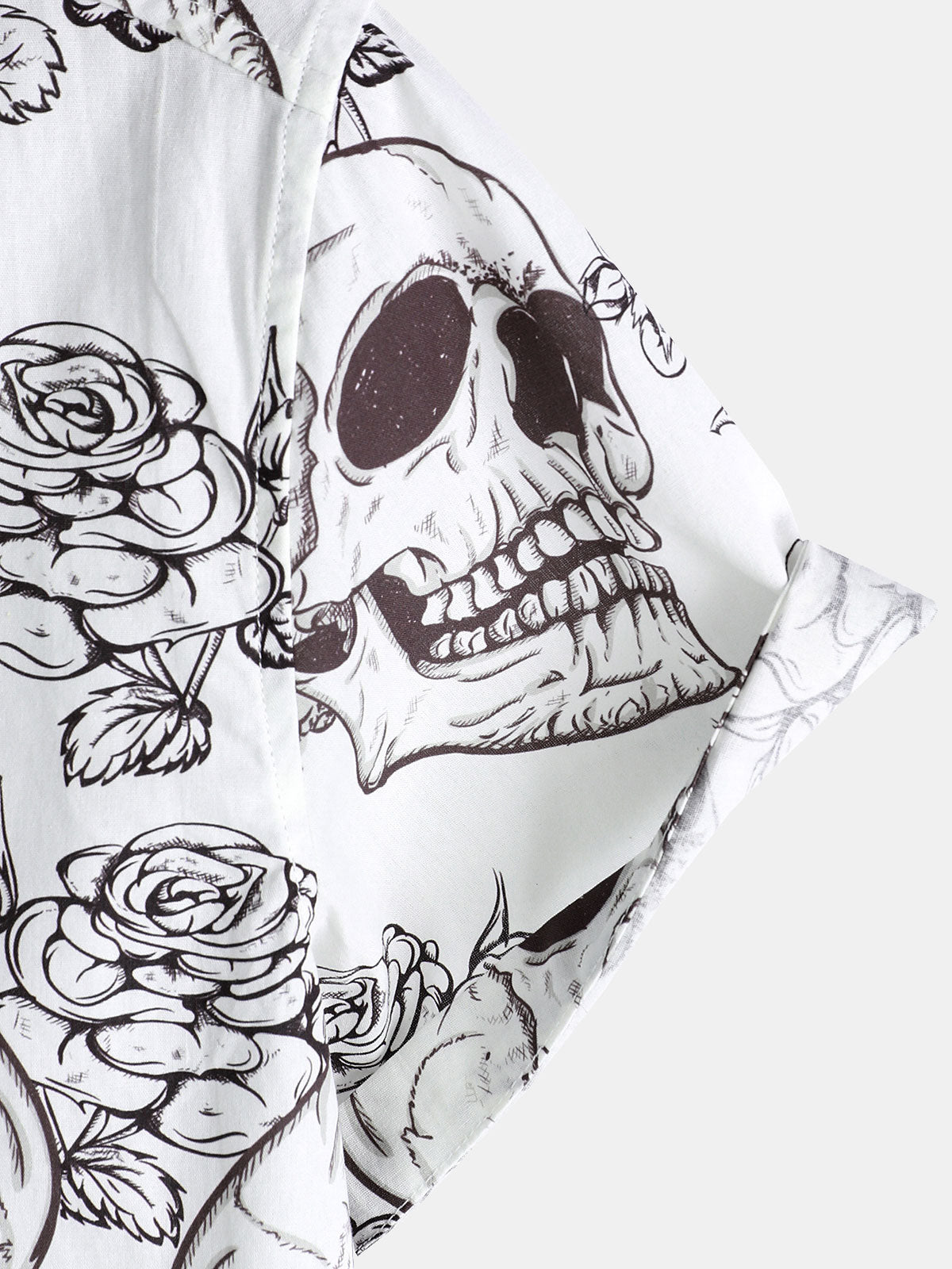 Men's Rose Flower Skull Graphic Button Up Short Sleeve Punk Rock Art Shirt