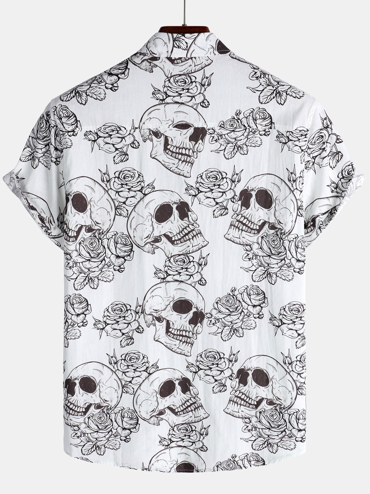Men's Floral Print Cool Skull Casual Holiday Button Short Sleeve Shirt