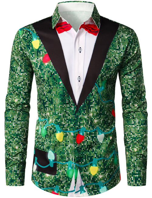 Men's Christmas Tree Funny Outfit Xmas Themed Top Holiday Green Button Long Sleeve Shirt