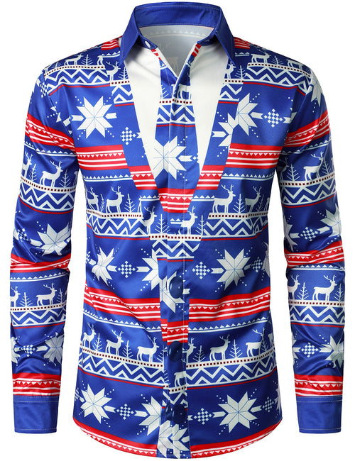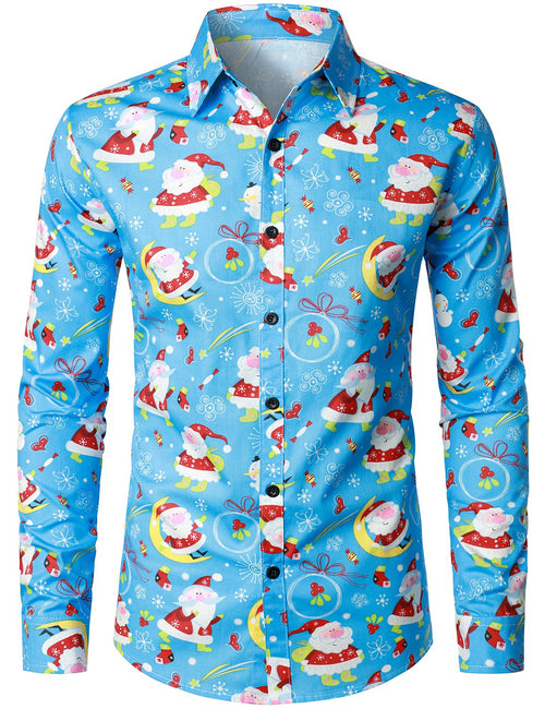 Men's Christmas Print Regular Fit Blue Long Sleeve Santa Dress Shirt