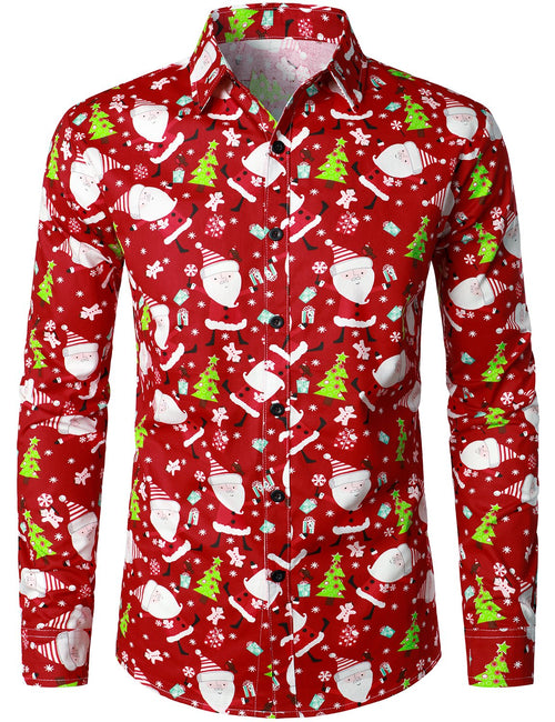 Men's Christmas Print Holiday Regular Fit Red Button Long Sleeve Dress Shirt