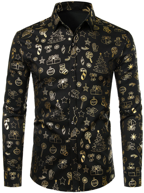 Men's Christmas Gold Print Xmas Party Button Up Long Sleeve Dress Shirt