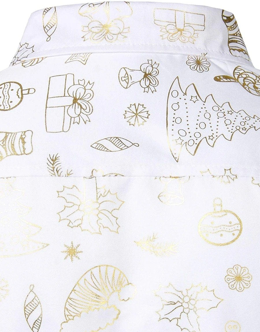 Men's Christmas Gold Print Xmas Party Button Up Long Sleeve Dress Shirt
