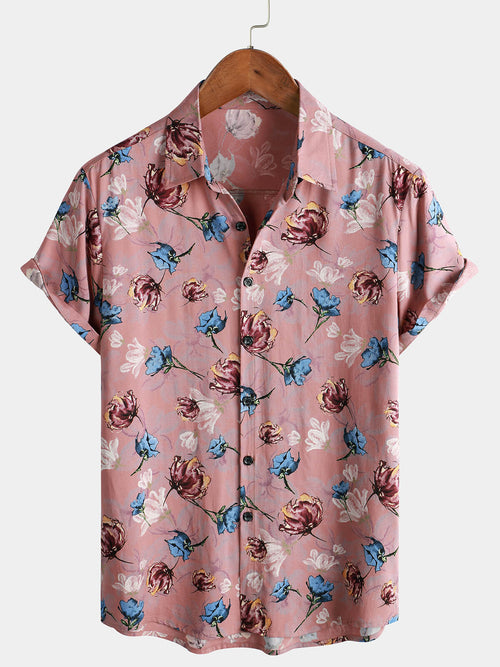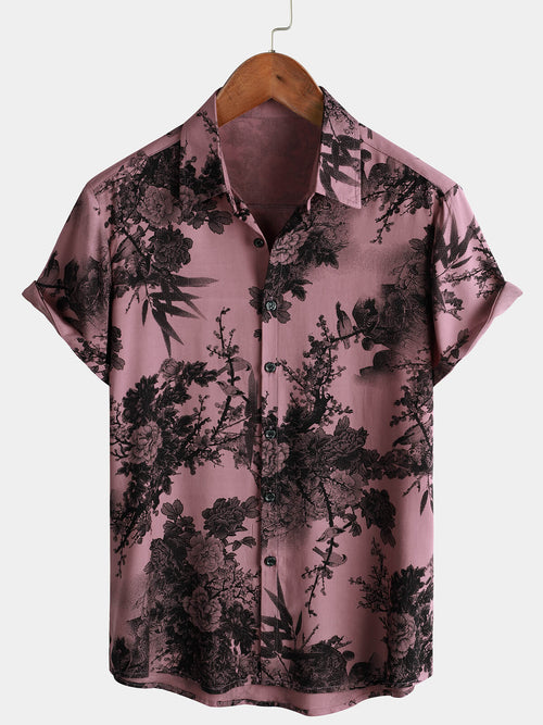 Men's Vintage Floral Print Summer Casual Pink Short Sleeve Shirt