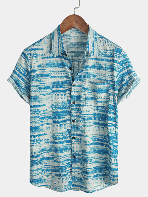 Men's Blue Cotton Retro Button Up Striped Vintage Summer Short Sleeve Shirt