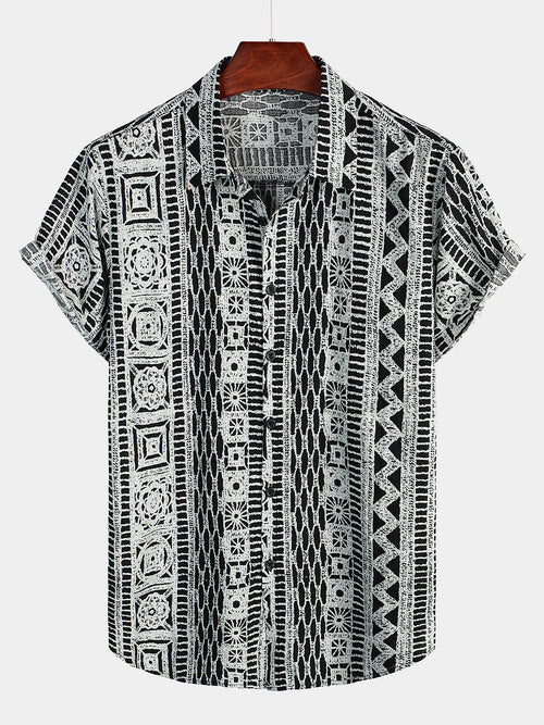 Men's Vintage Vertical Striped Short Sleeve 70s Retro Aztec Print Button Up Shirt