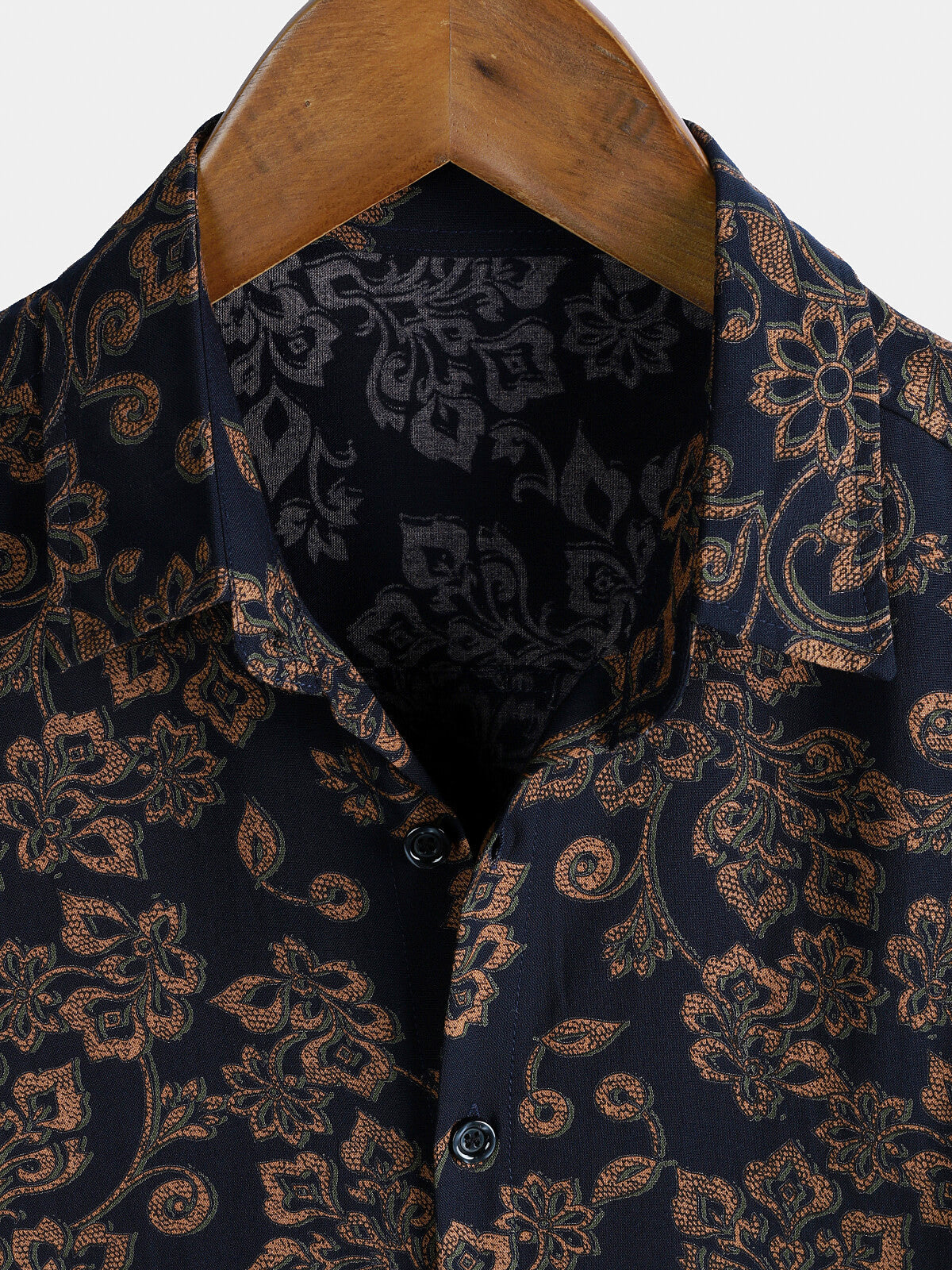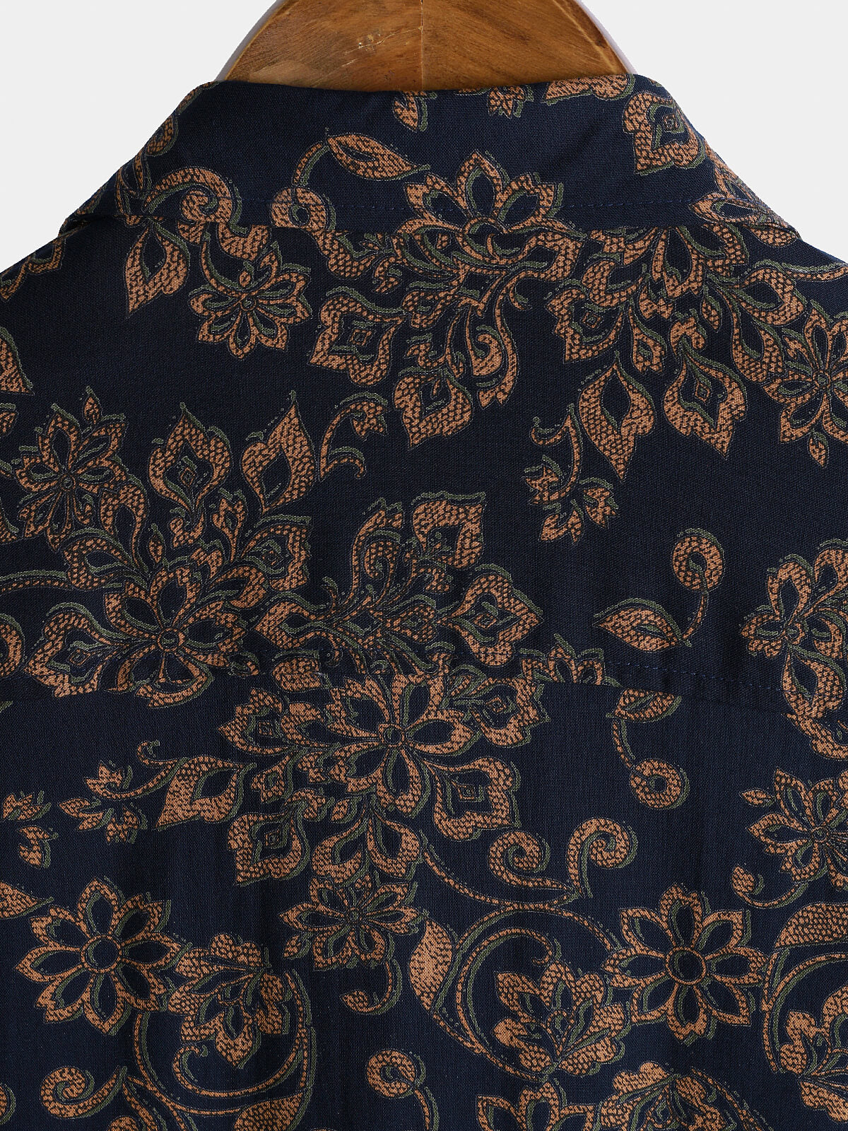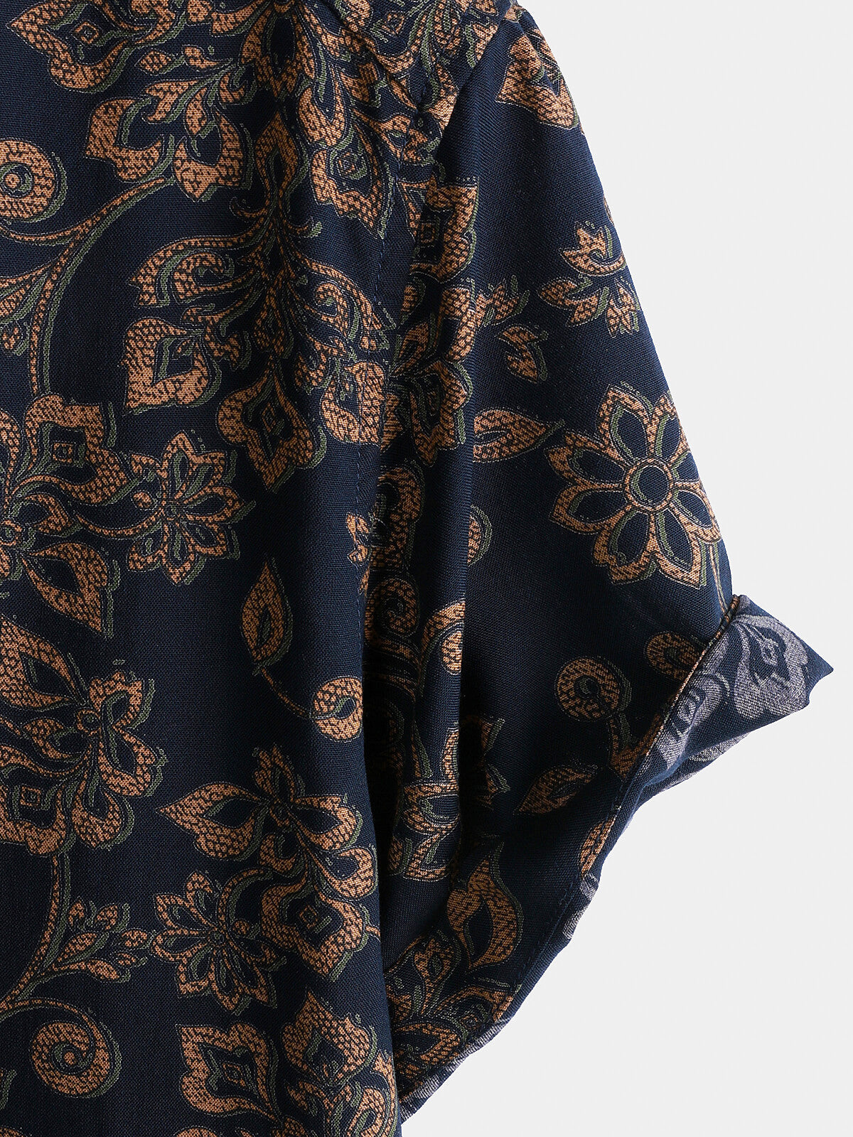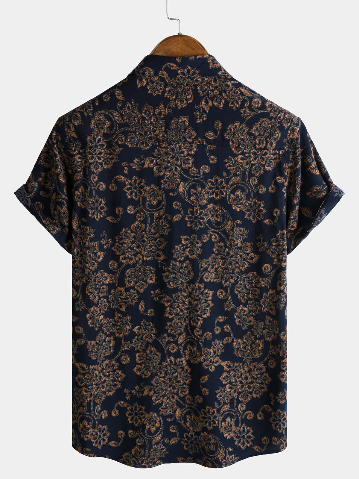 Men's Rayon Navy Paisley Print Retro Boho Short Sleeve Shirt