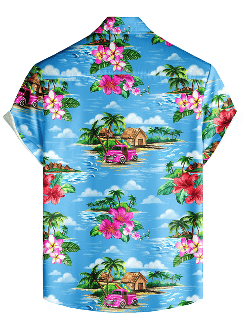 Men's Tropical Blue Leaf Vacation Short Sleeve Summer Button Up Hawaiian Shirt