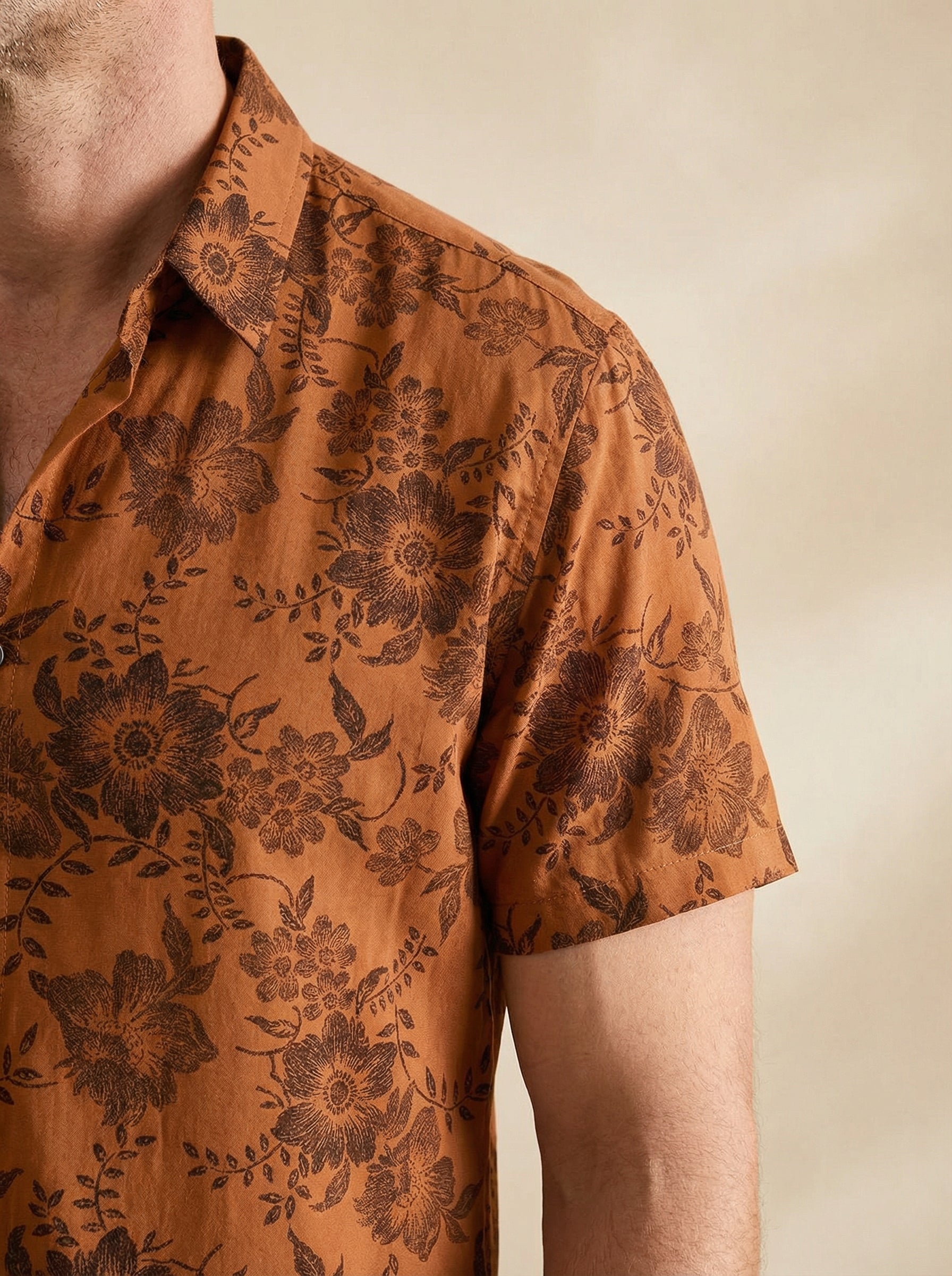 Men's Brown Floral Print Vintage Flower Holiday Breathable Short Sleeve Button Up Shirt