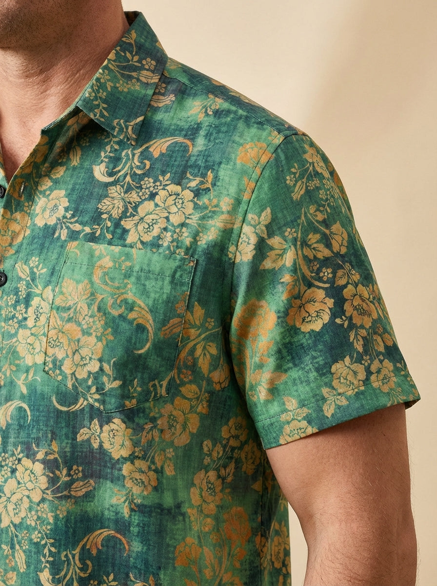 Men's Green Floral Print Pocket Short Sleeve Shirt