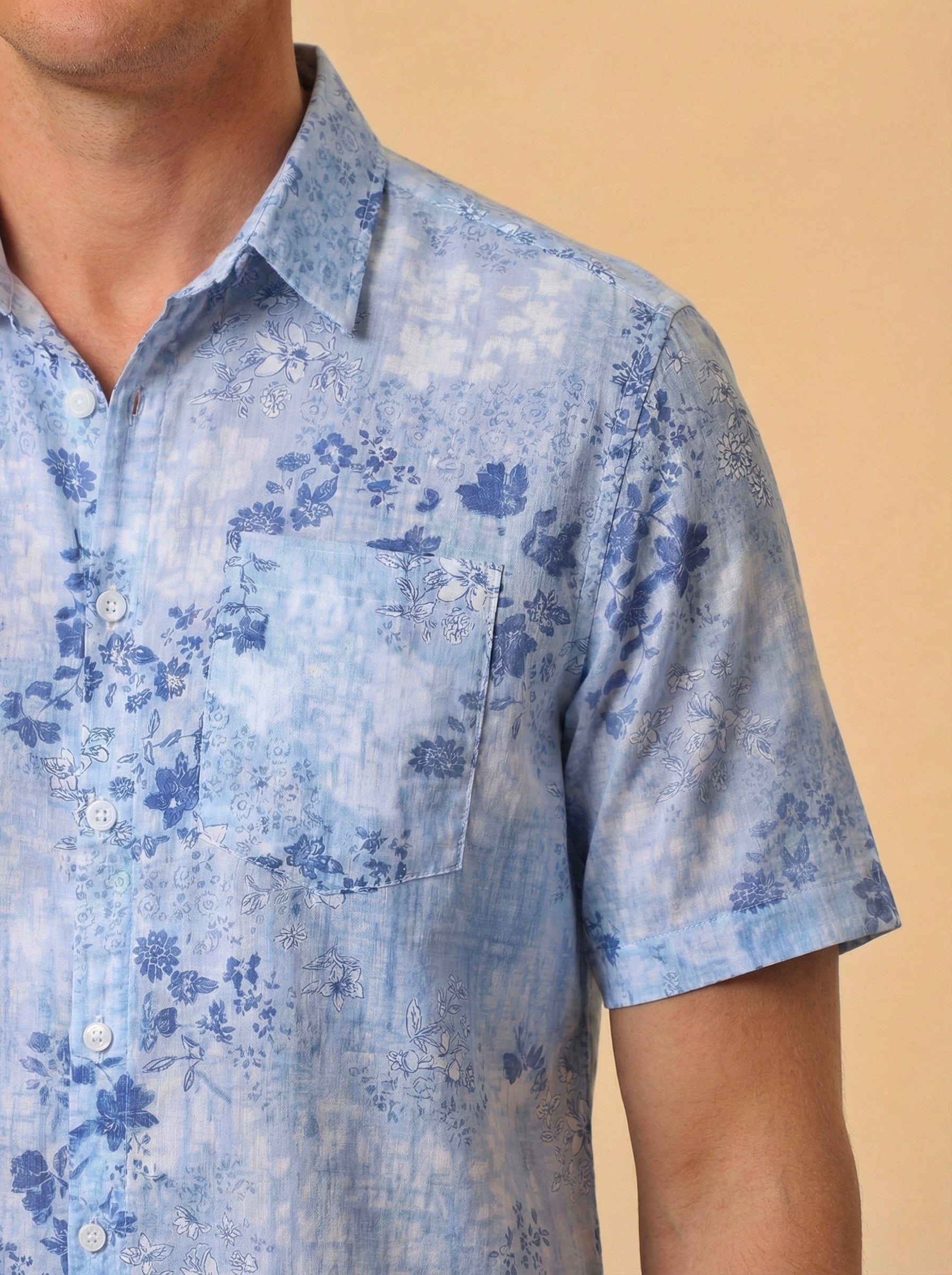 Men's Blue Floral Printed Button Up Casual Short Sleeve Shirt
