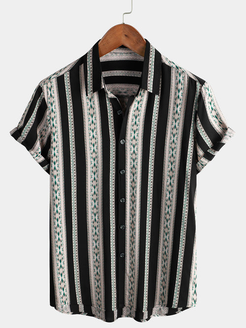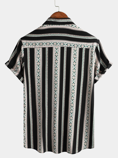 Men's Green Striped Vintage Short Sleeve 70s Aztec Print Western Button Retro Shirt