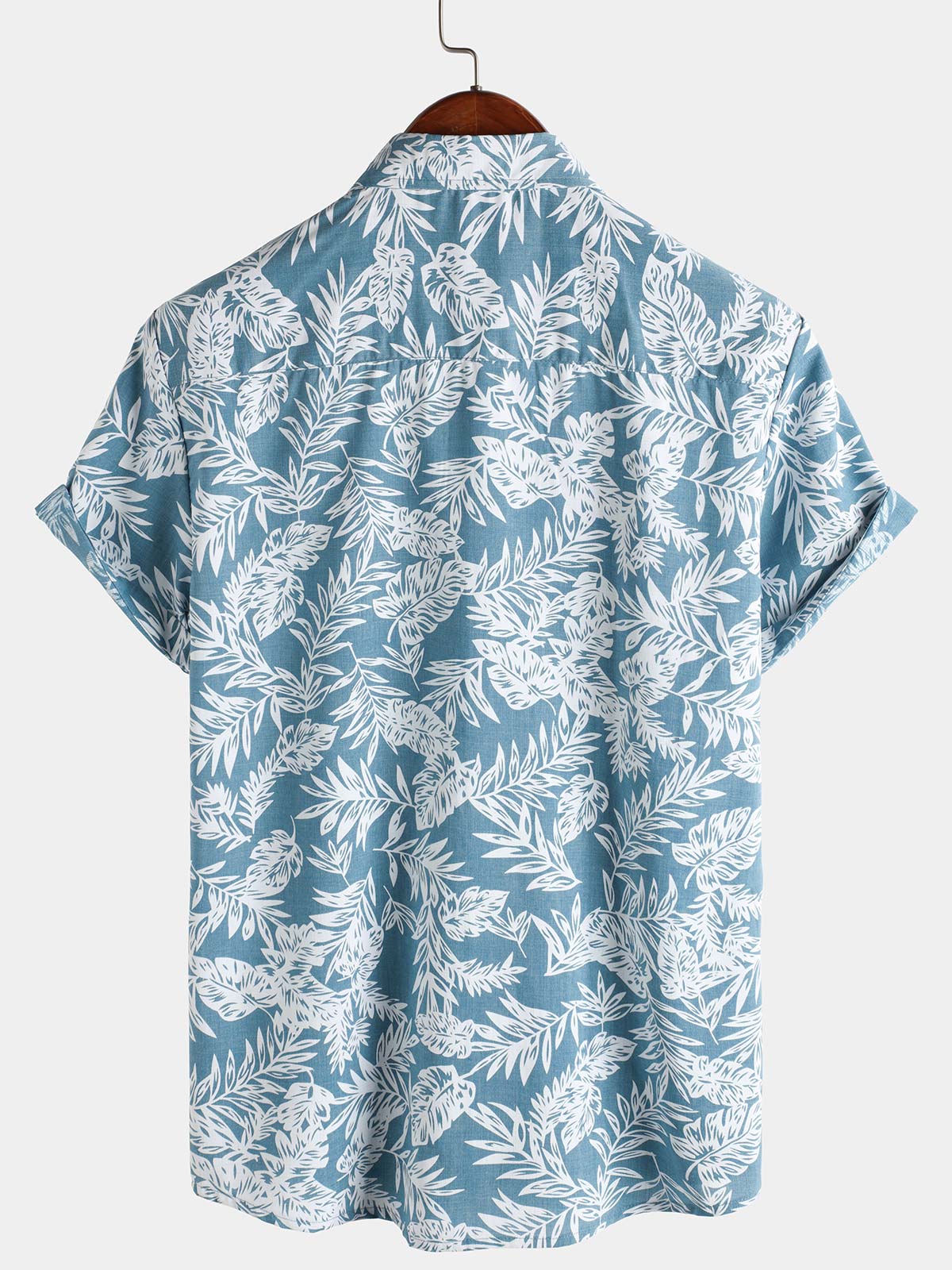 Men's Retro Beach Hawaiian Cotton Holiday Button Up Blue Short Sleeve Floral Shirt