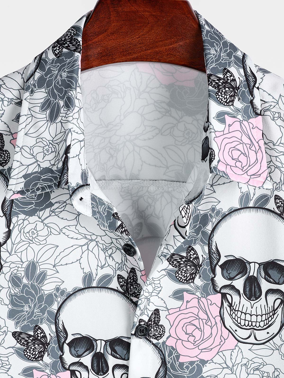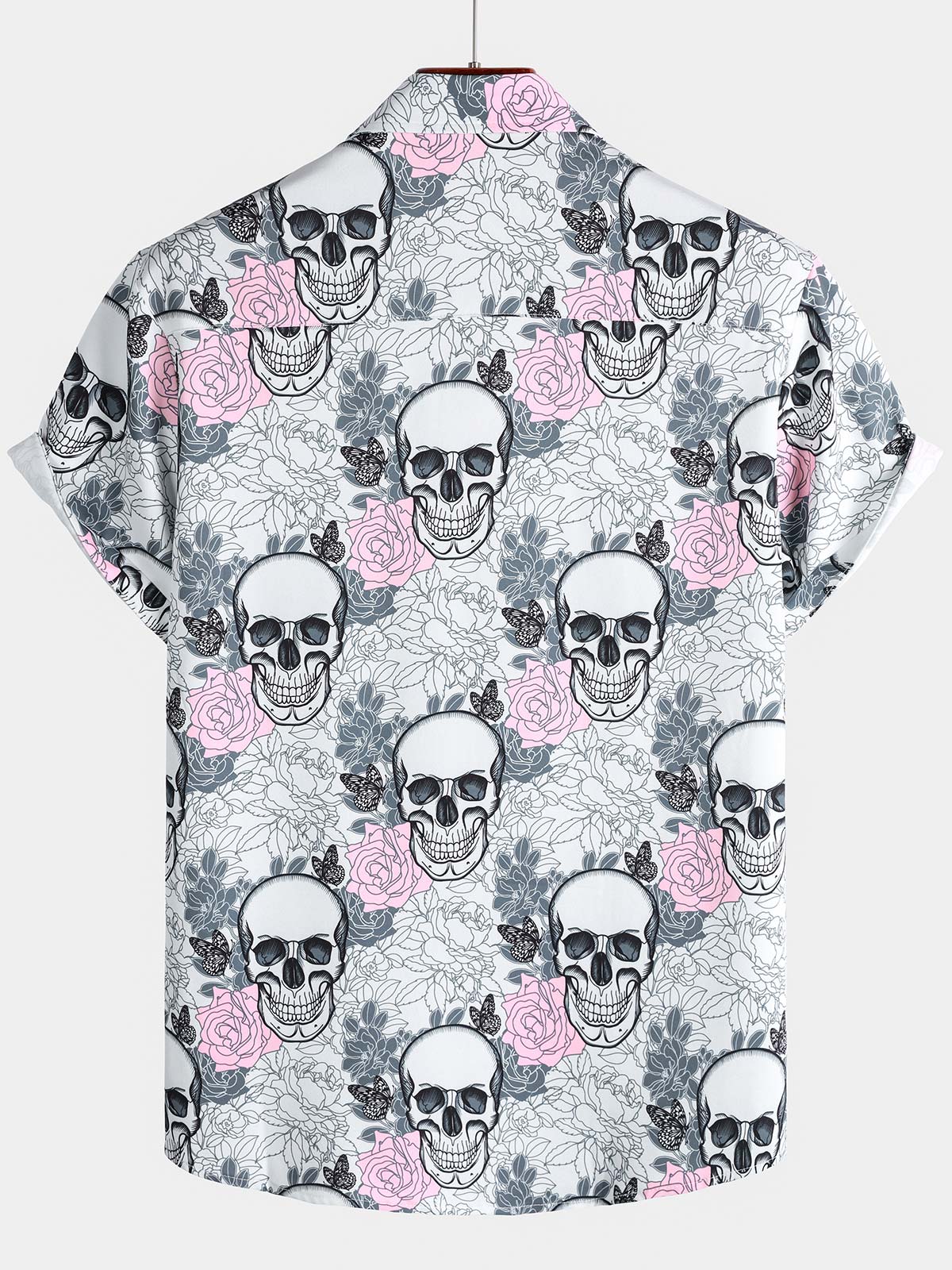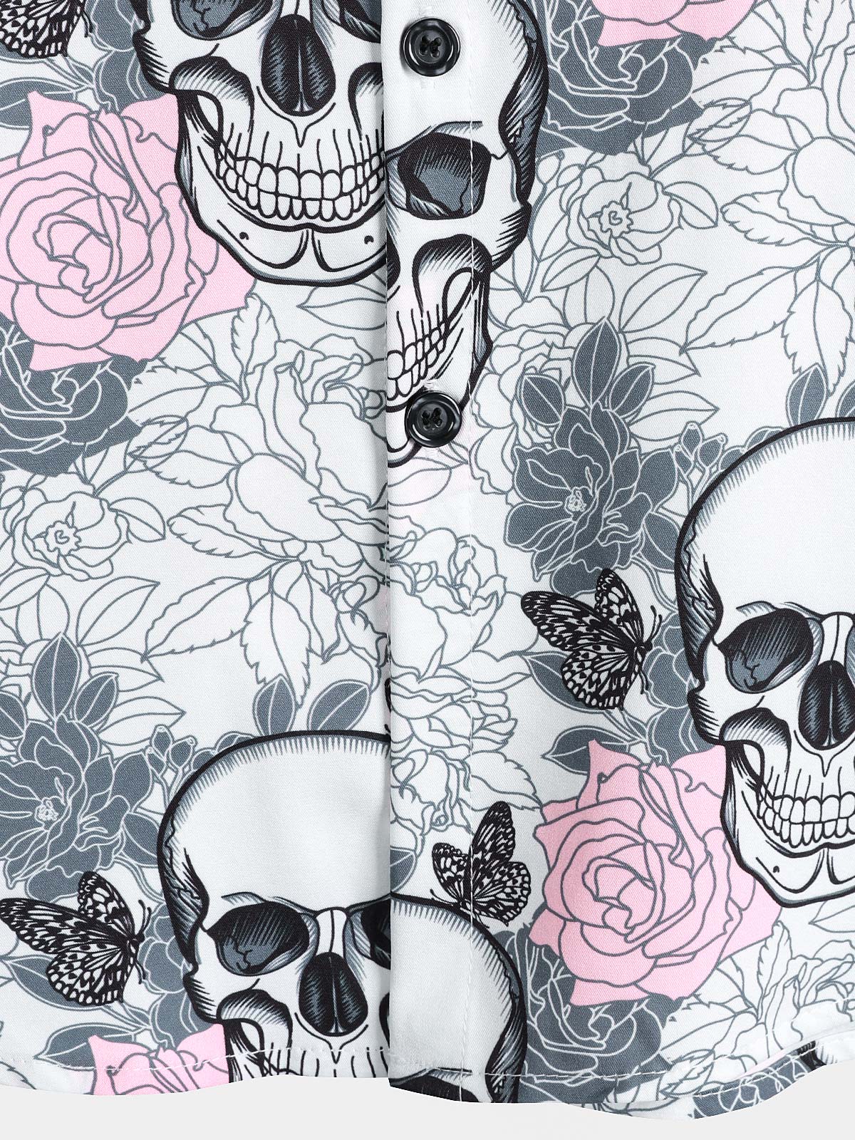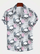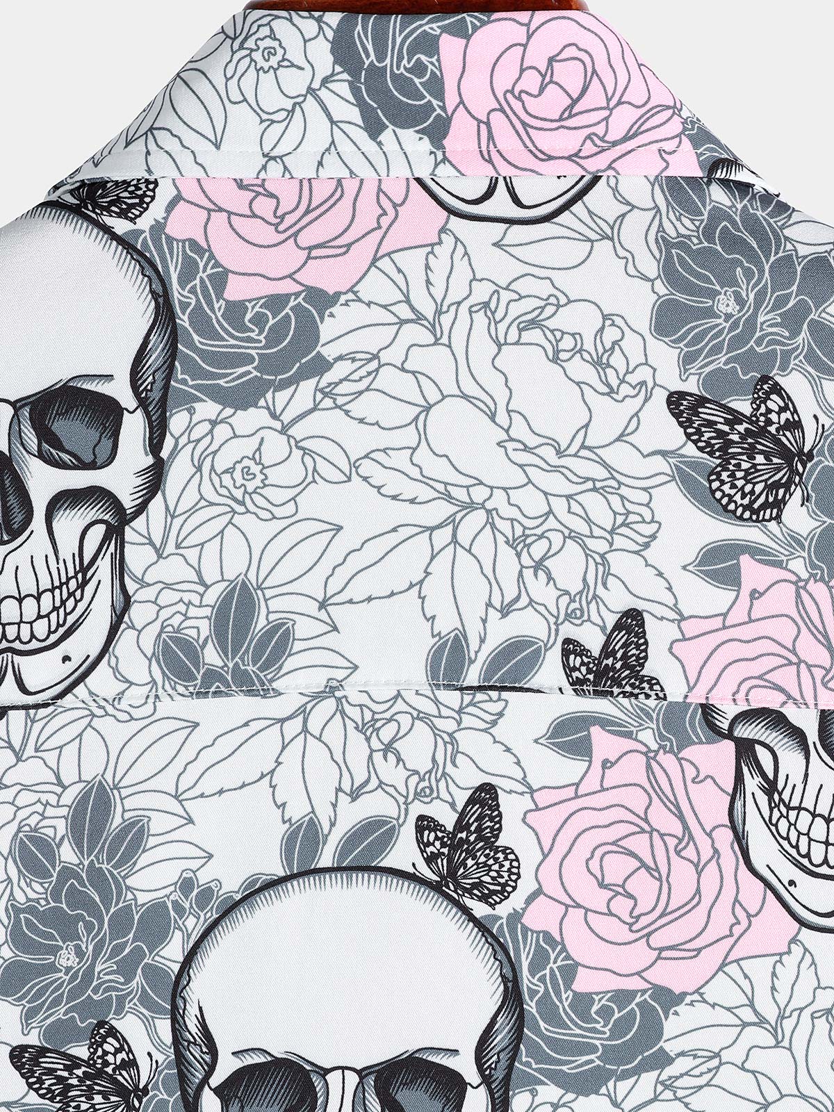 Men's Pink Flower Cool Skull Graphic Button Up Short Sleeve Punk Rock Art Shirt