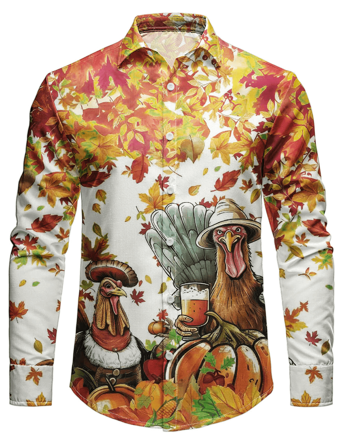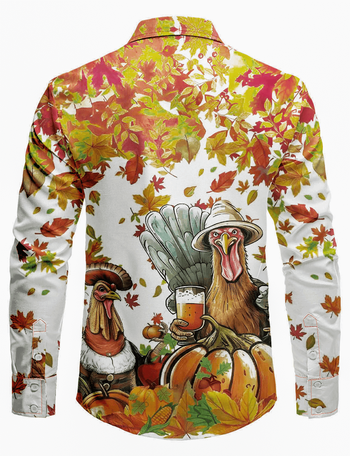 Men's Thanksgiving Beer Turkey Pumpkin Maple Leaf Print Long Sleeve Shirt