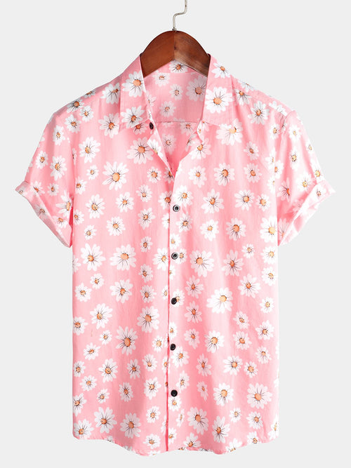 Men's Pink Floral Daisy Print Tropical Hawaii Cotton Shirt