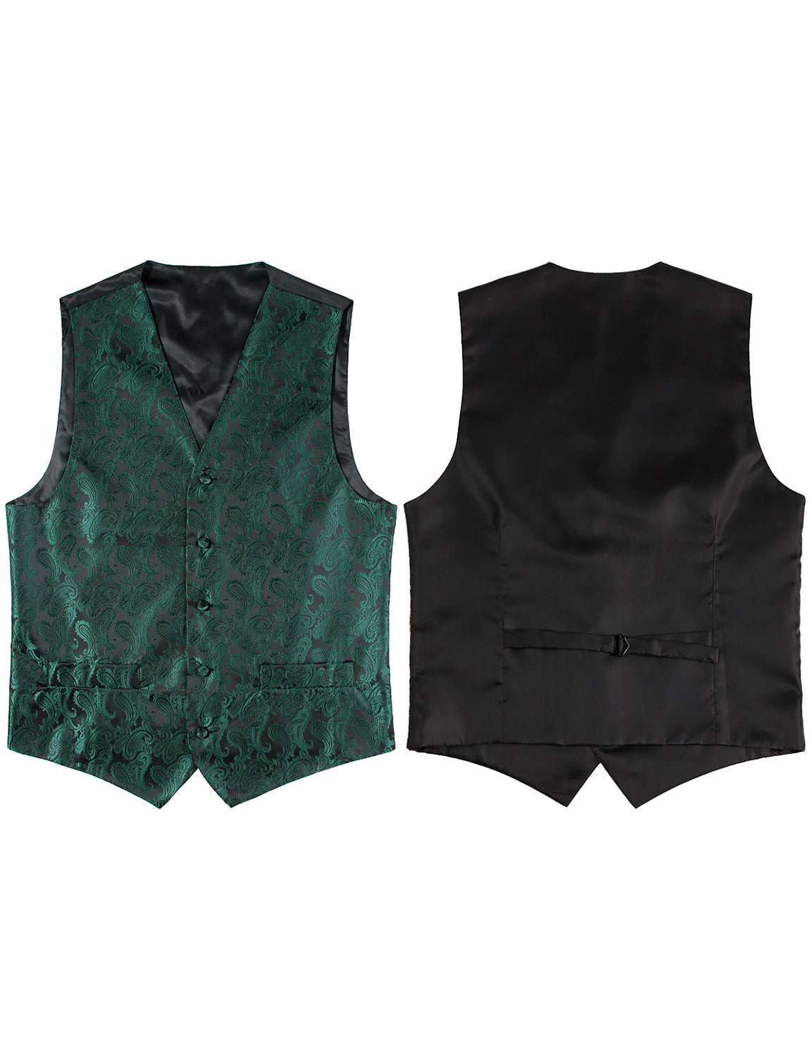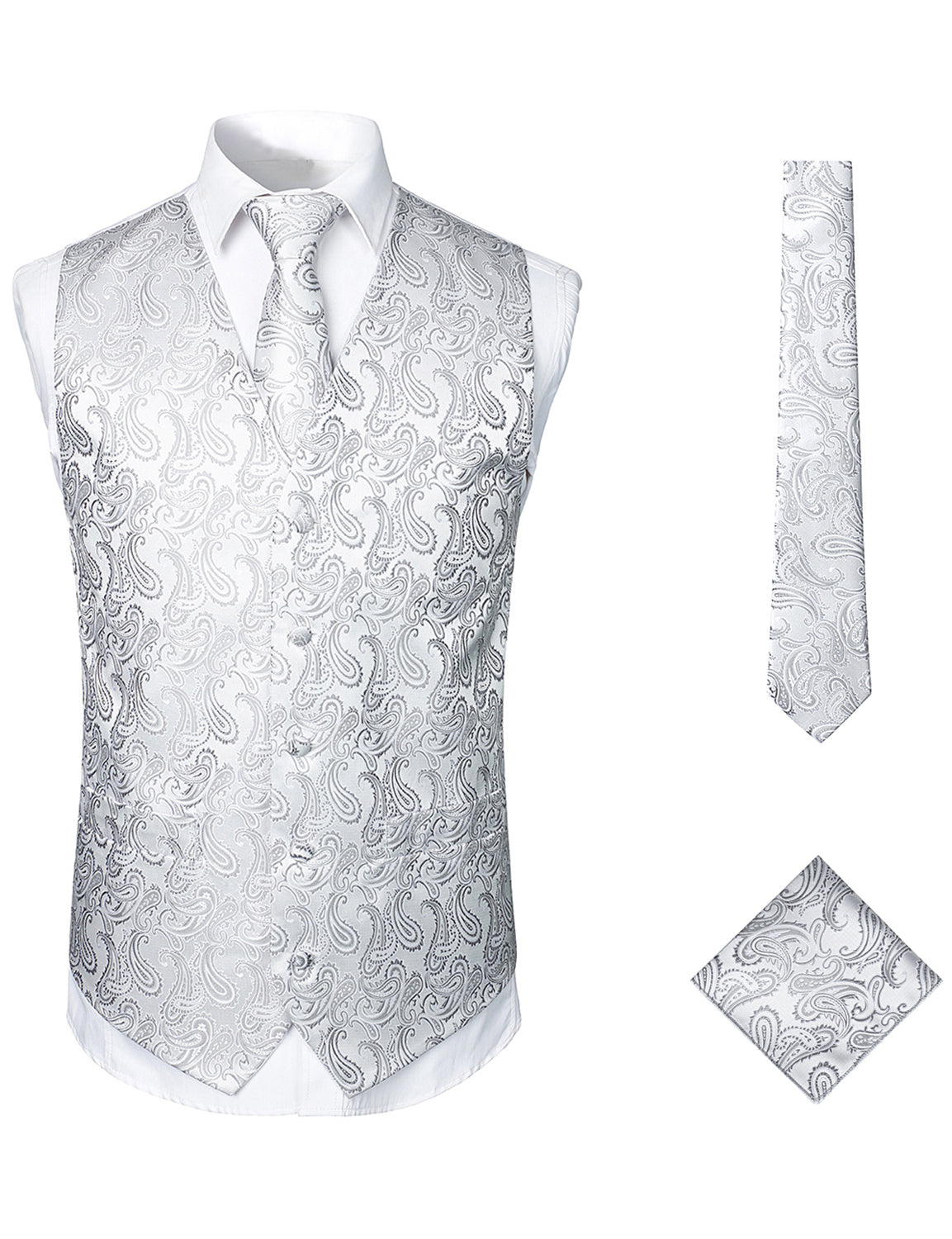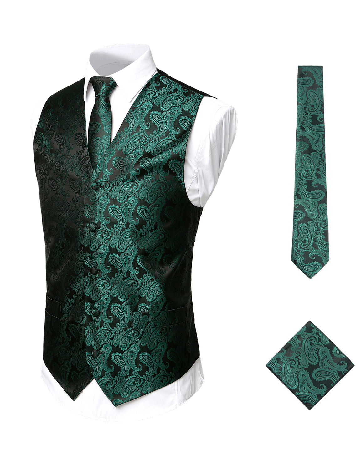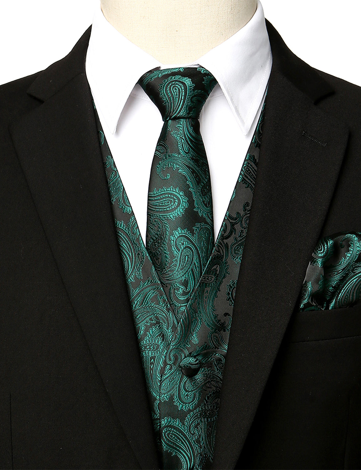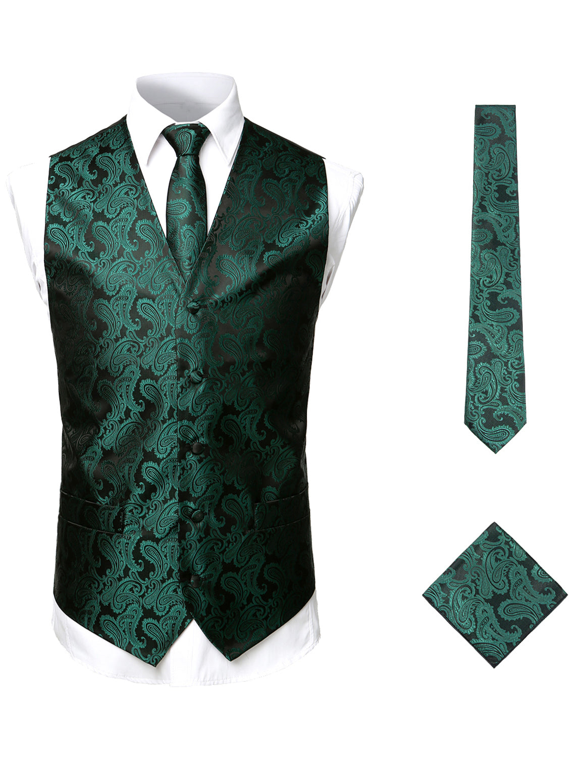 Men's 3pc Jacquard Paisley Vest & Tie Set Classic Necktie Pocket Square Waistcoat for Suit or Tuxedo